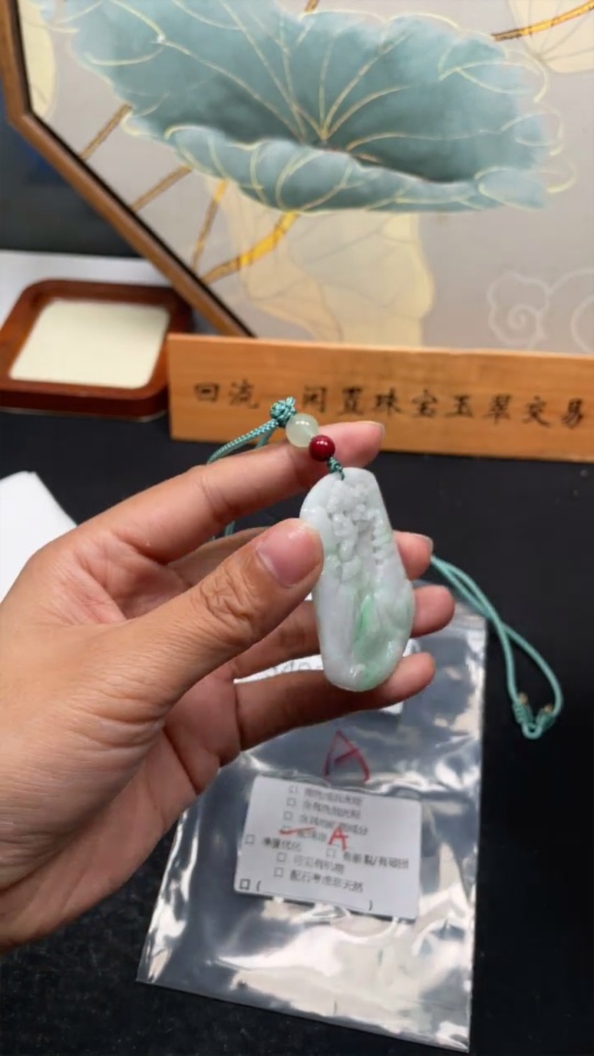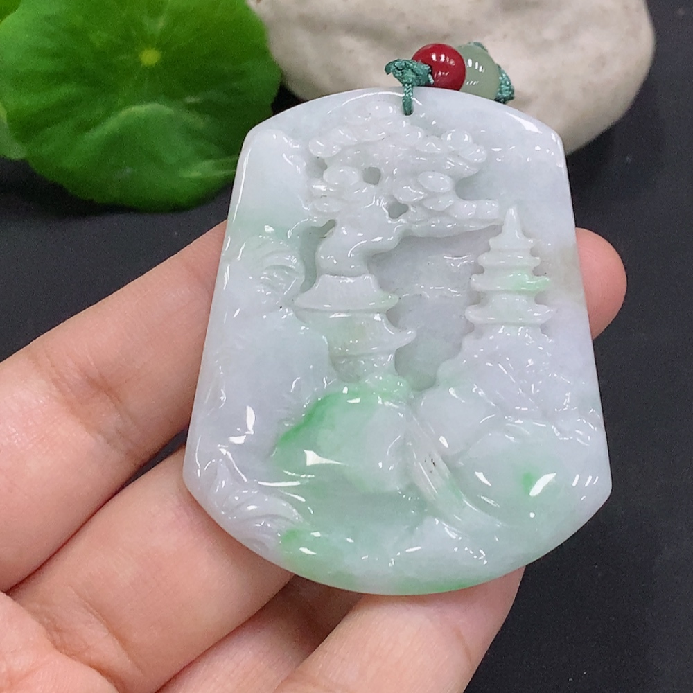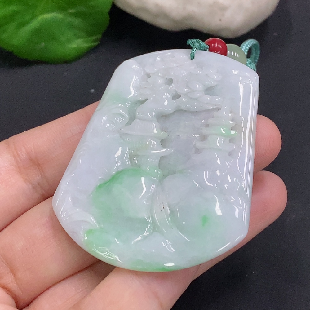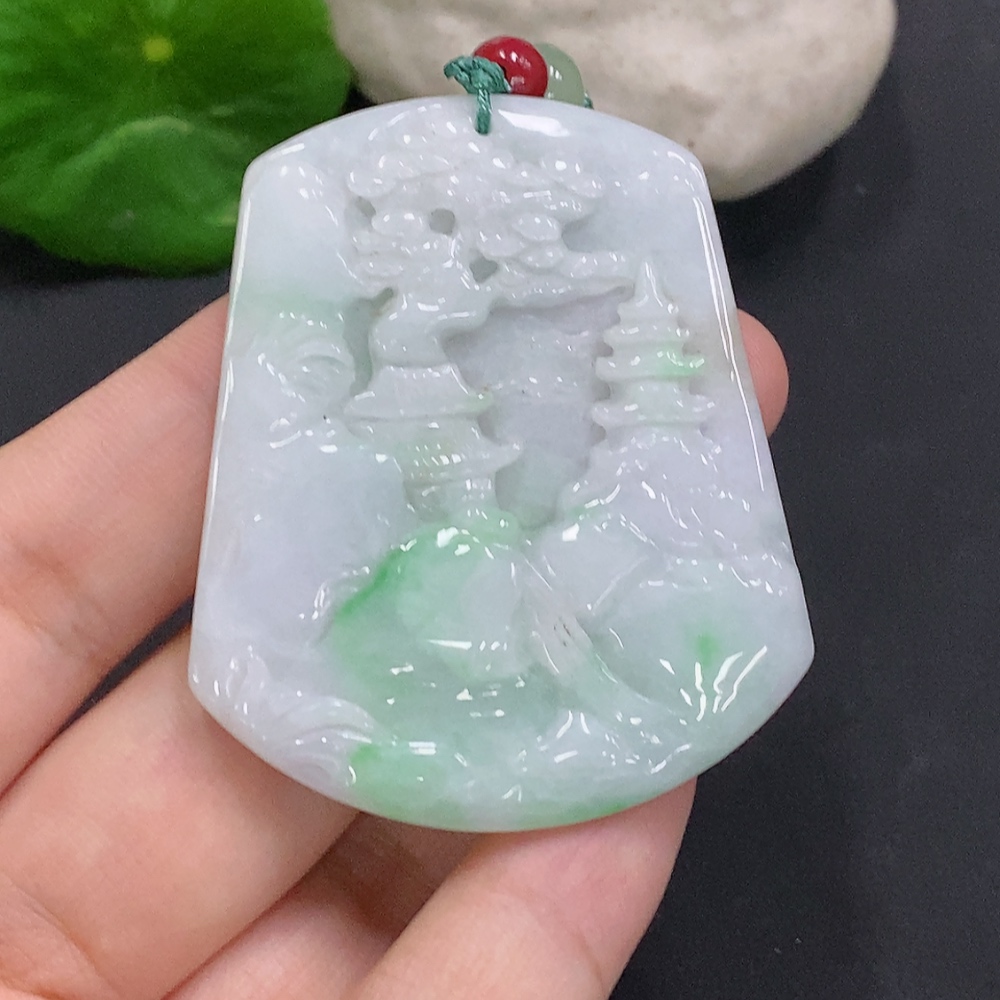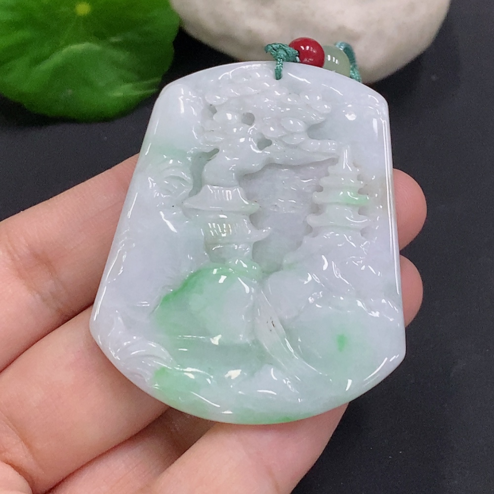Jadeite Landscape Pendant with Cord Total Weight Approx. 25.7g (Matching Beads Non-Grade A)