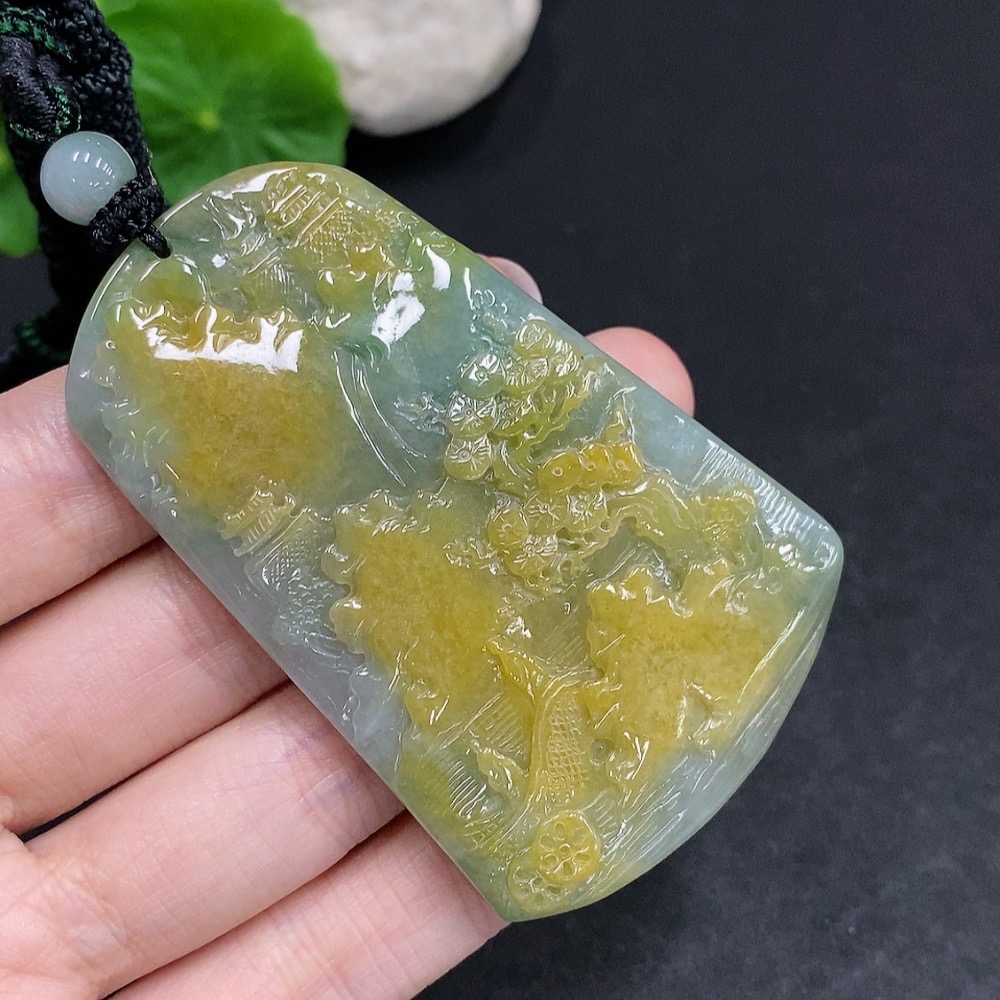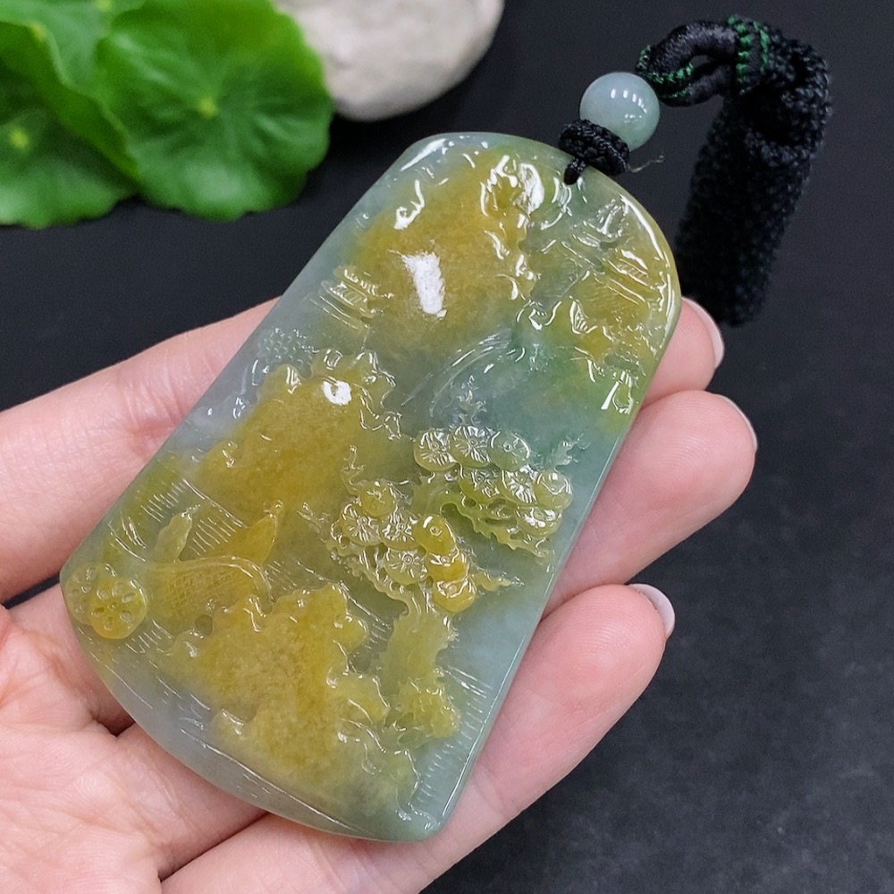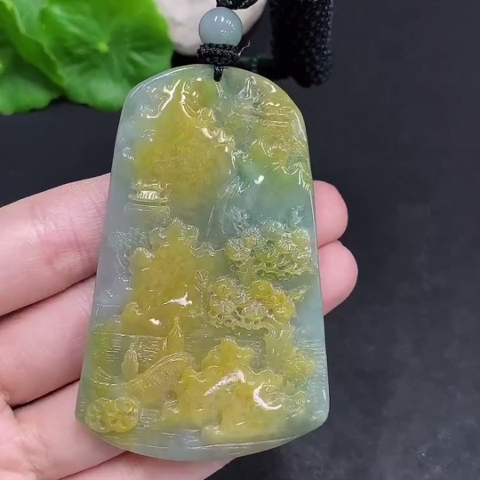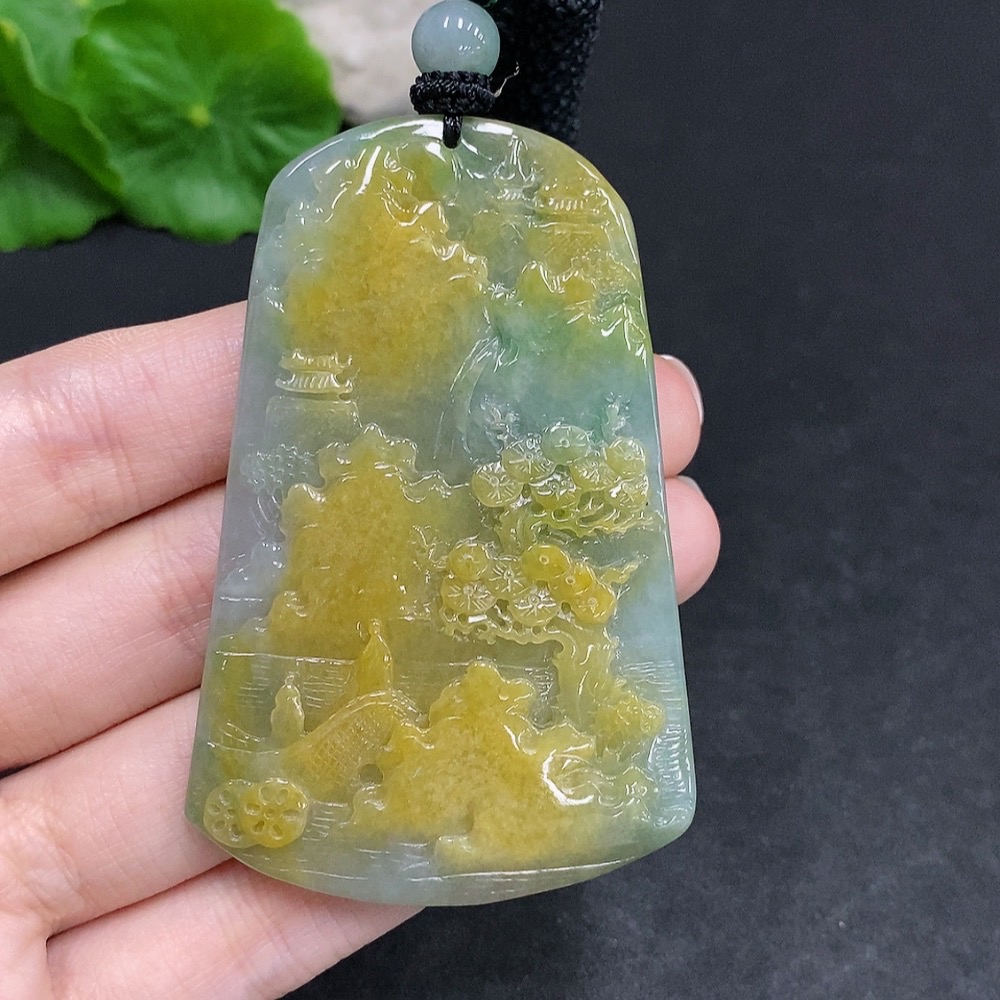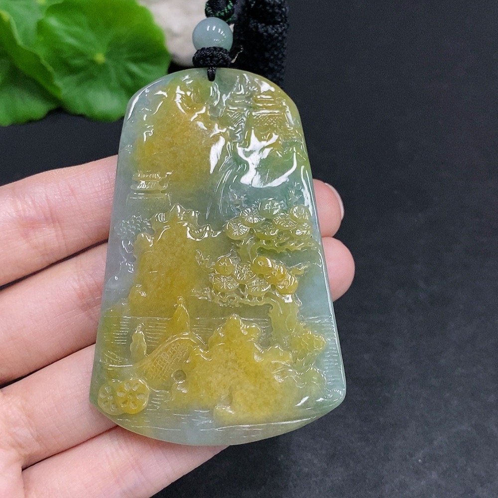Jadeite Landscape Pendant Total Weight Approx. 54.1g (Including Cord) Yellow Color Origin Undetermined