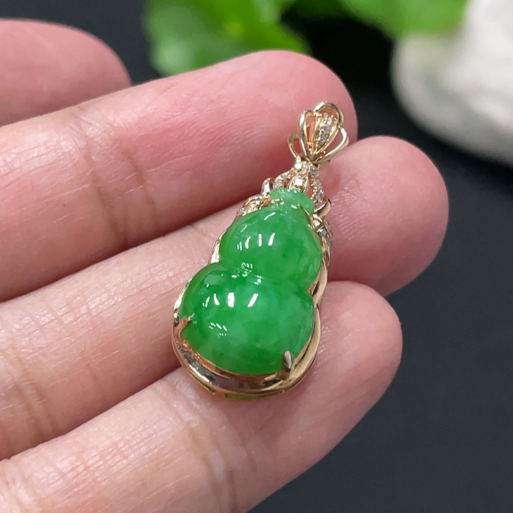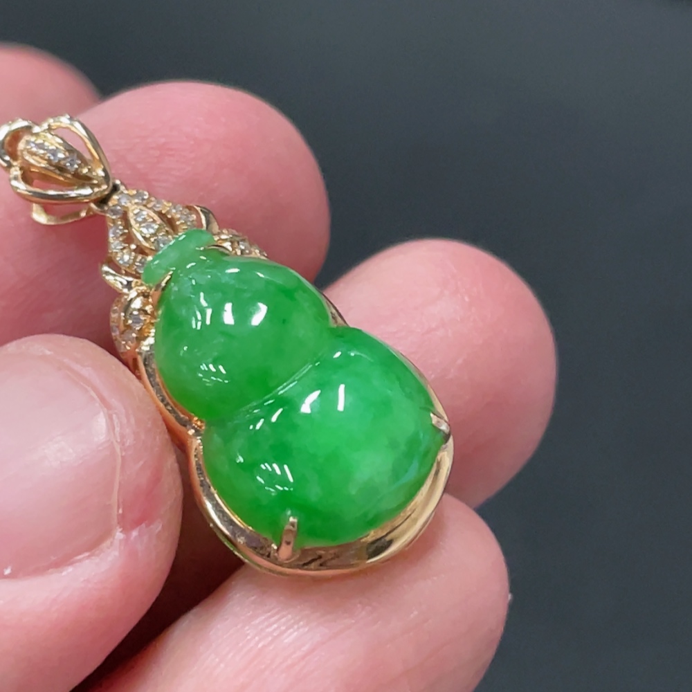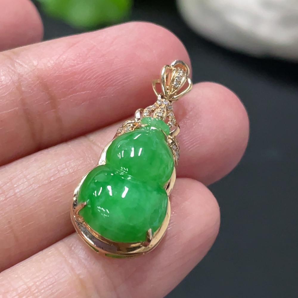 Jadeite Inlaid Calabash Pendant with 18k Gold and Diamond Accents, Total Weight Approximately 2.33g