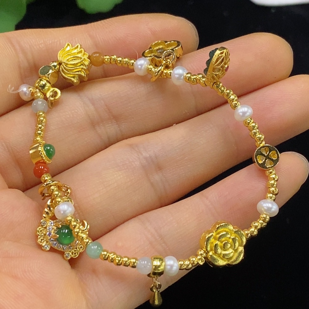 Jadeite Inlaid Bracelet Total Weight Approx. 7.56g Red Beads Non-A Unmarked Surface Tested Gold Content Small Beads AU99% Marked Red Non-Gold Others Non-Gold Yellow Parts Color Origin Undetermined Matching Beads Non-A Gold Fragile