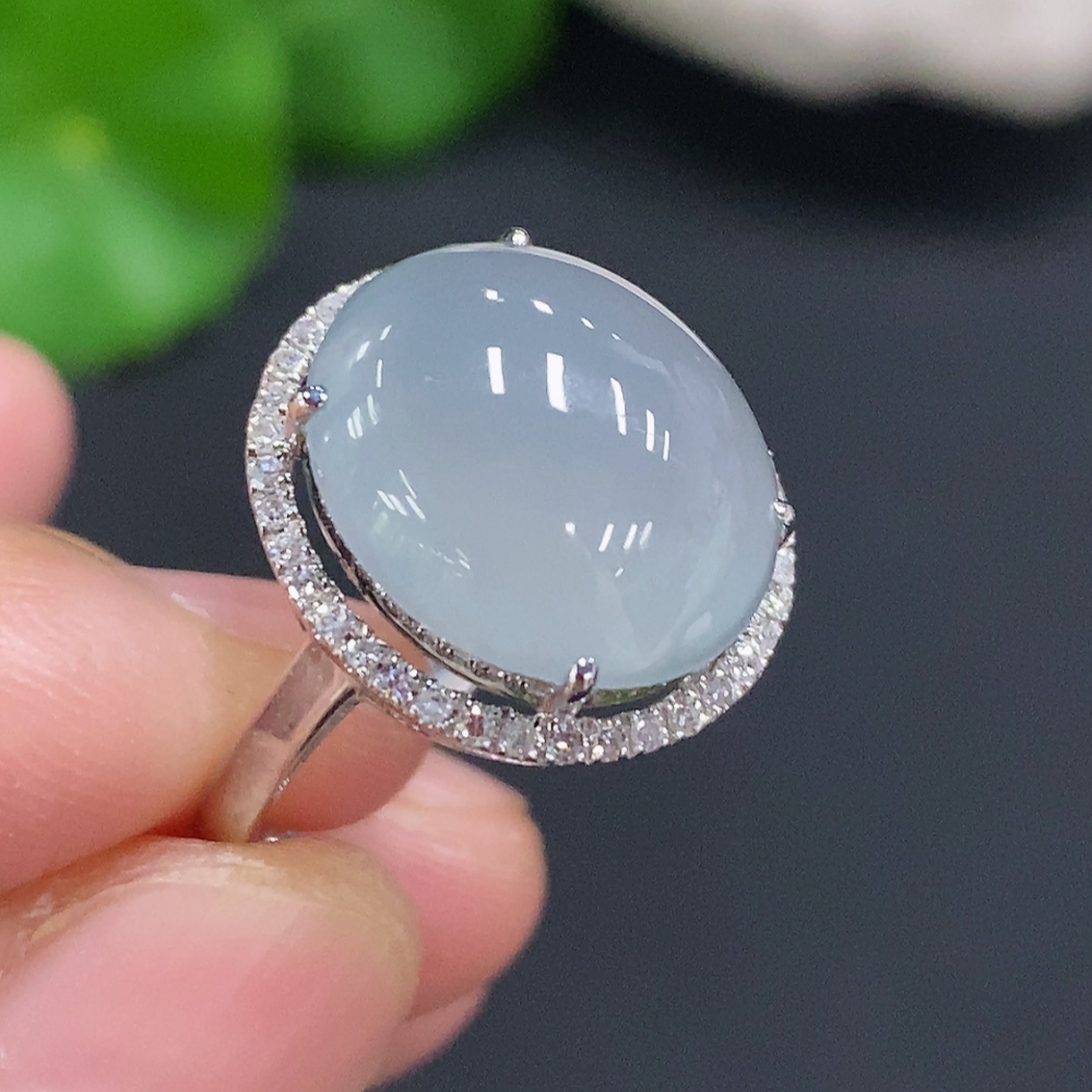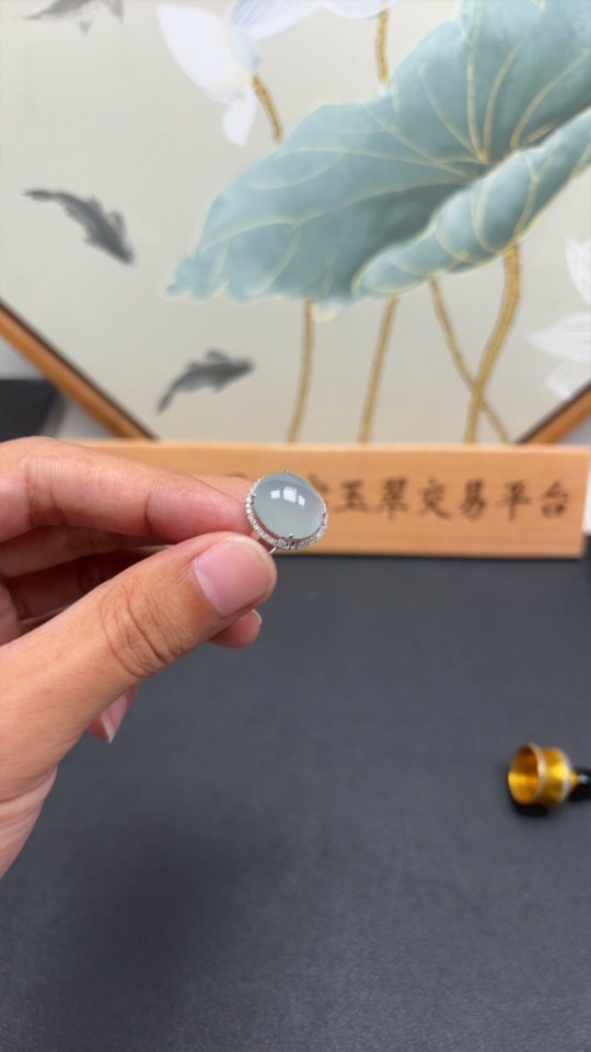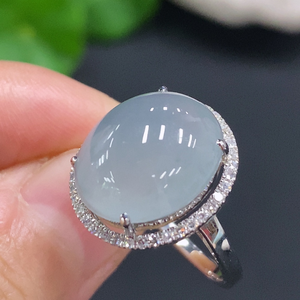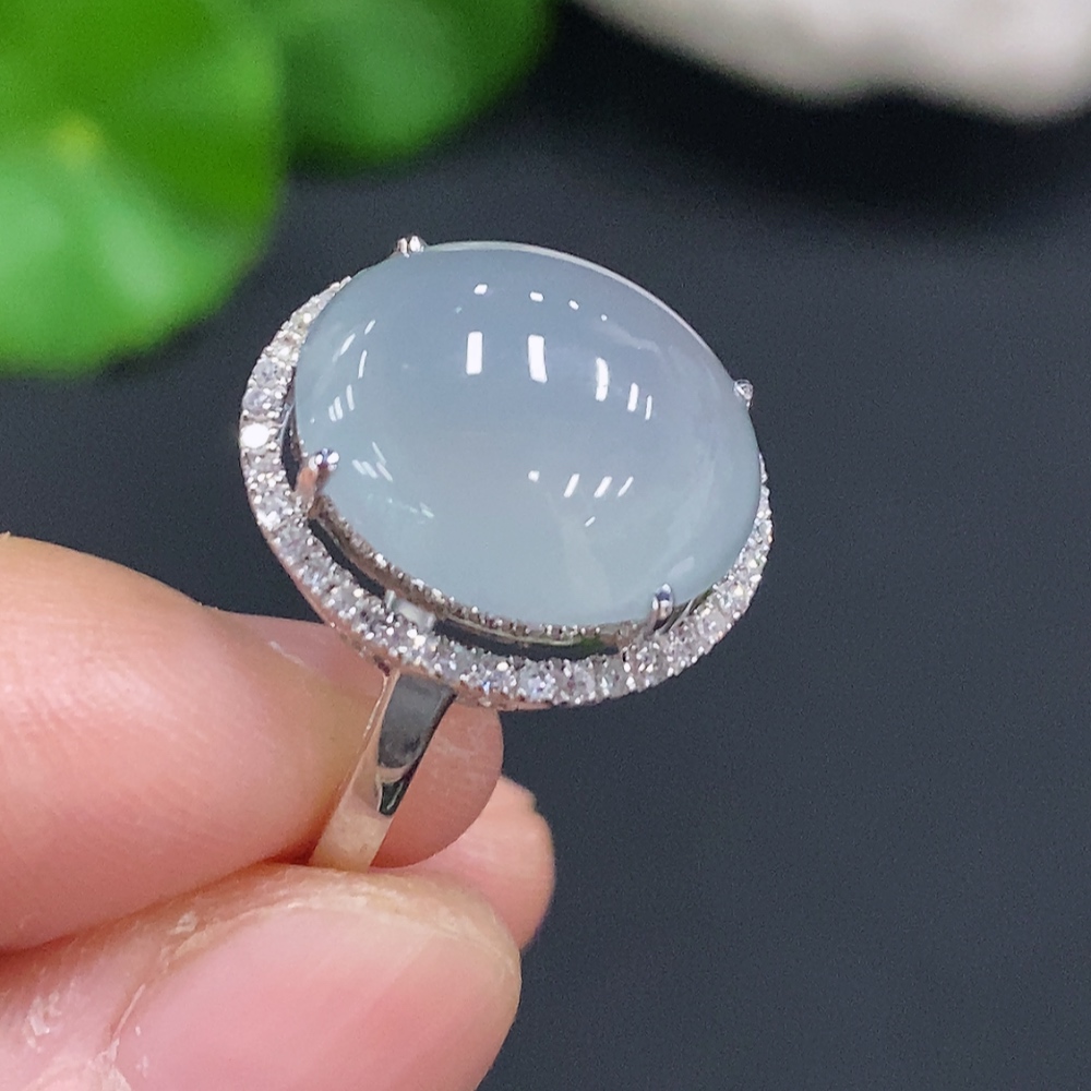 Jadeite Cabochon Inlaid Ring 18K Gold Size 14 Total Weight Approx. 4.9g (With Diamond Accents)