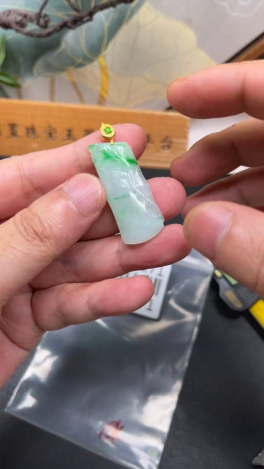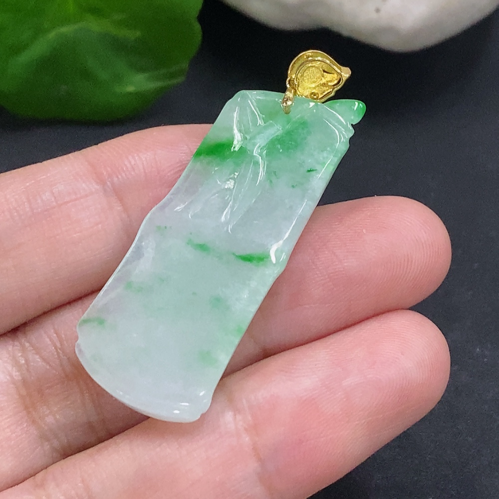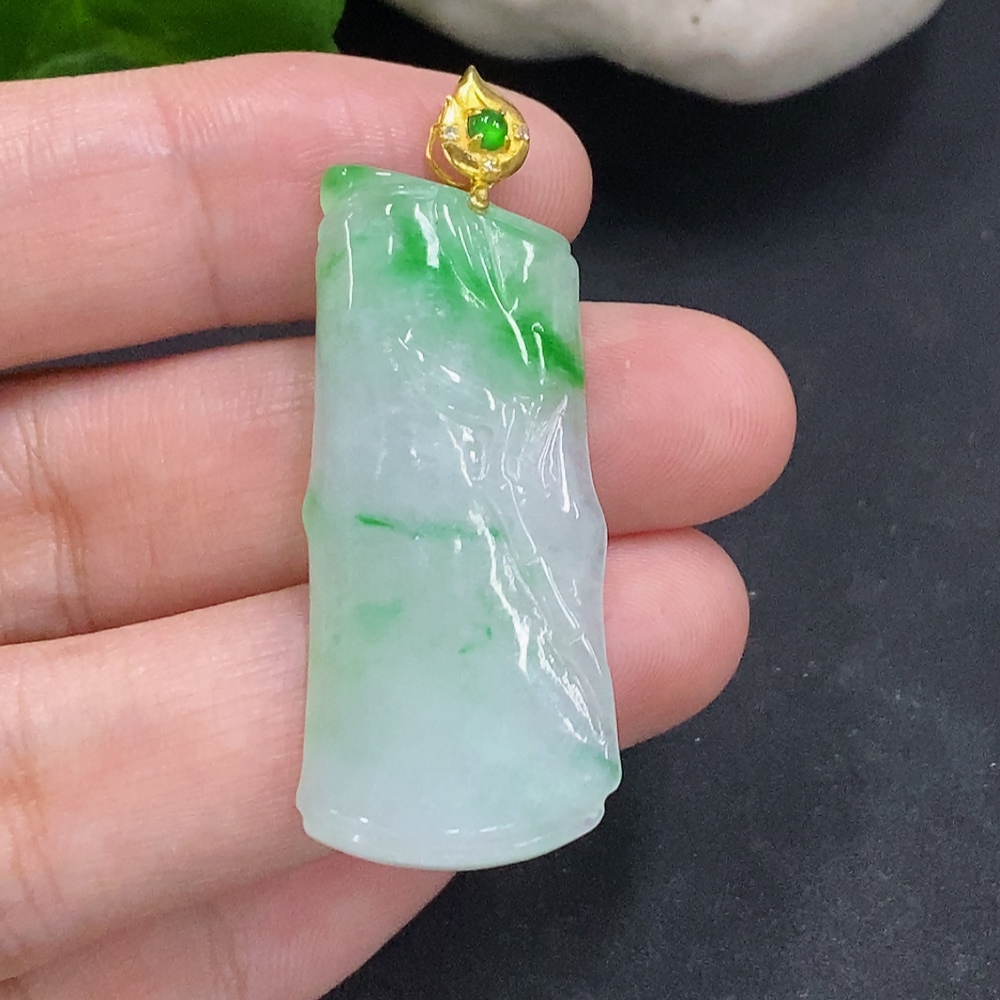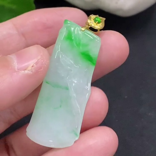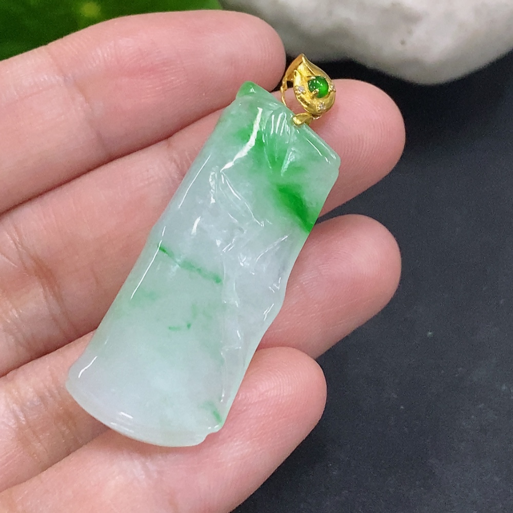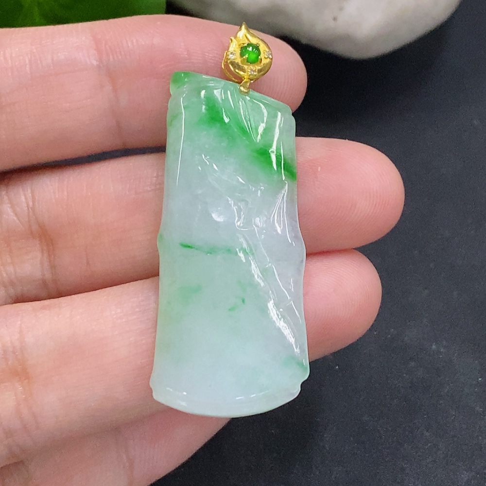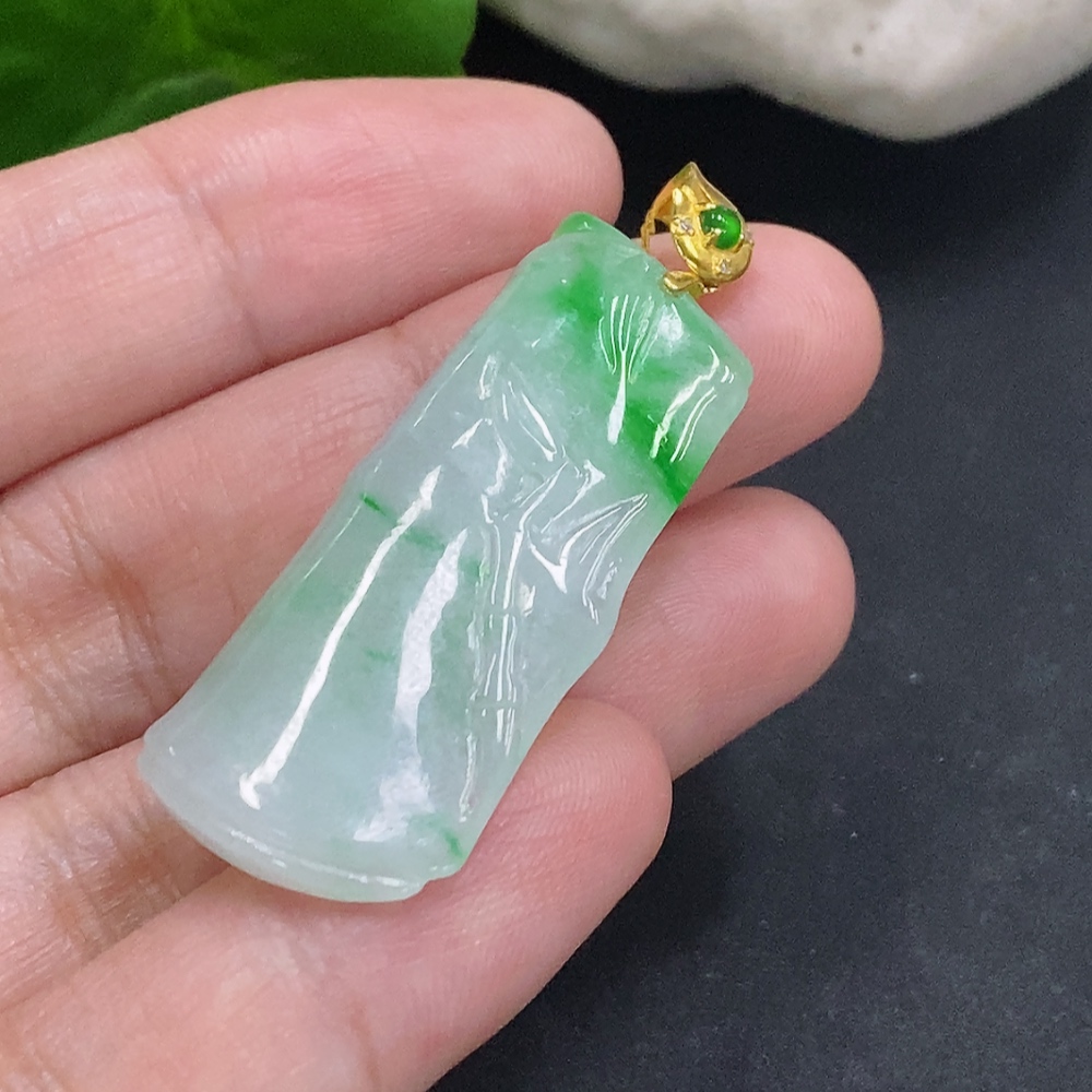 Jadeite Bamboo Pendant with 18K Gold Clasp, Total Weight Approximately 7.1g