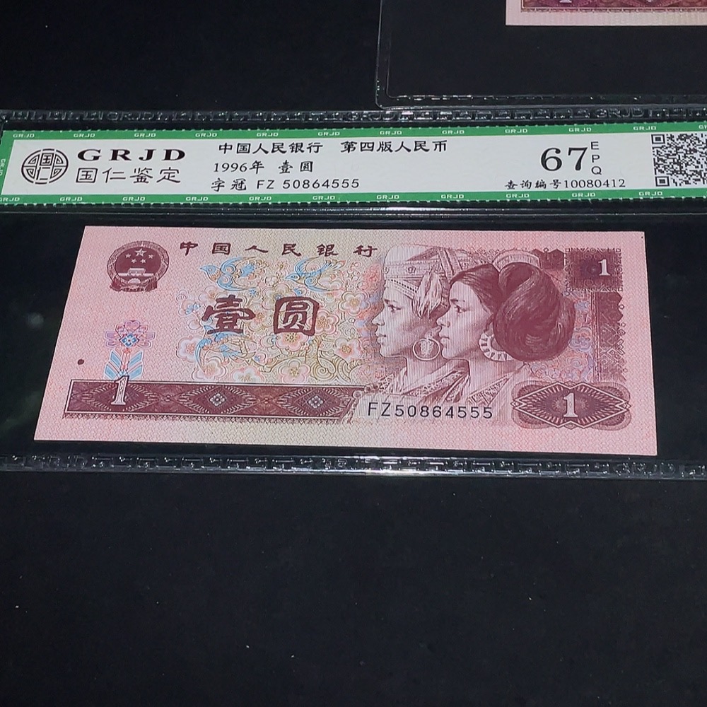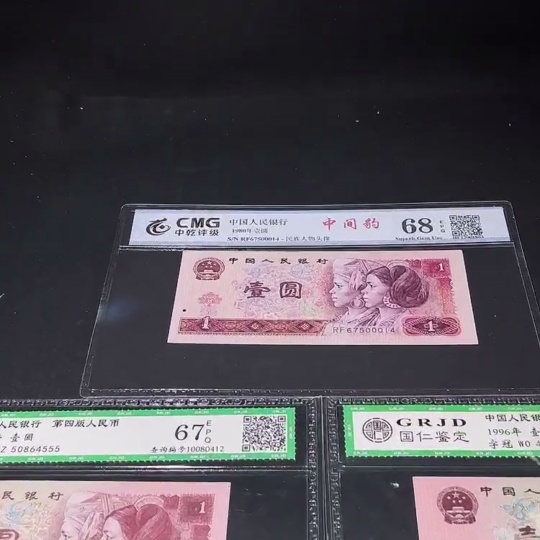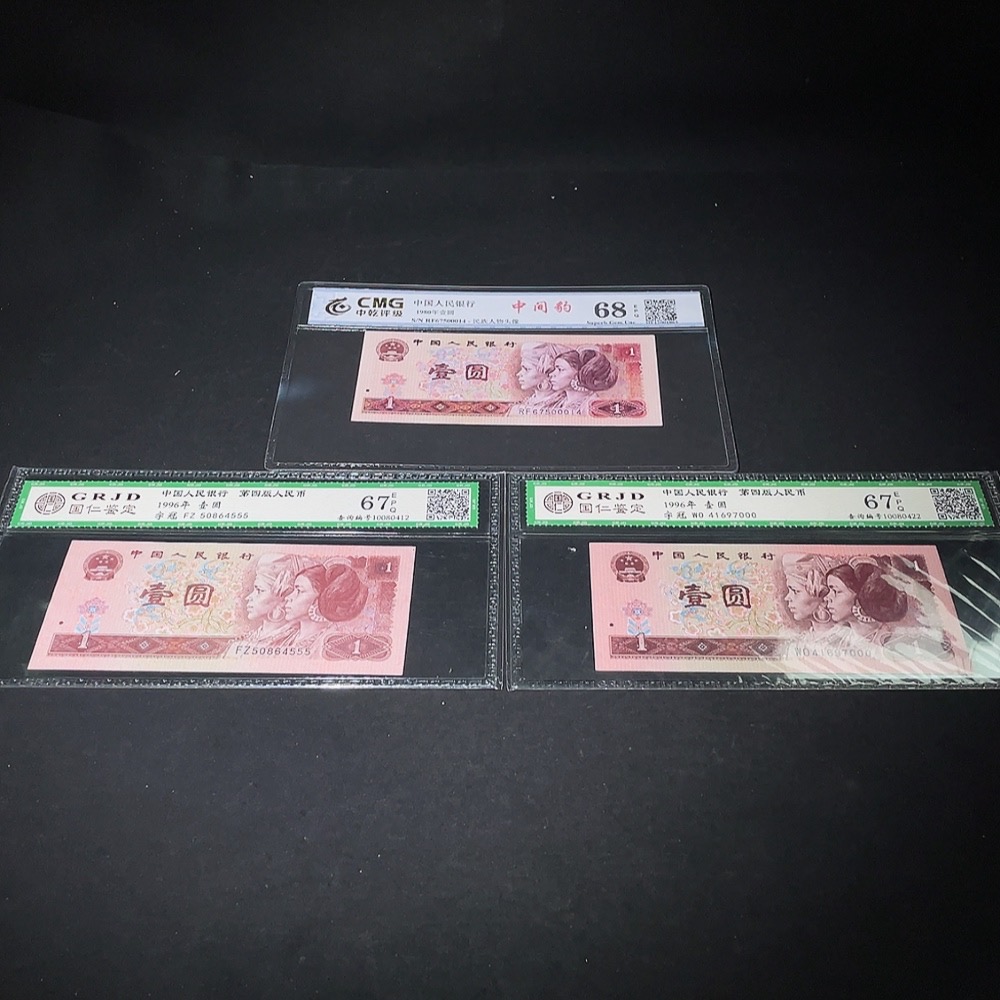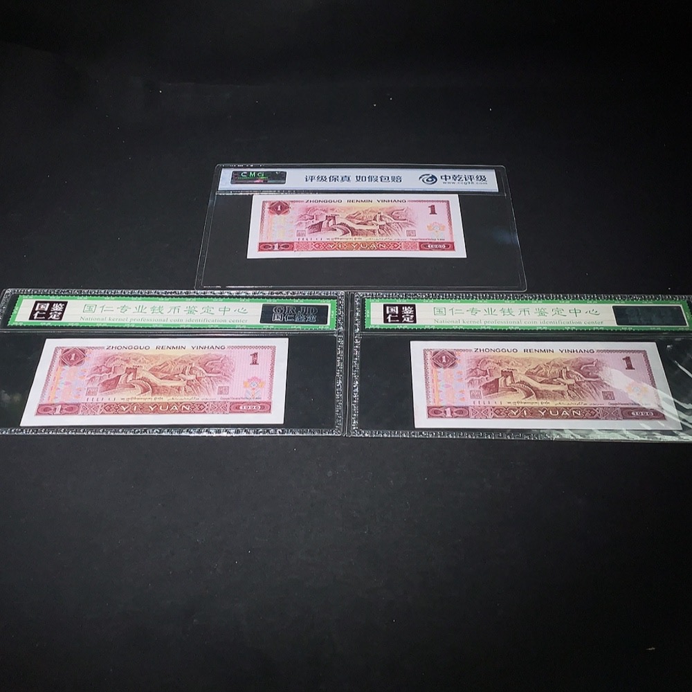 Three Graded Fourth Edition One Yuan Banknotes with Leopard Serial Numbers