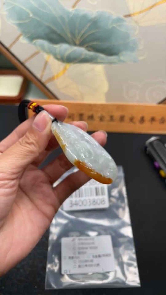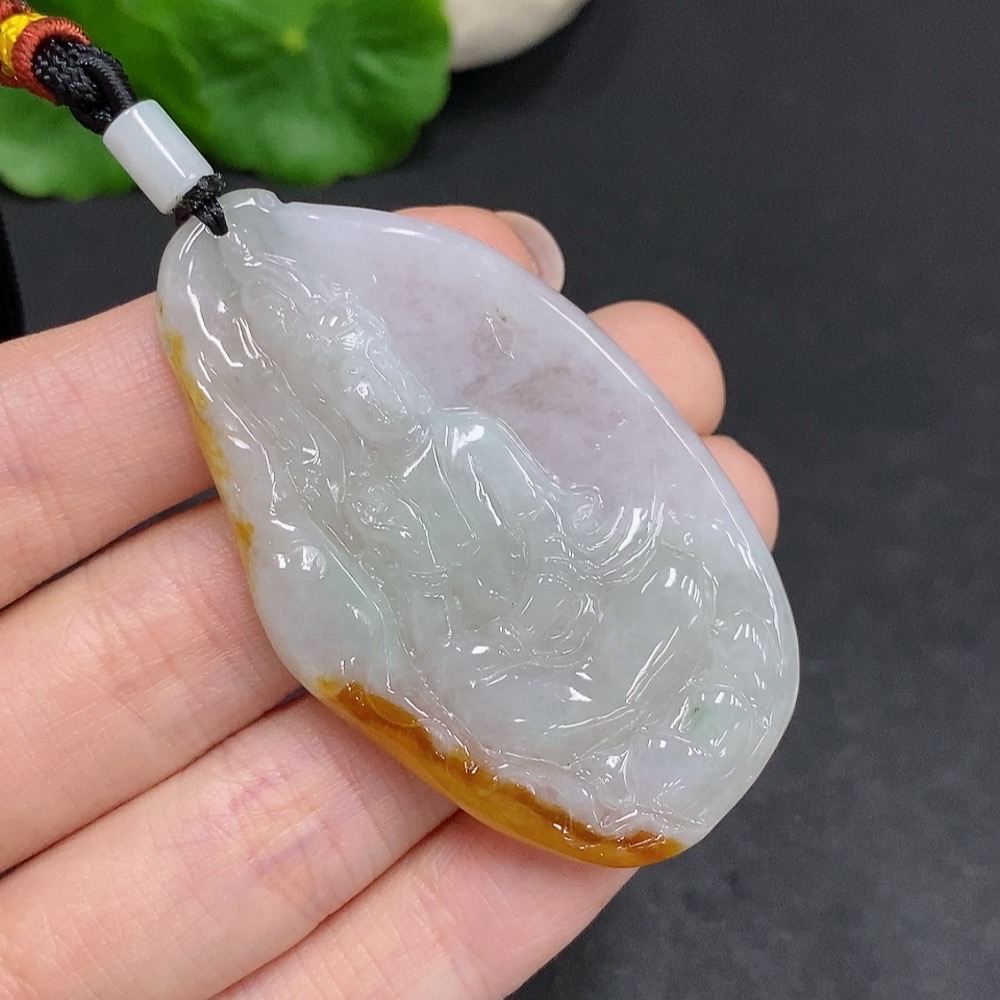 Jadeite Guanyin Pendant Total Weight Approx. 23.9g (Including Rope Weight) Yellow Part Color Origin Undetermined