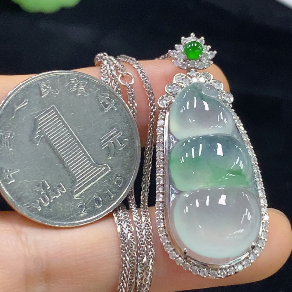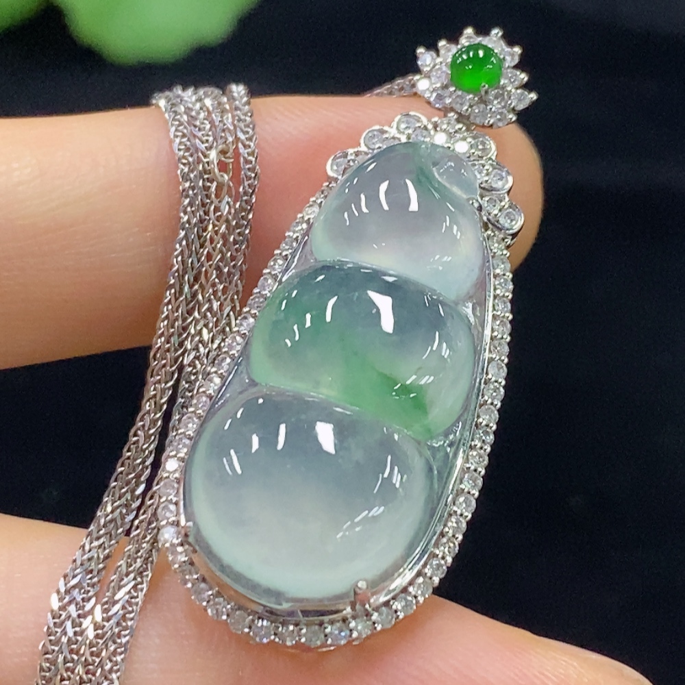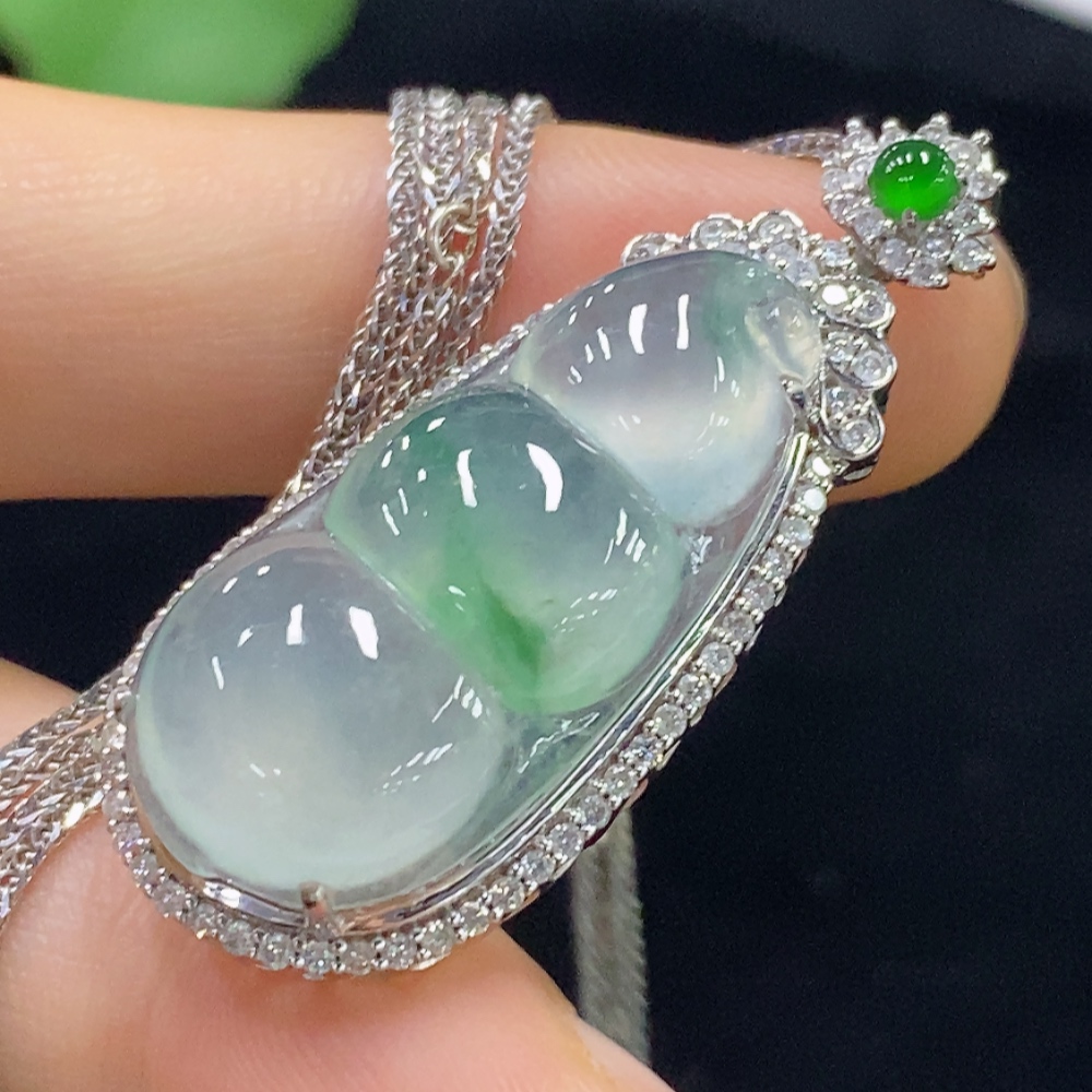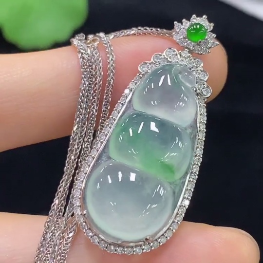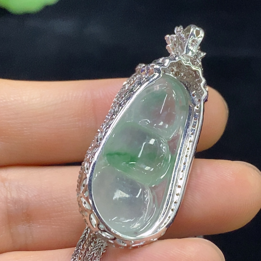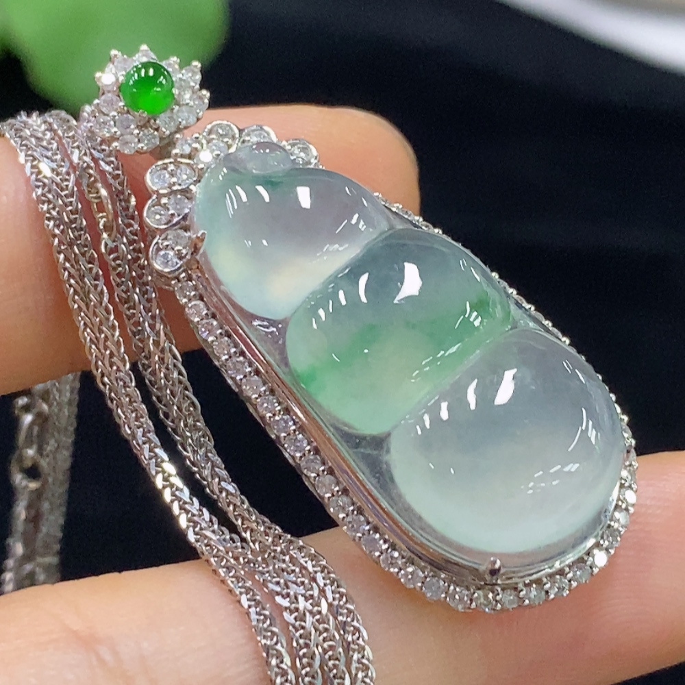 Jadeite Bean Inlay Piece with 18K Gold and Diamond Accents, Including Chain, Total Weight Approx. 10.35g