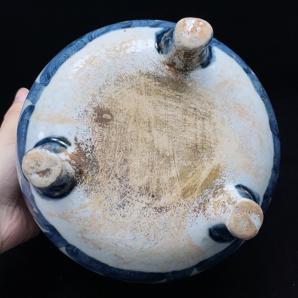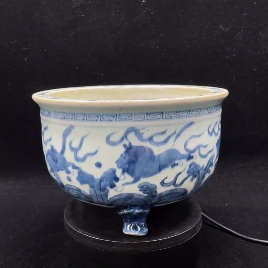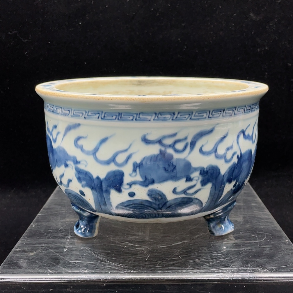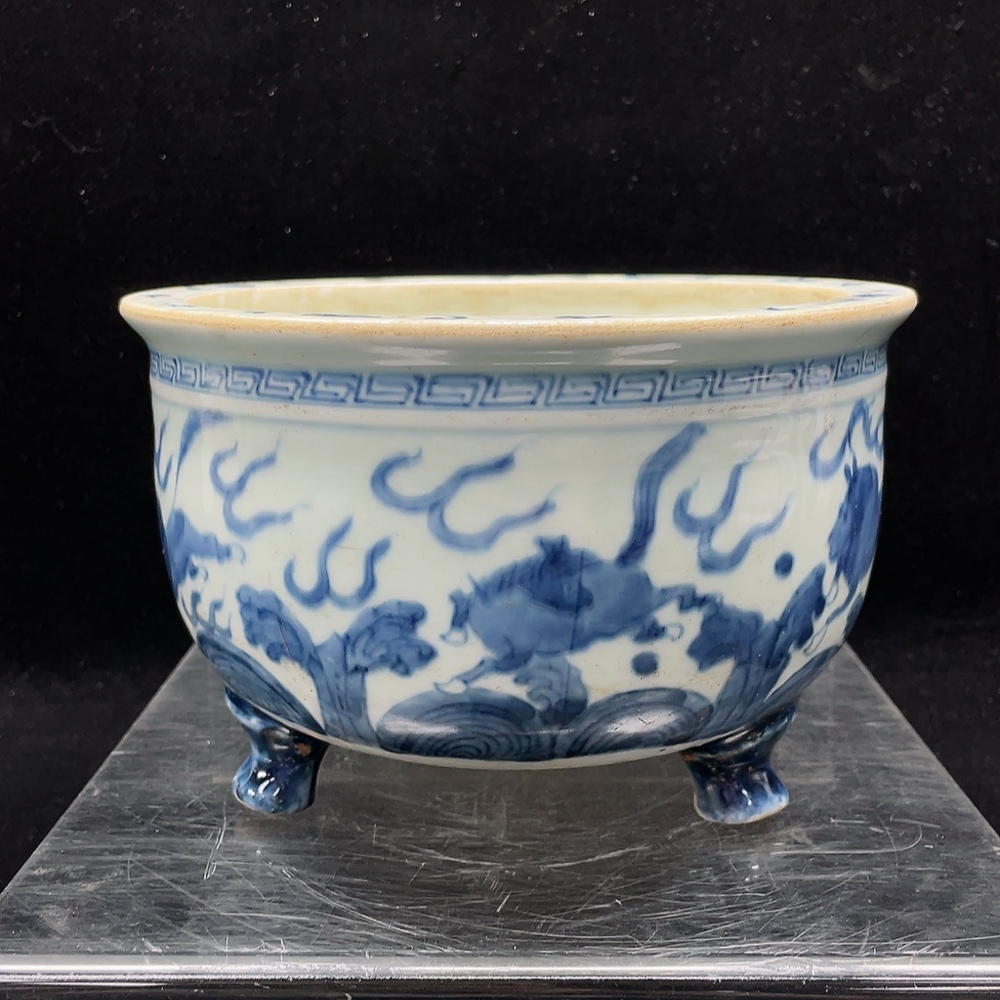Porcelain, intact, blue-and-white sea horse pattern tripod incense burner, size as per actual item
