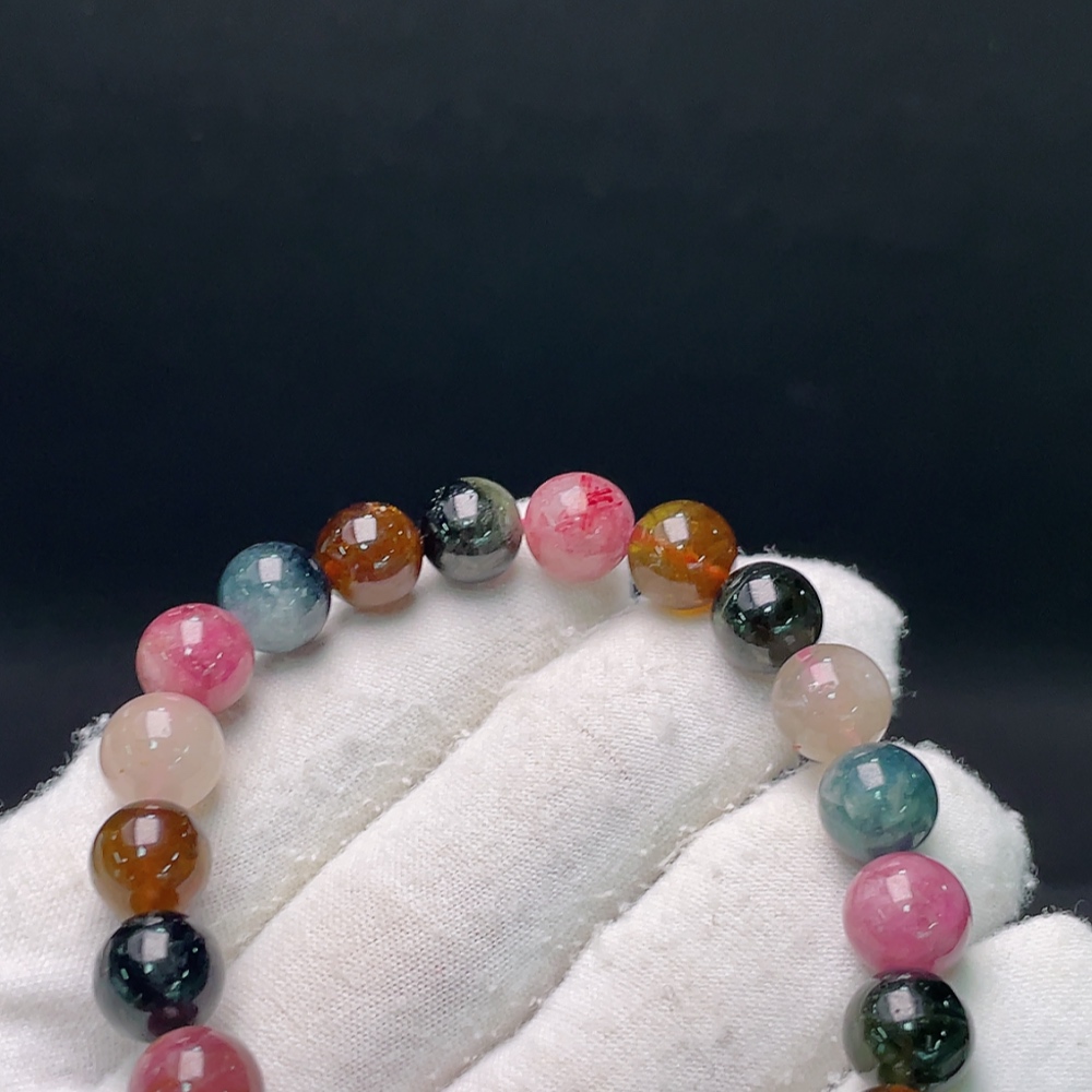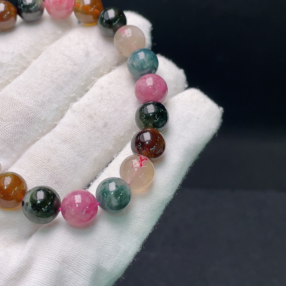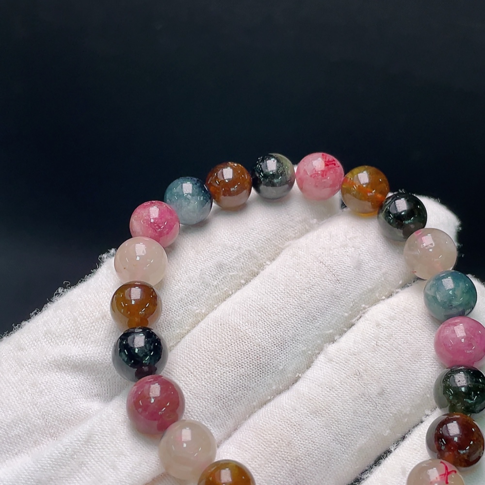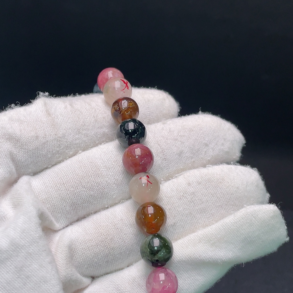 Tourmaline bracelet with visible organic inclusions, approx. 23.83g total weight, 9mm beads (mixed stones)
