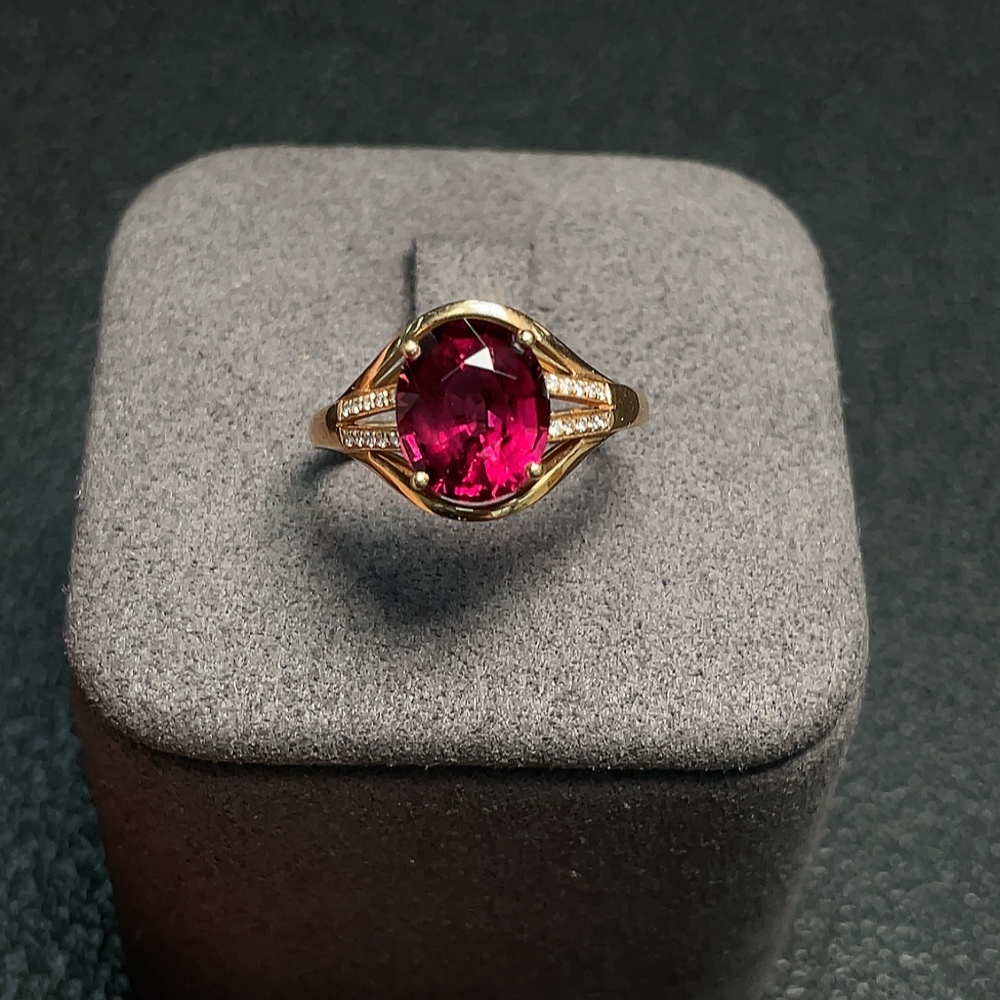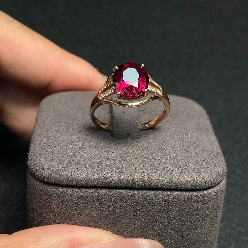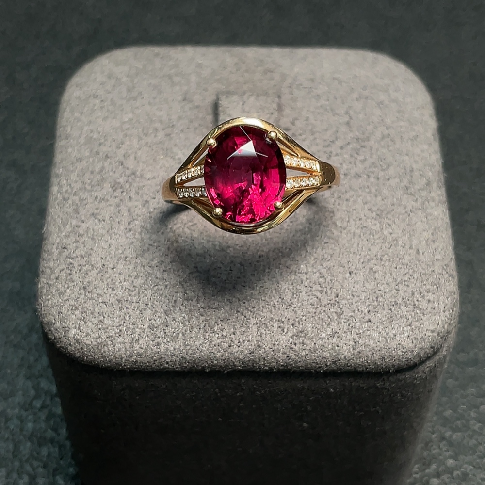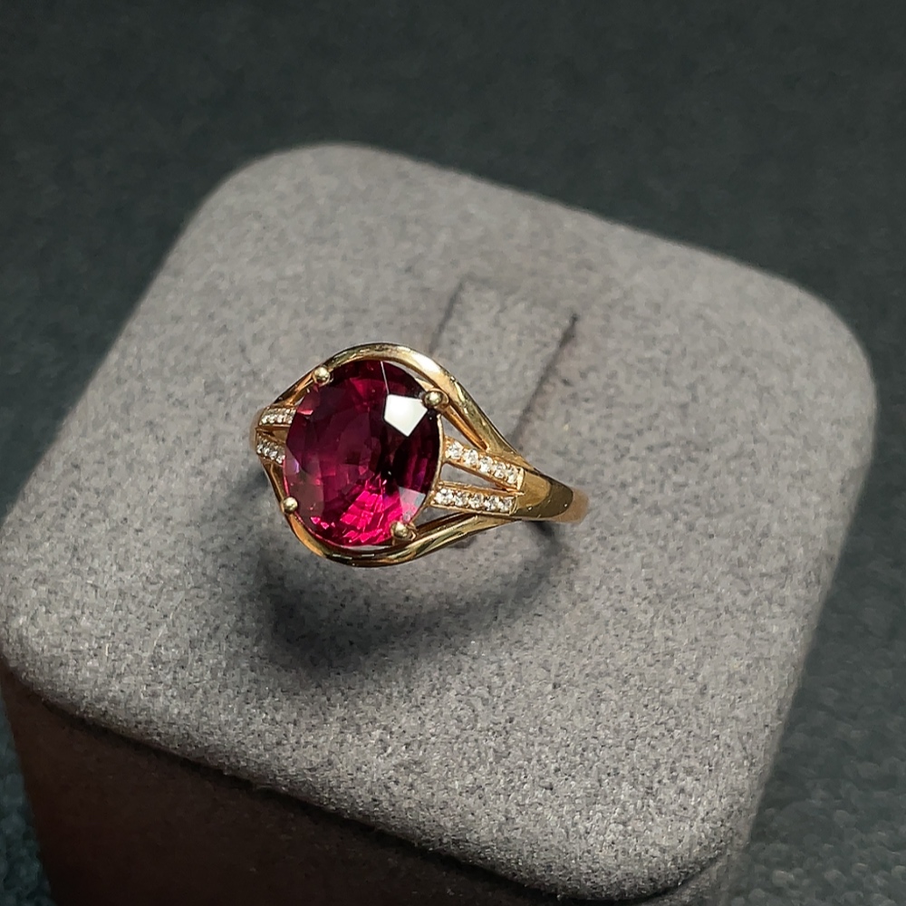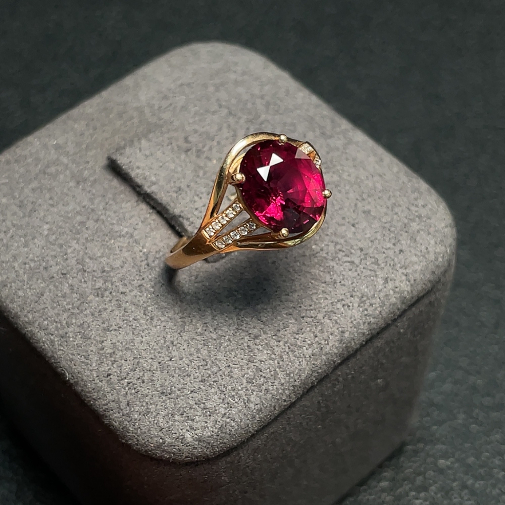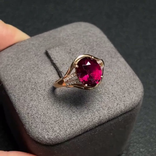 Garnet ring with diamond accents, 74% gold content, total weight approx. 2.91g, size 14, stone 9.1*7.6mm