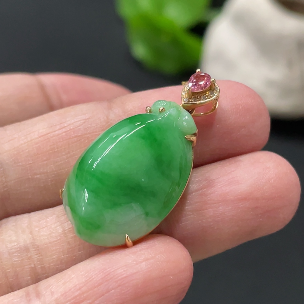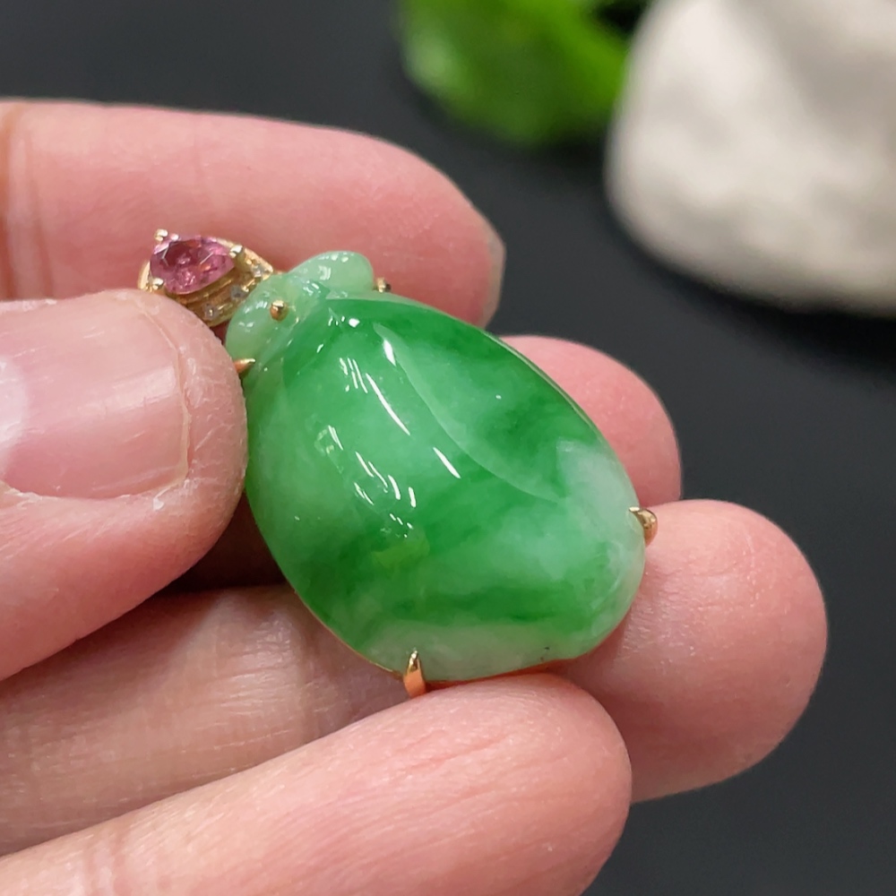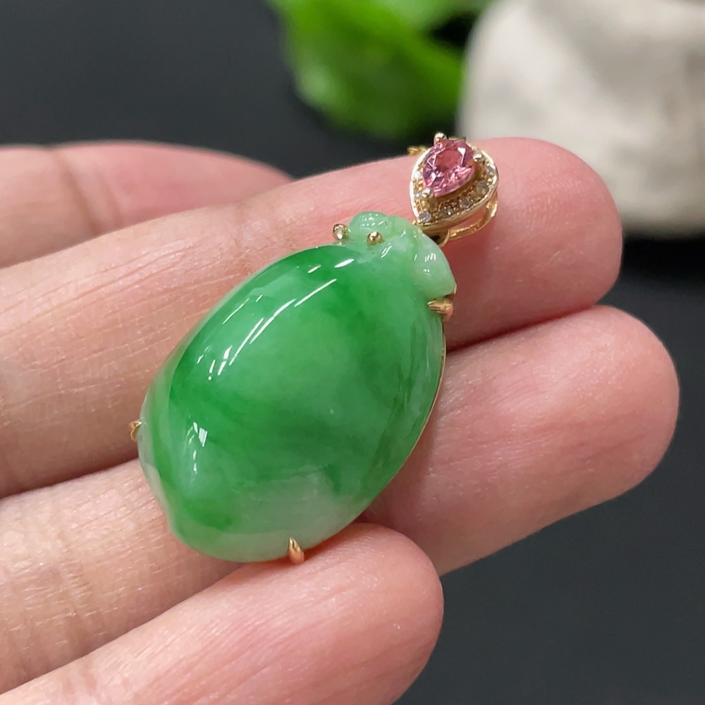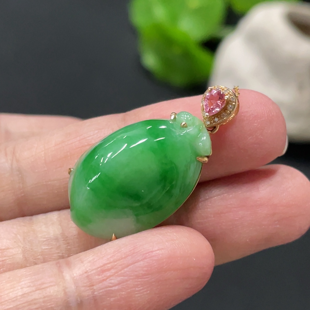 Jadeite Peach-Inlaid Pendant with 18k Gold Chain and Body, Total Weight Approx. 6.3g, Accented with Diamonds