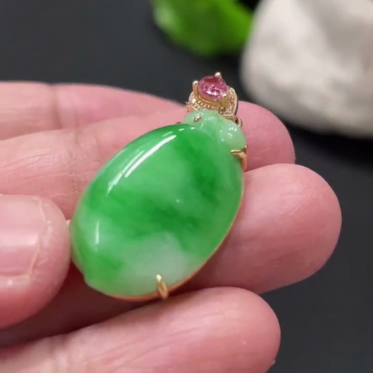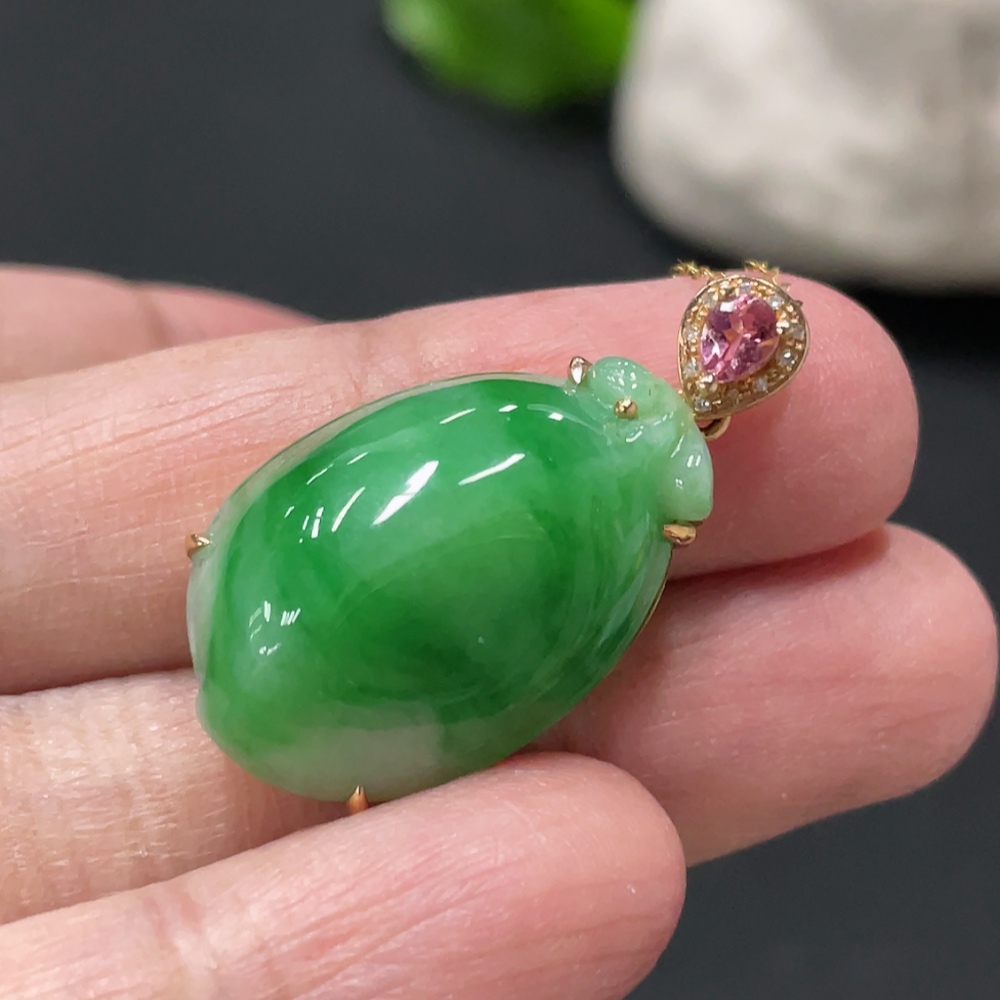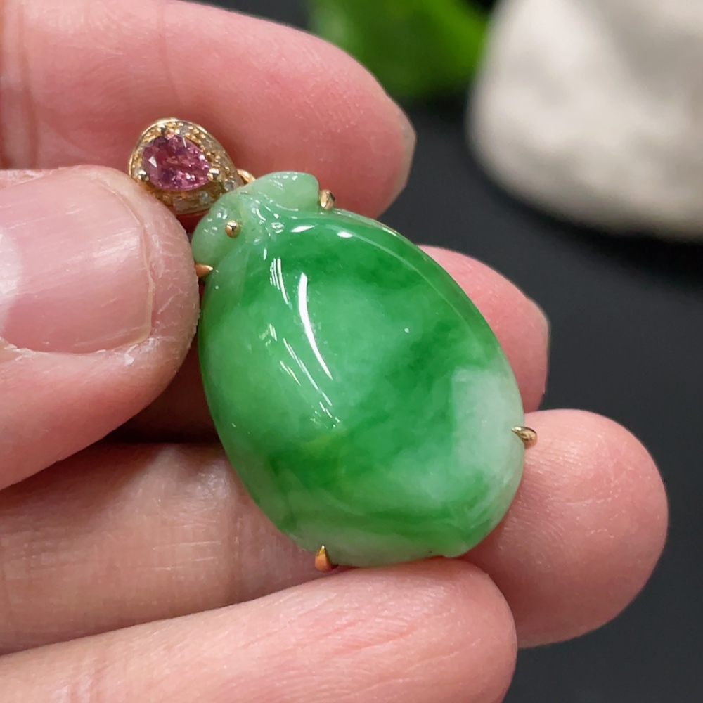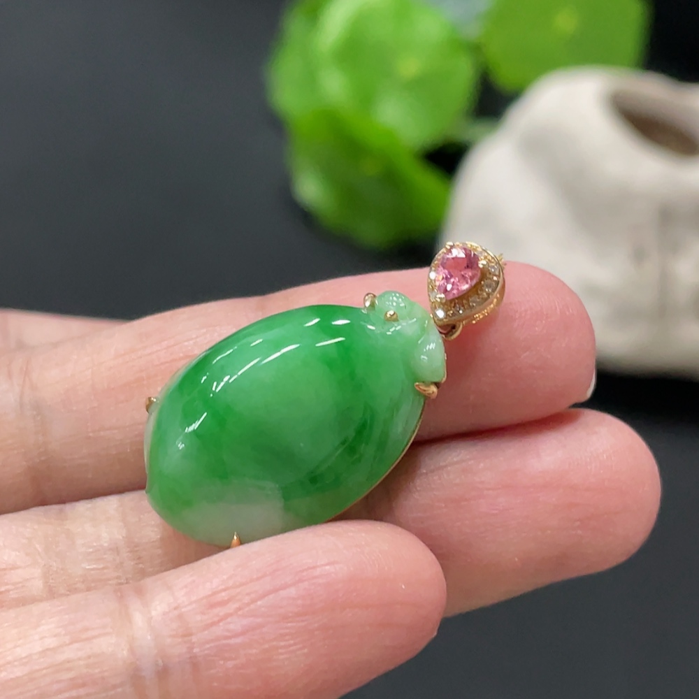 Jadeite Peach-Inlaid Pendant with 18k Gold Chain and Body, Total Weight Approx. 6.3g, Accented with Diamonds