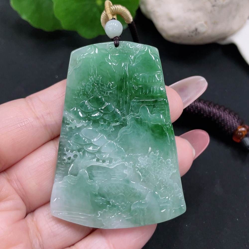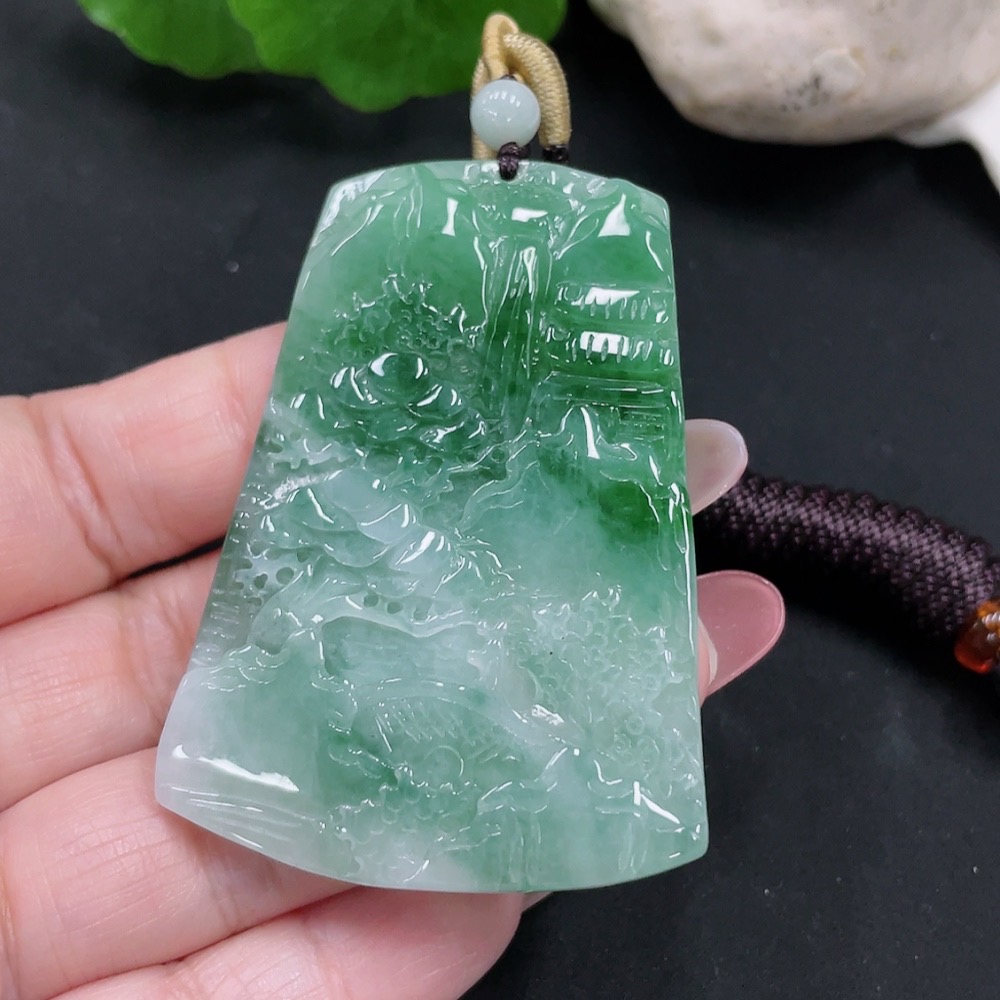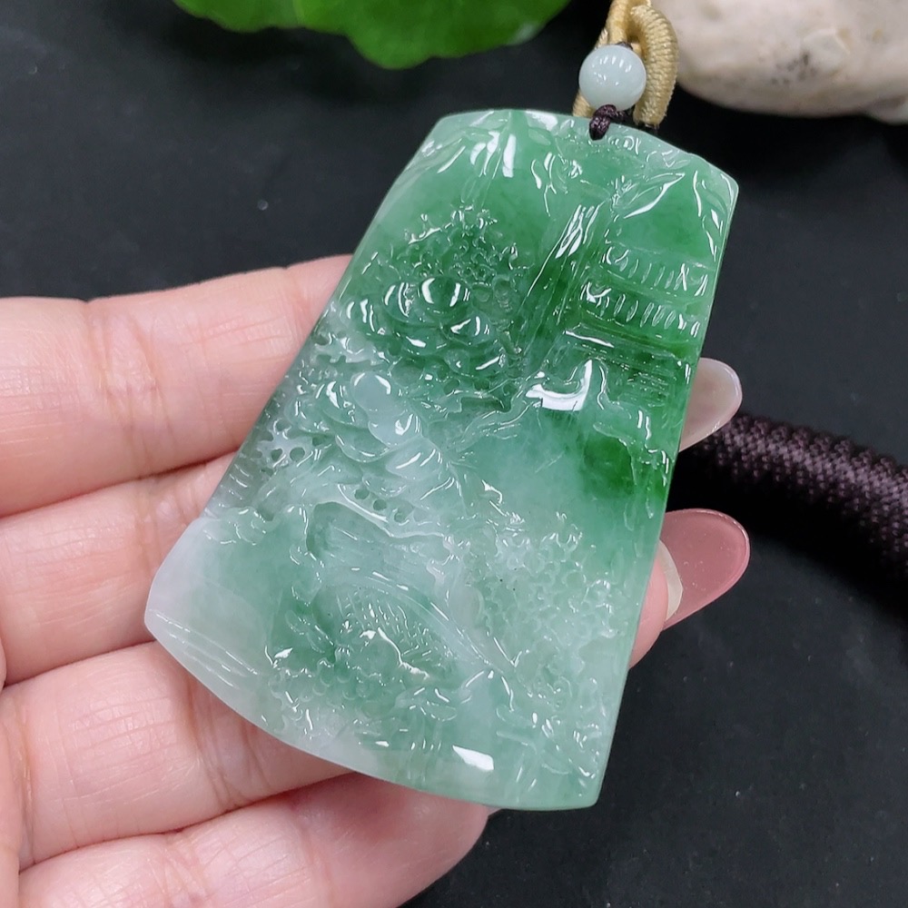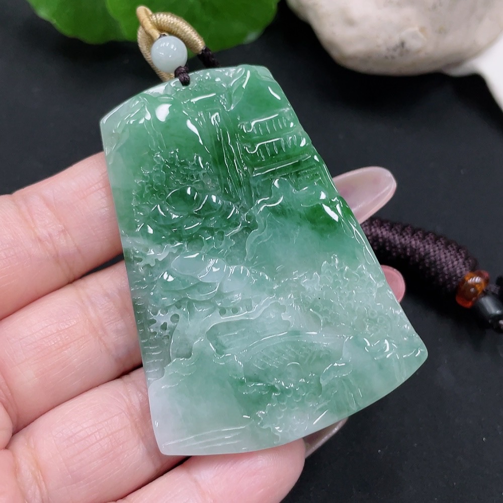 Jadeite landscape pendant with a total weight of approximately 28.5 grams (including rope weight)
