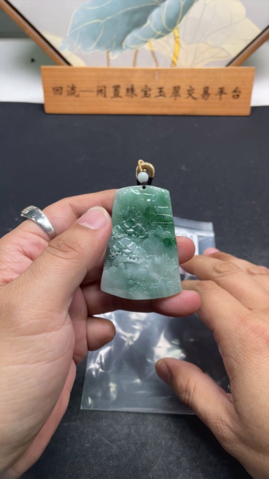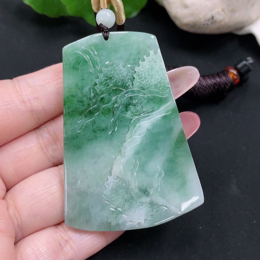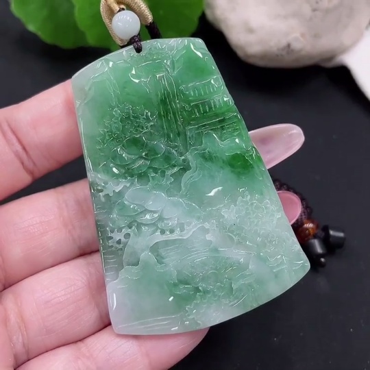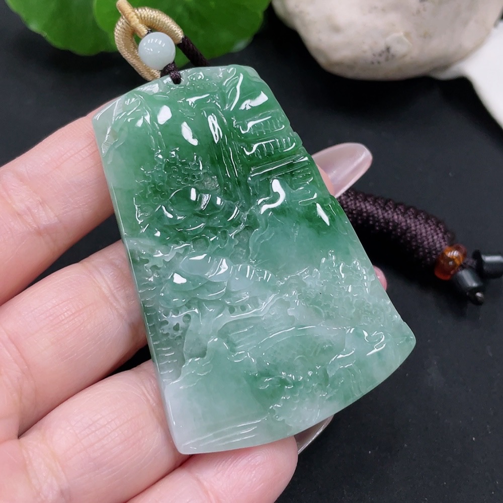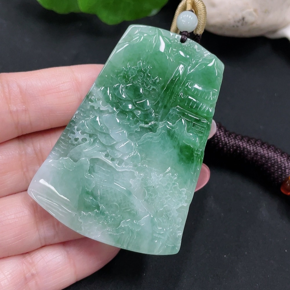 Jadeite landscape pendant with a total weight of approximately 28.5 grams (including rope weight)