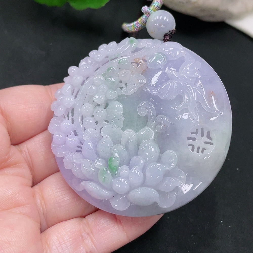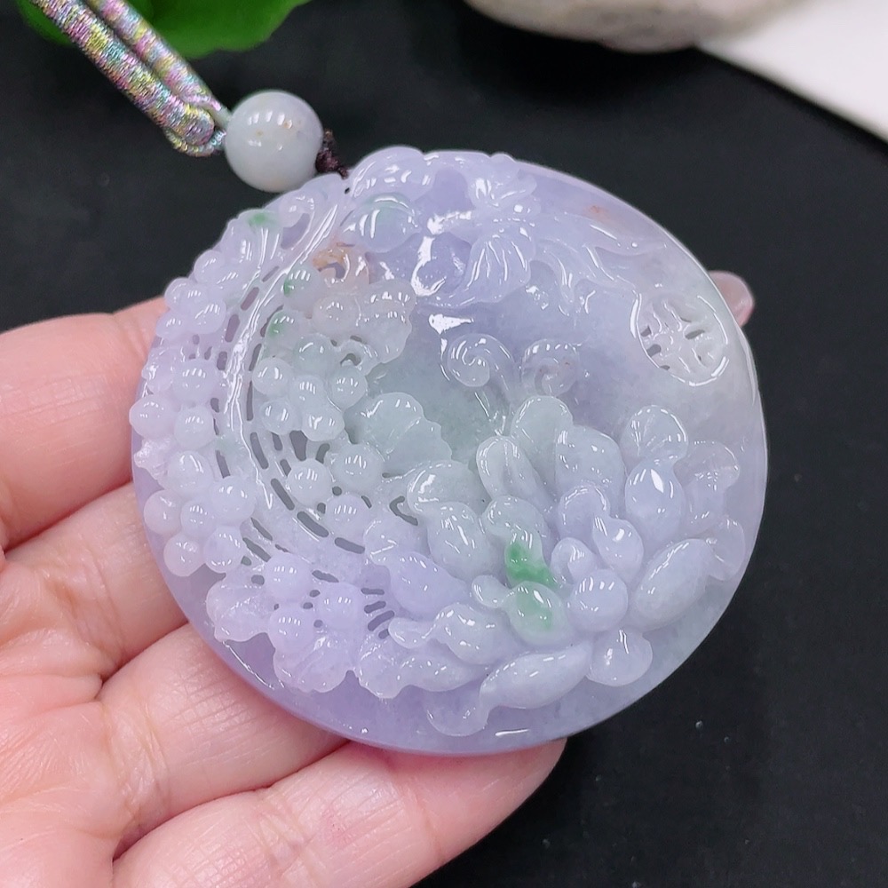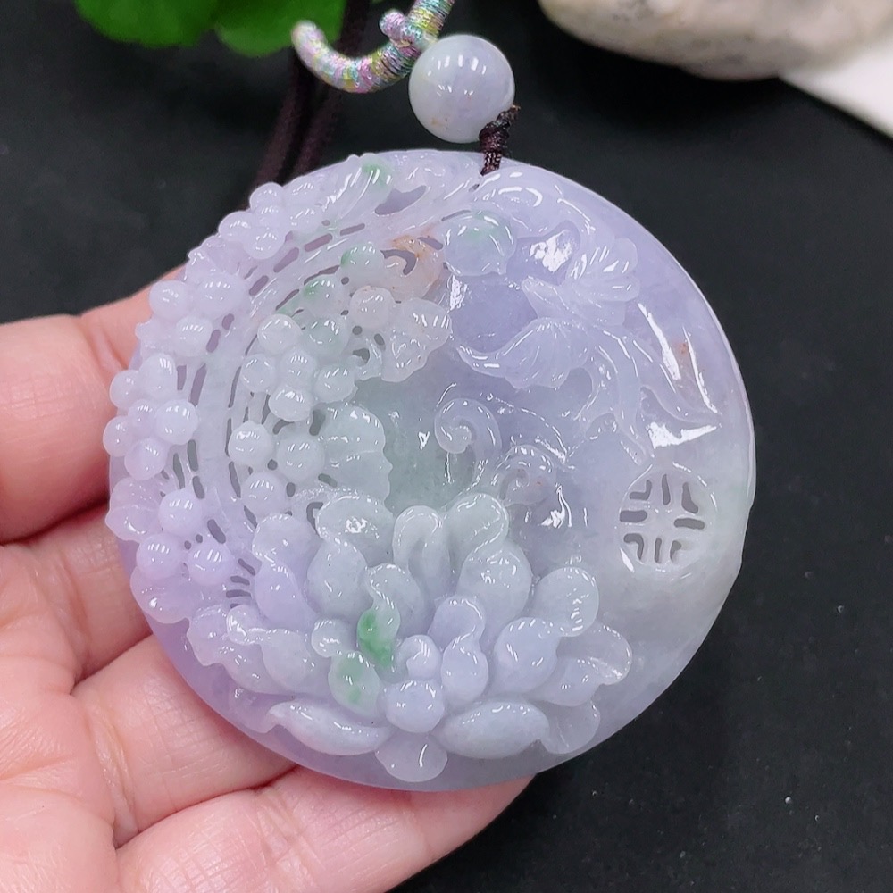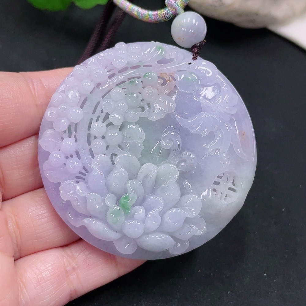 Jadeite Flower and Bird Pendant (Total weight approx. 80.8g, including rope weight)
