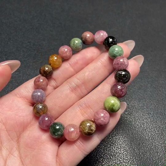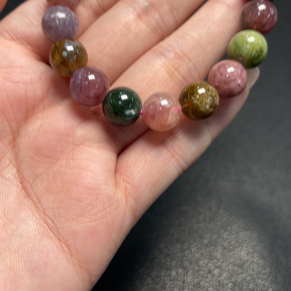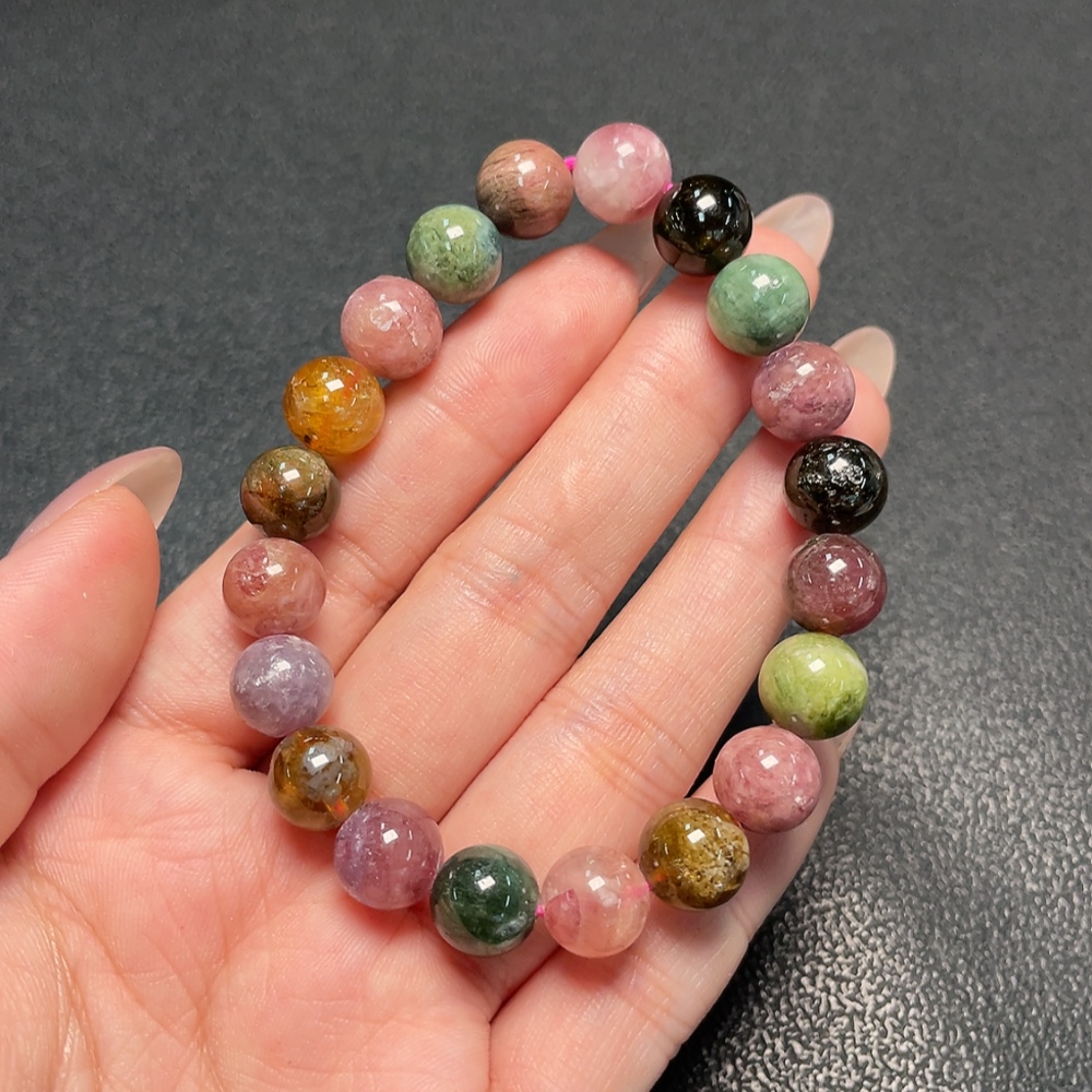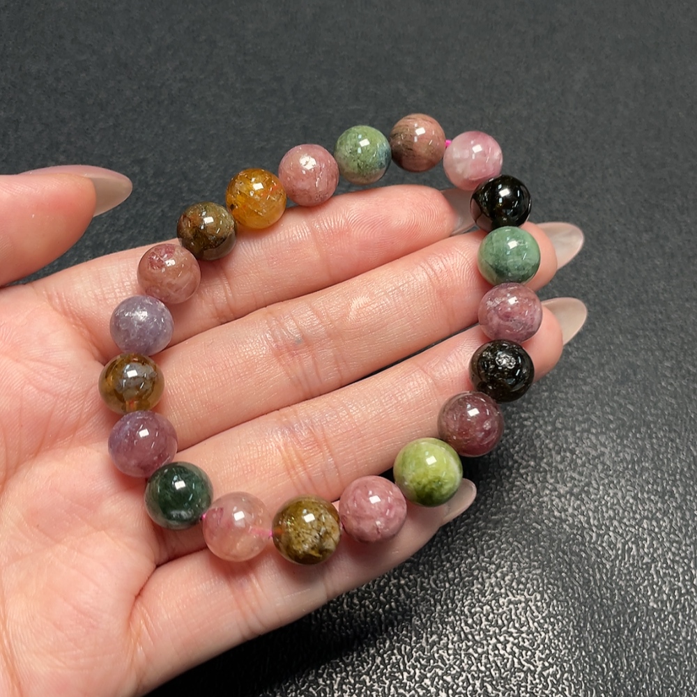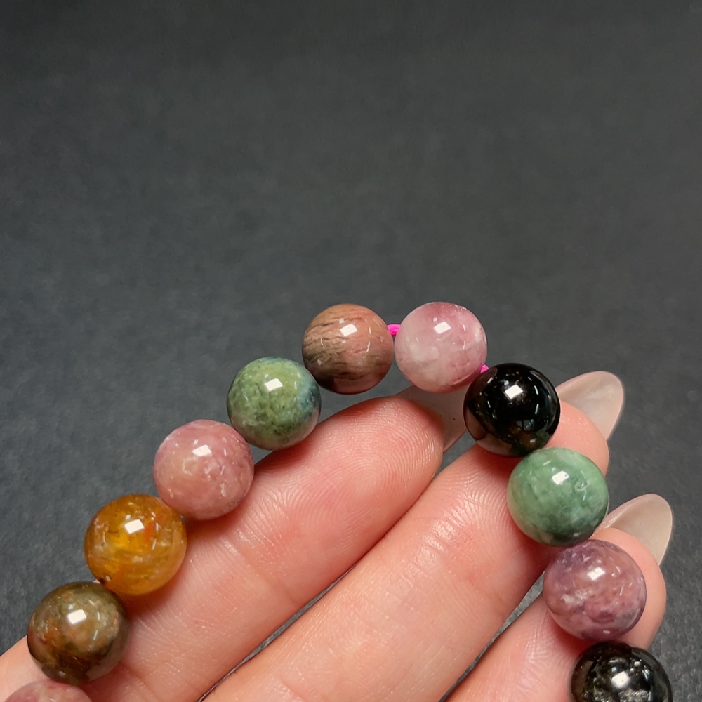 Tourmaline bracelet containing other mineral components with visible organic matter, total weight approximately 28g, bead size about 9.6mm