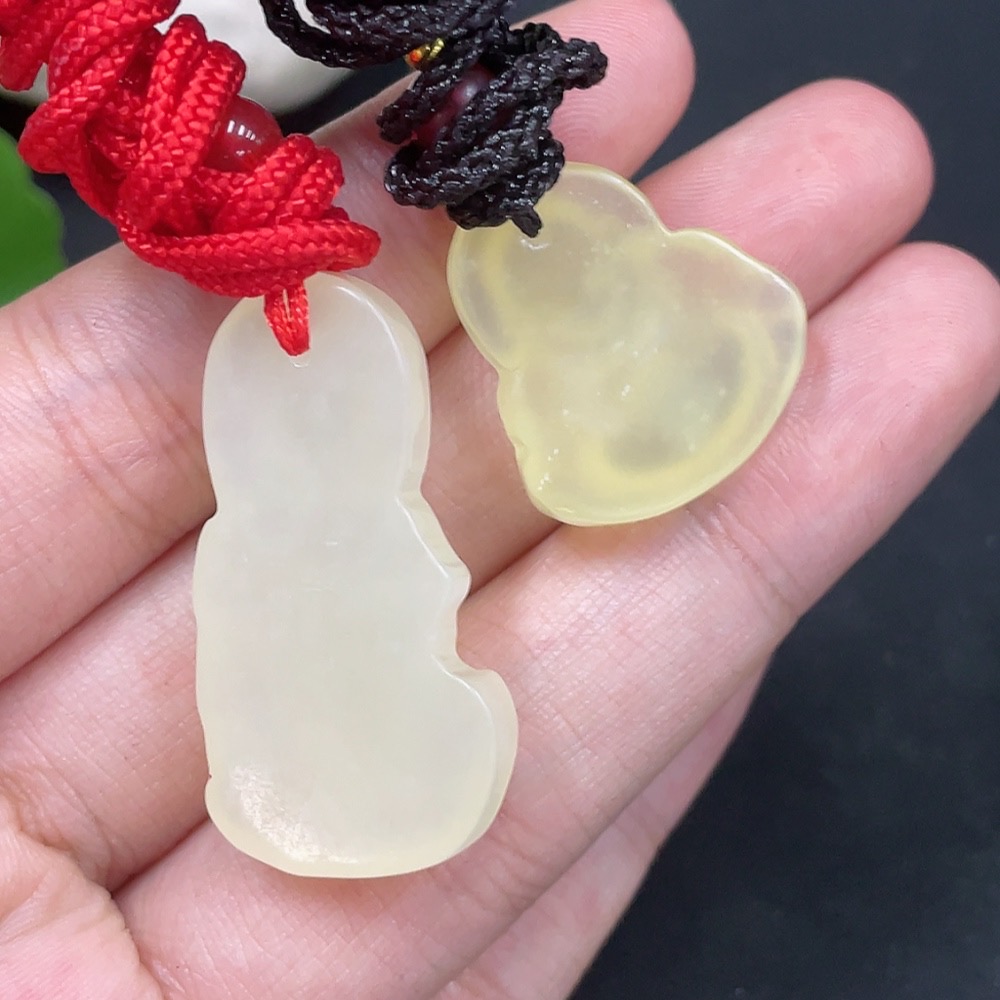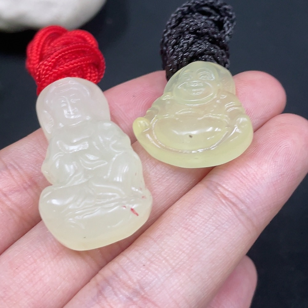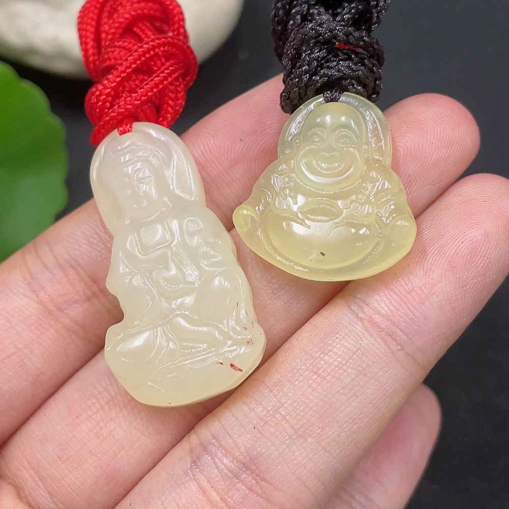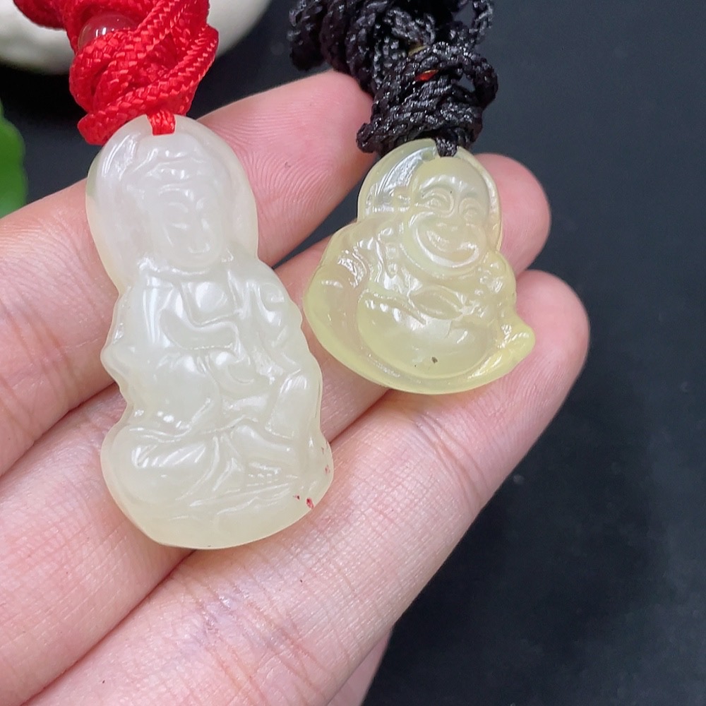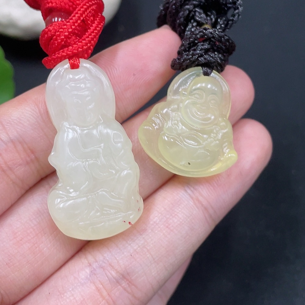 Xiuyu (Serpentine Jade) Pendant - Buddha + Guanyin