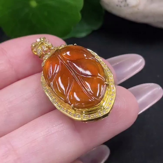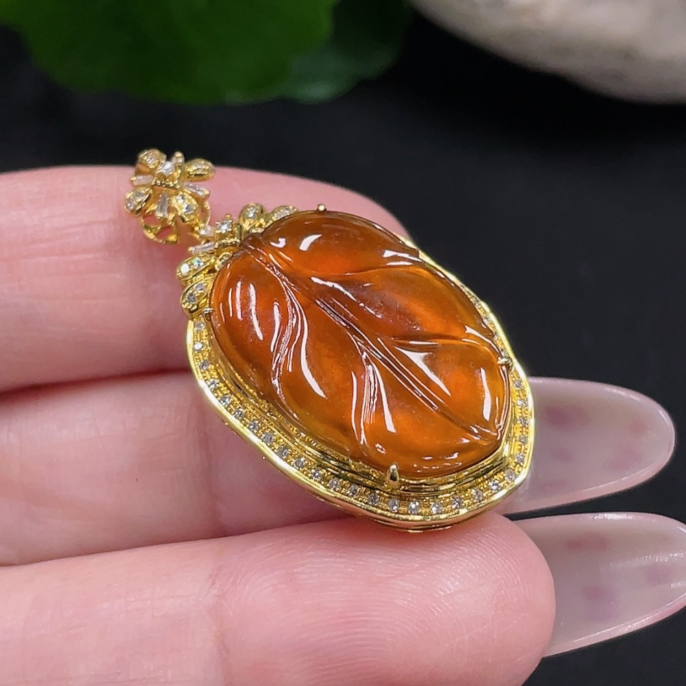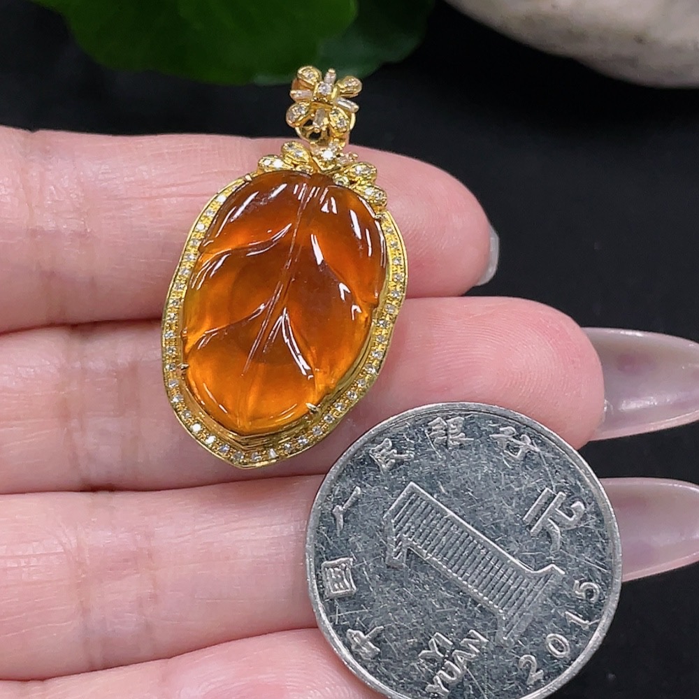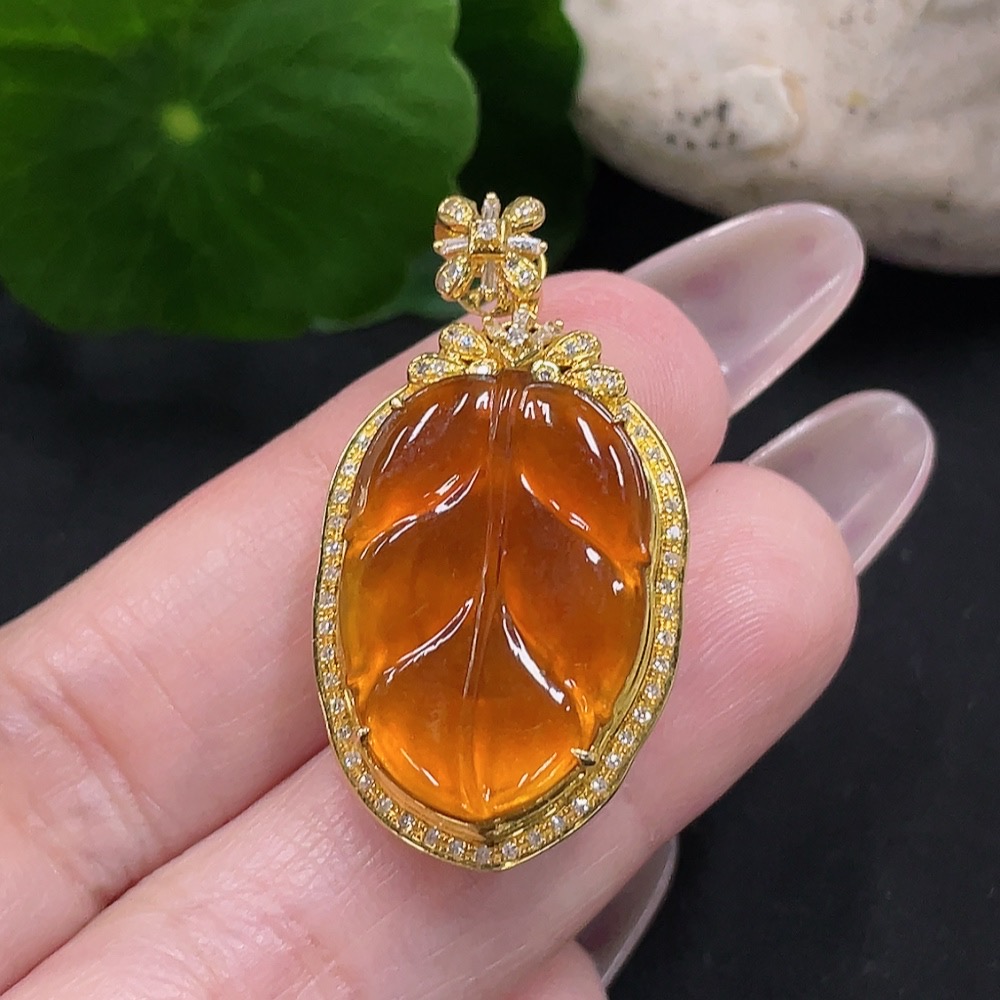 Jadeite Leaf Pendant in 18K Gold with Diamond Accents, Precious Metal May Affect Color, Total Weight Approx. 7.11g