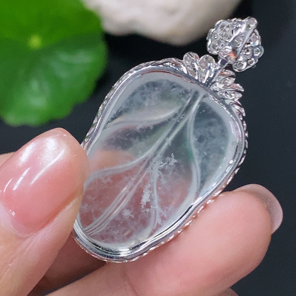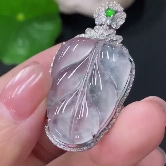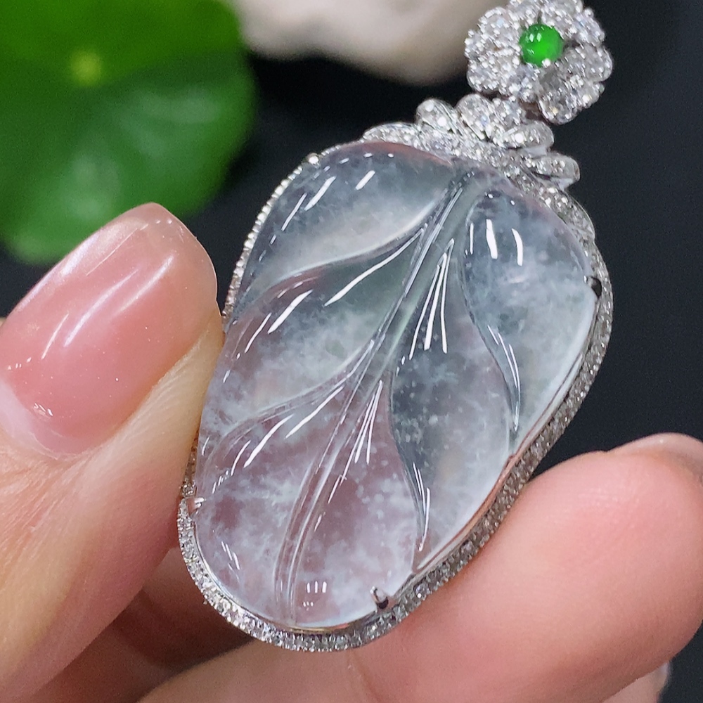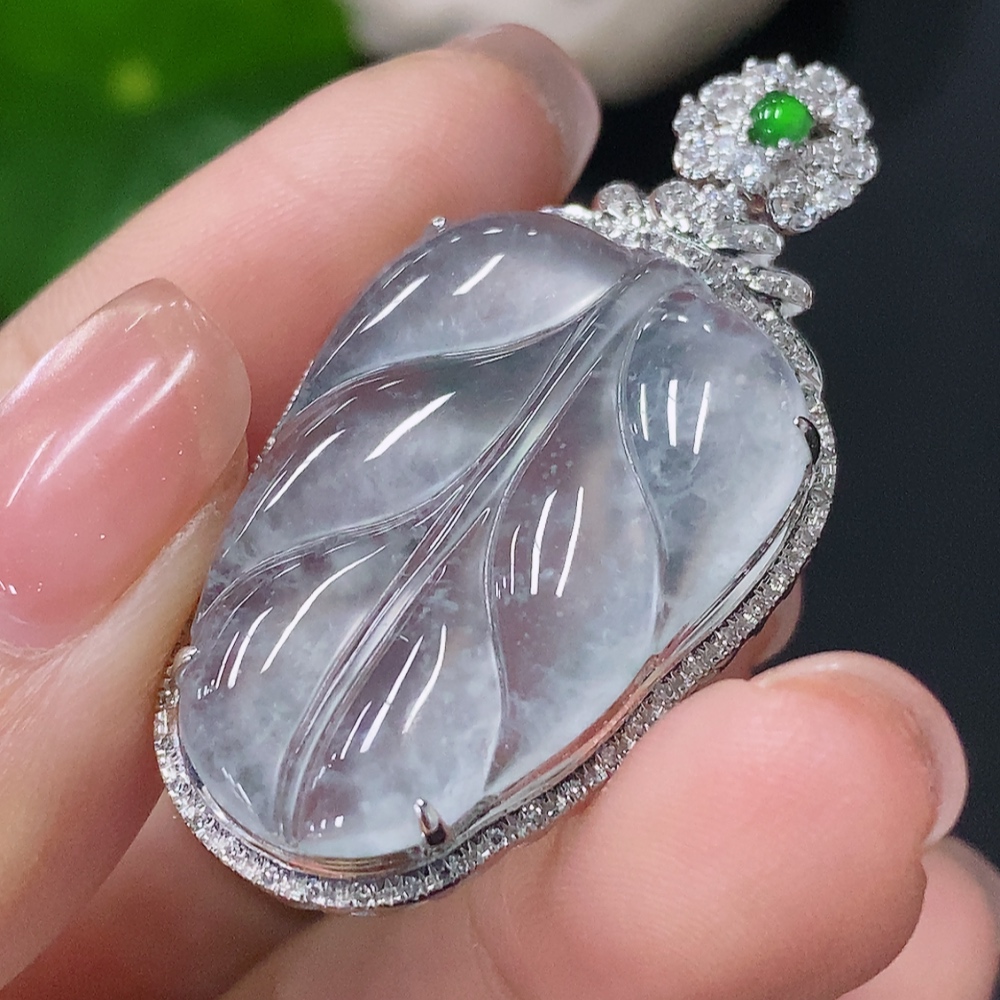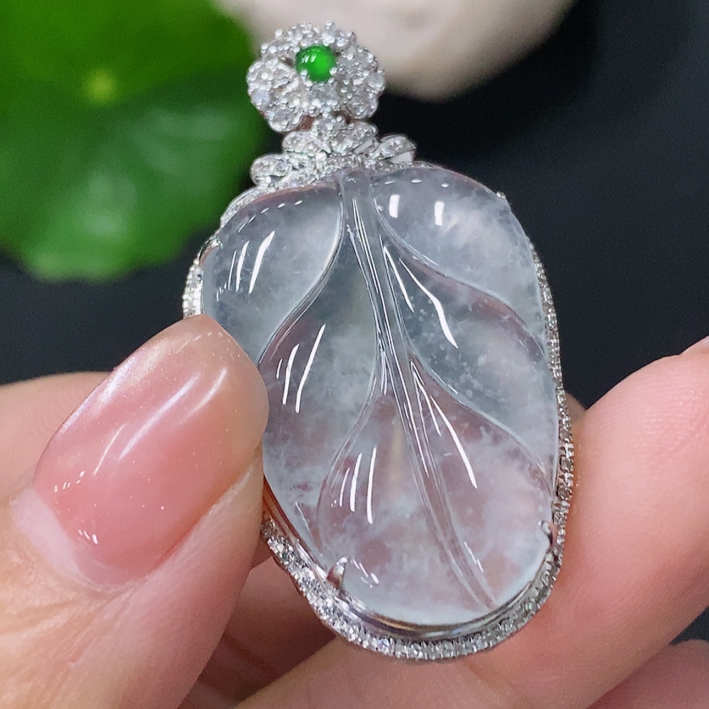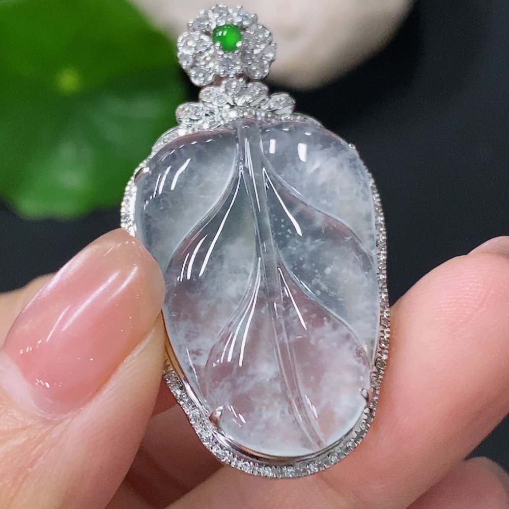 Jadeite inlaid leaf pendant with 18k gold and diamonds, total weight approximately 5.7g