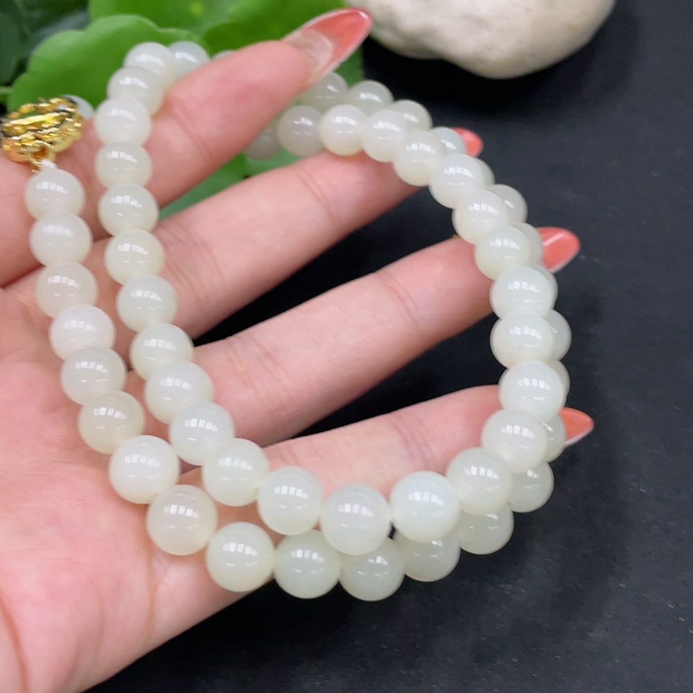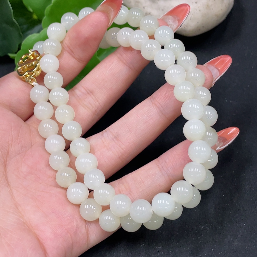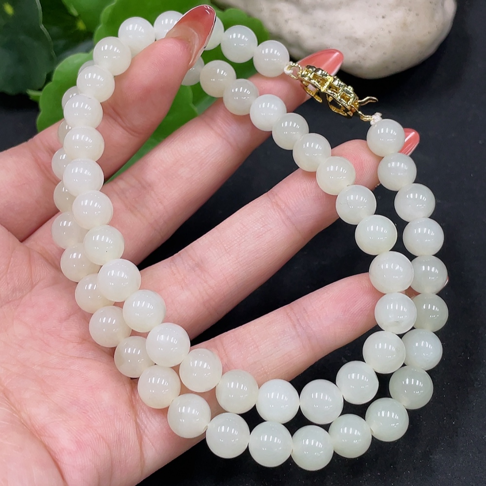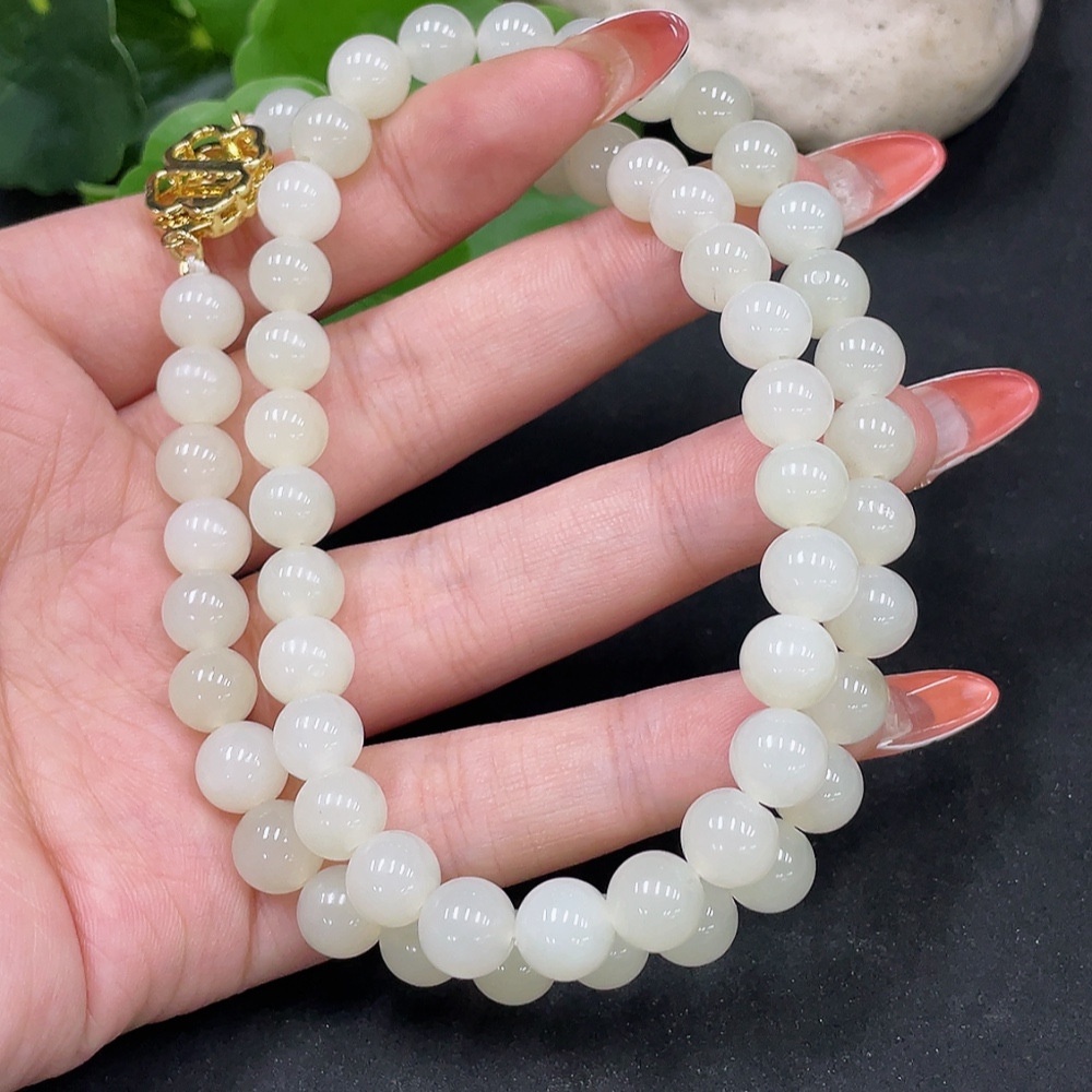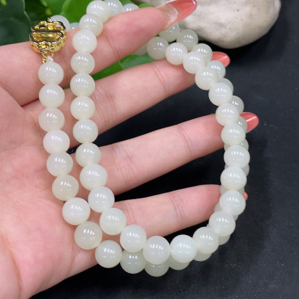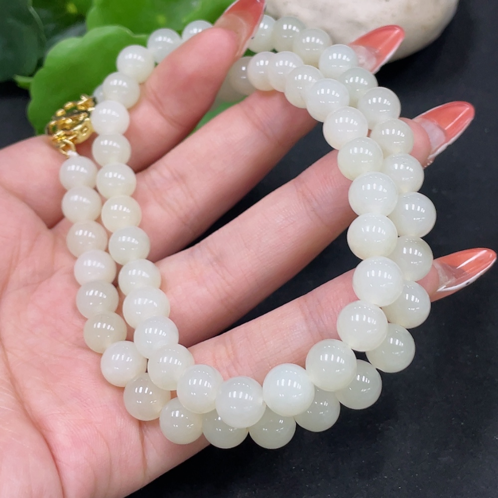 Hetian Jade Bead Necklace, Approx. 7.7mm, Non-Gold Inlaid, Total Weight Approx. 47.8g