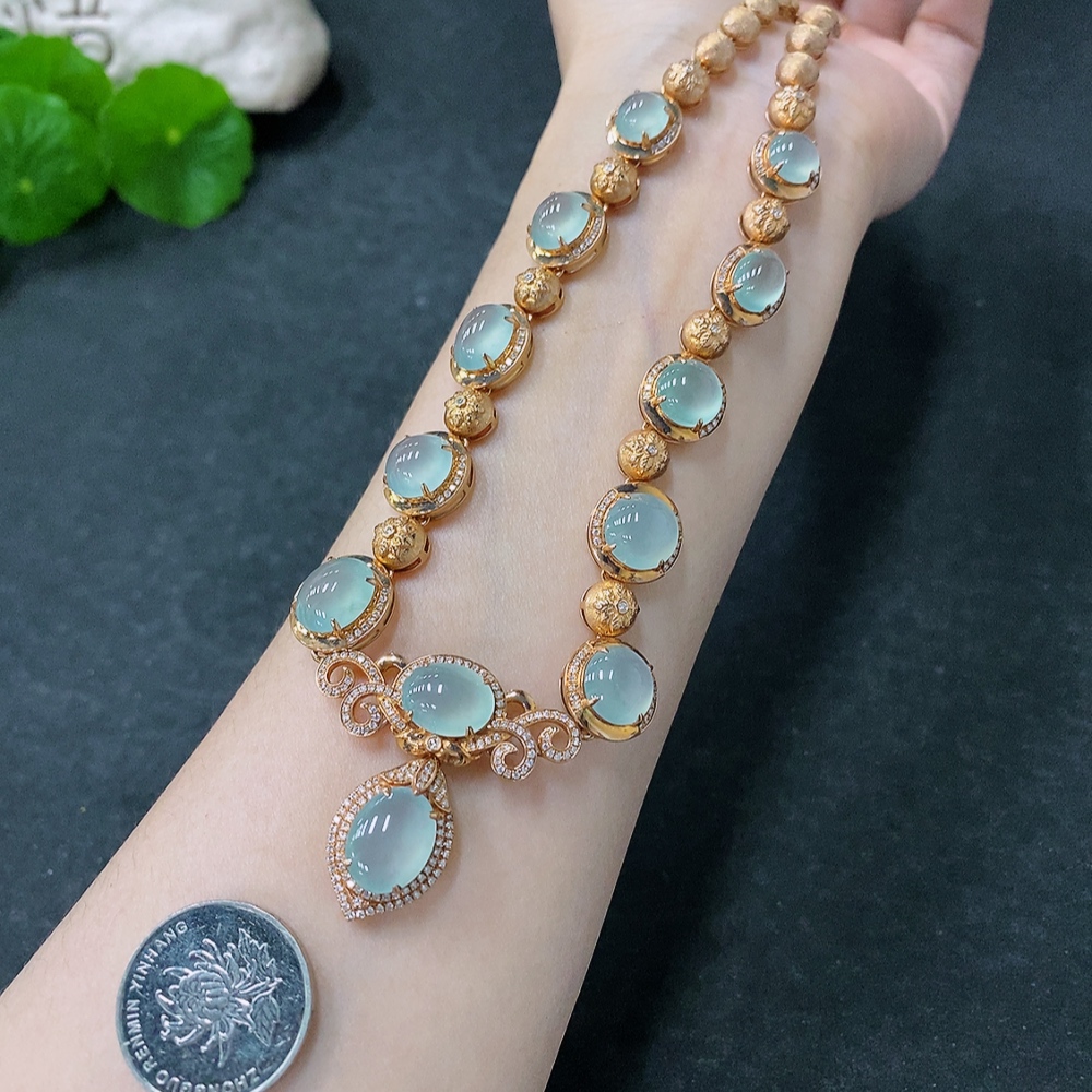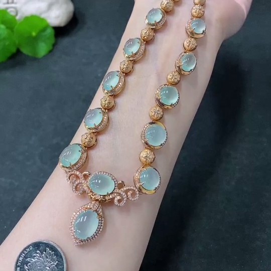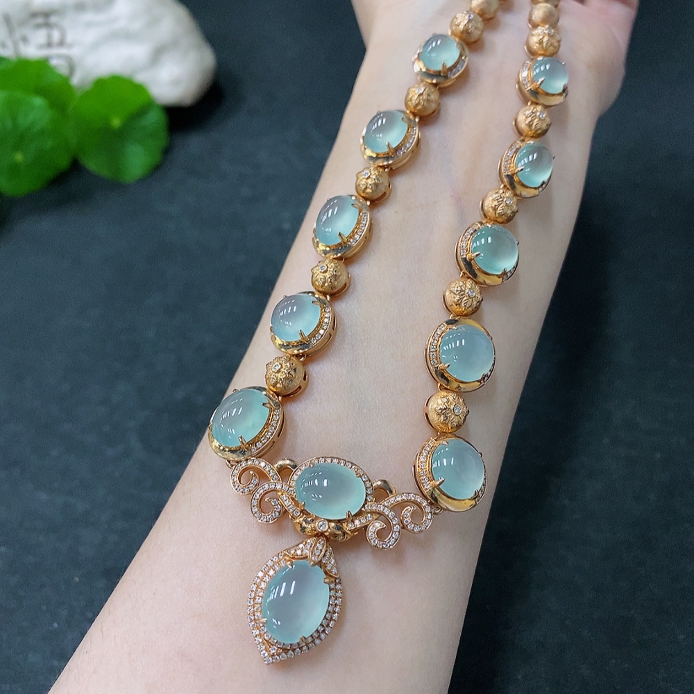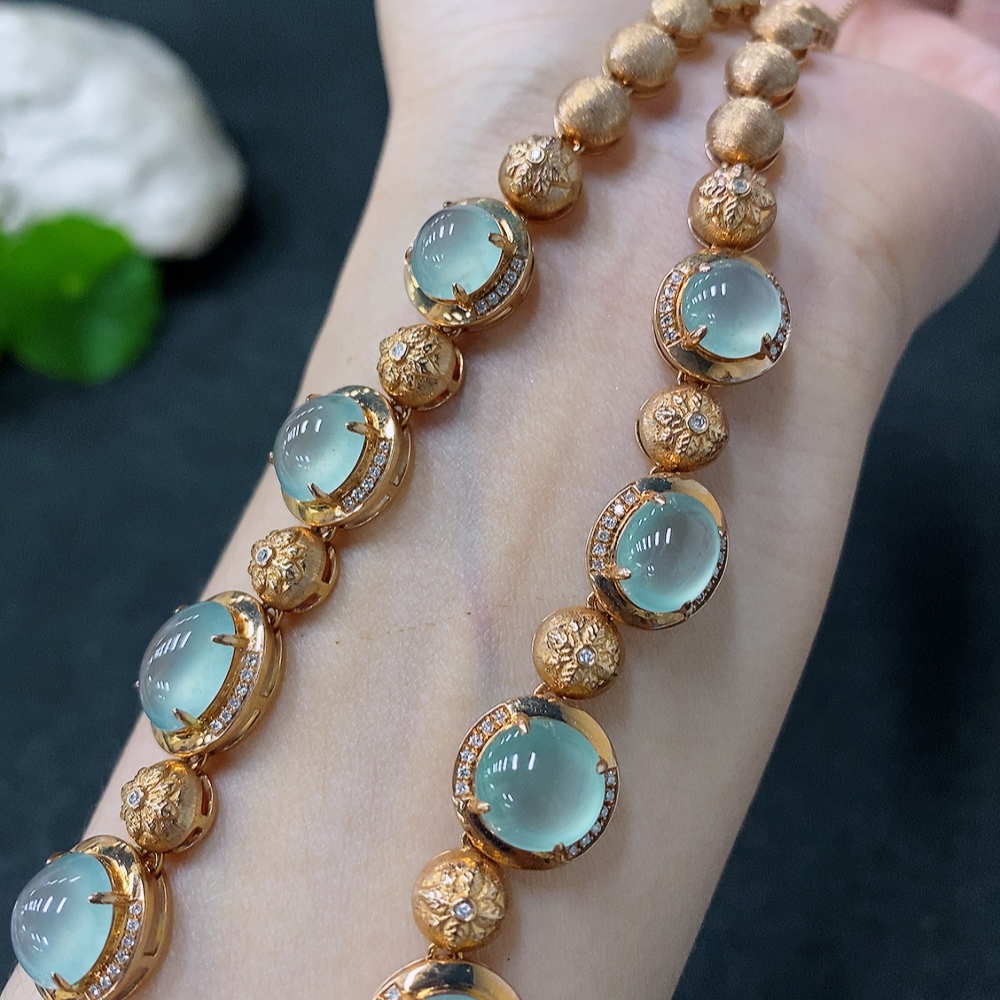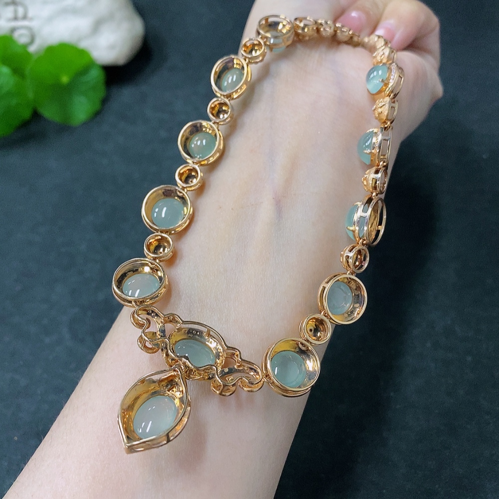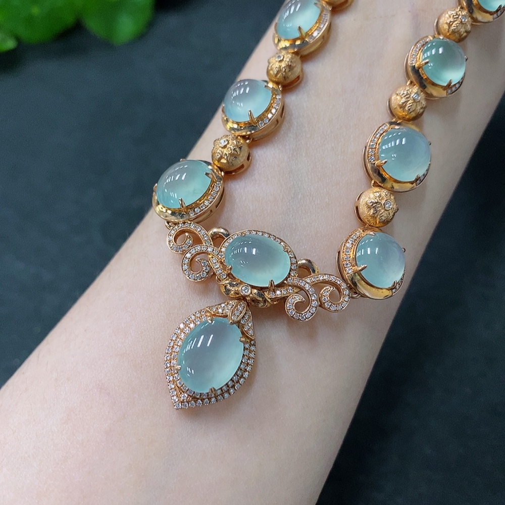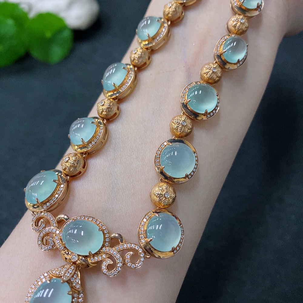Jadeite Cabochon Set Necklace with 18K Gold and Diamond Accents, Total Weight Approximately 44.1g