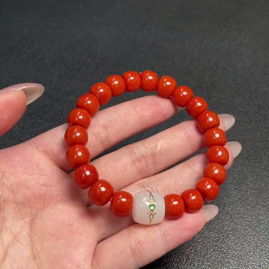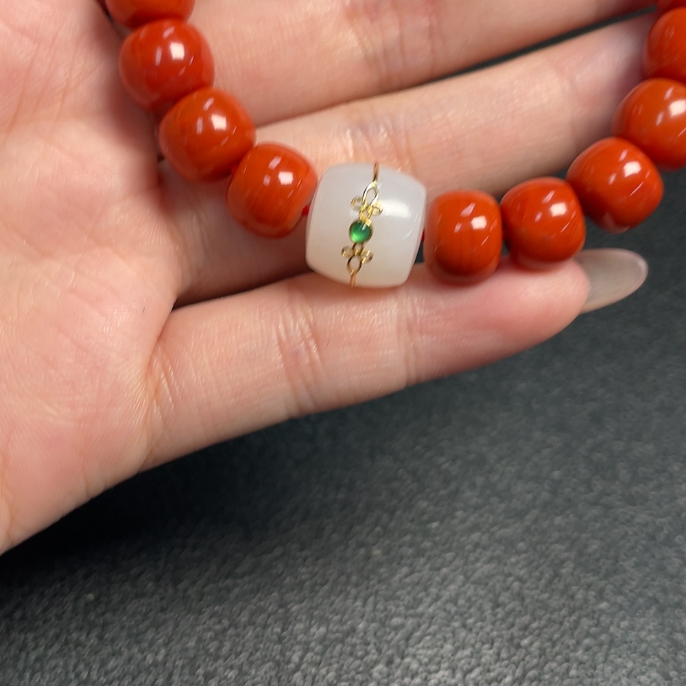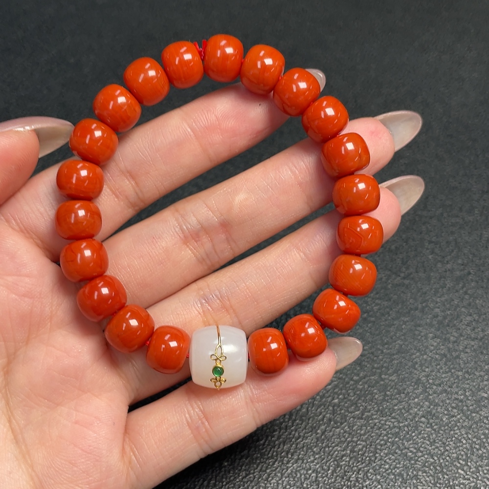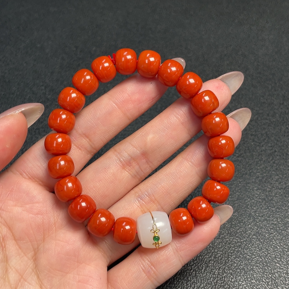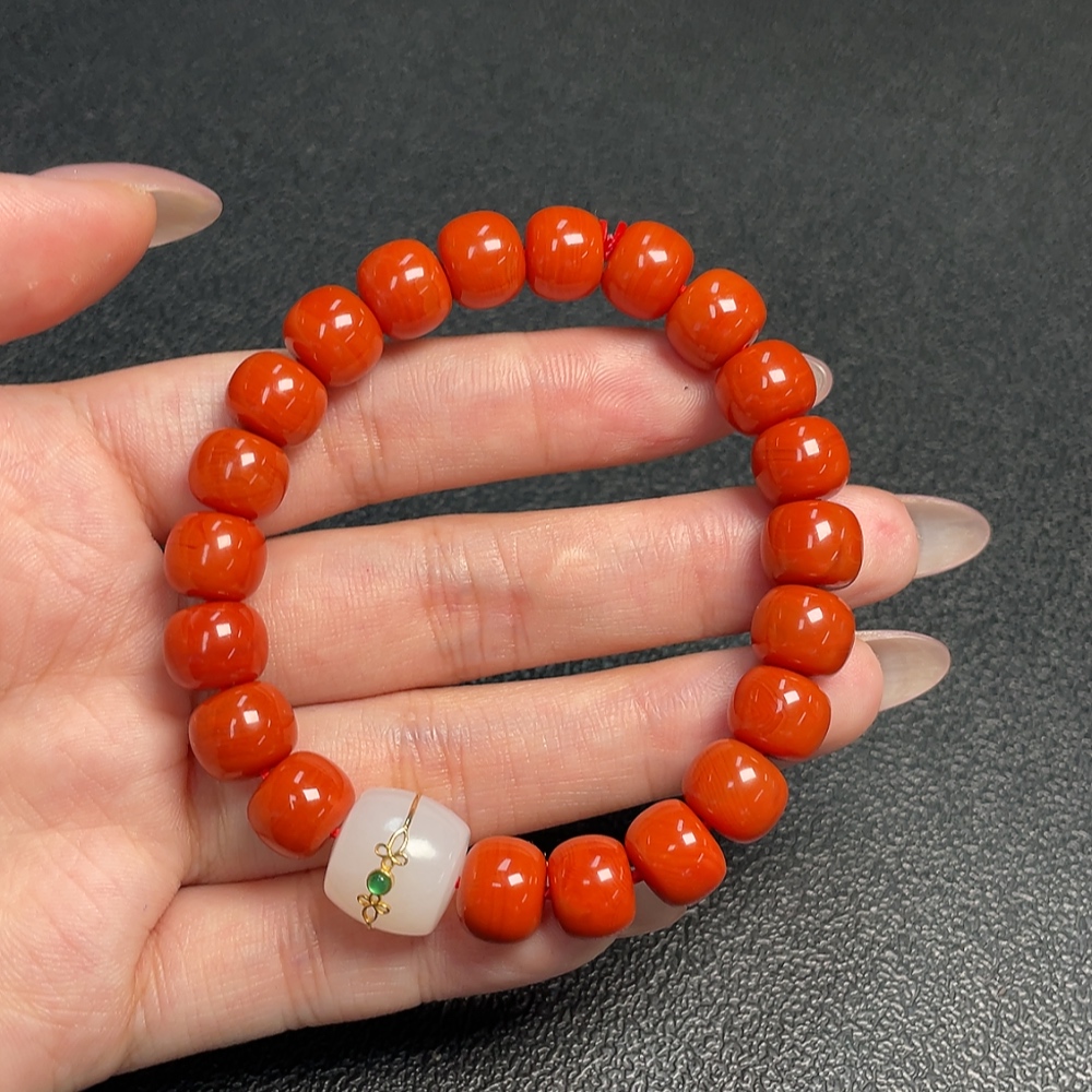Trezaar - Red Agate Bracelet with Visible Organic Matter, Total Weight Approx. 29.73g, Size ~9.7mm, Paired with Hetian Jade