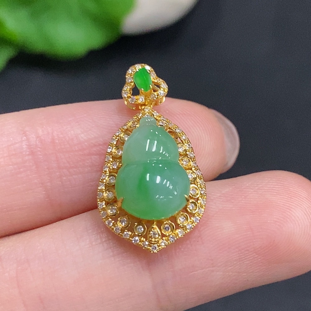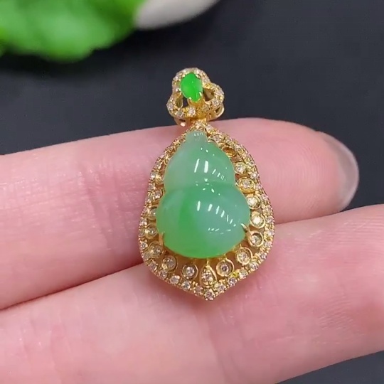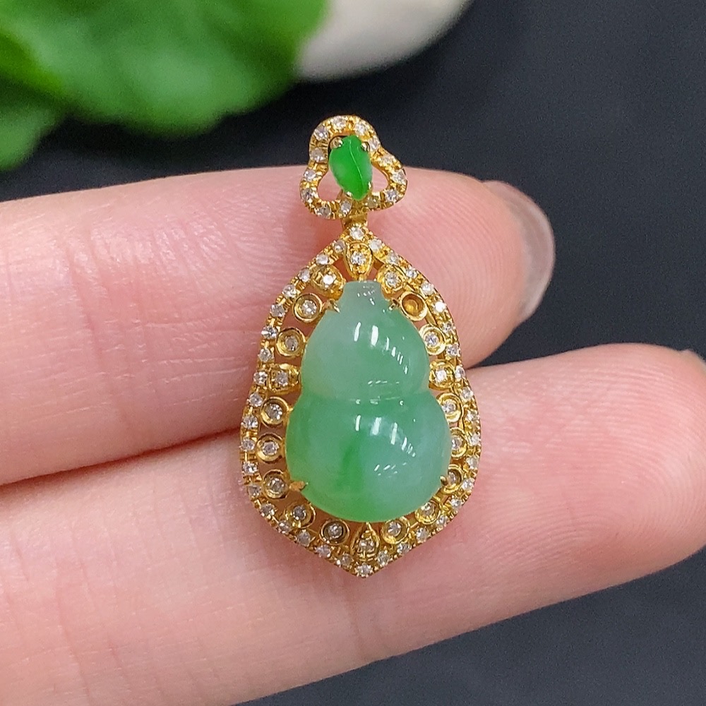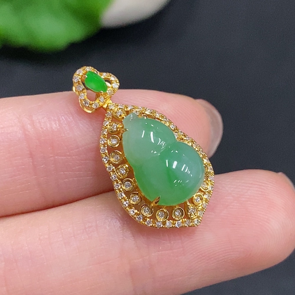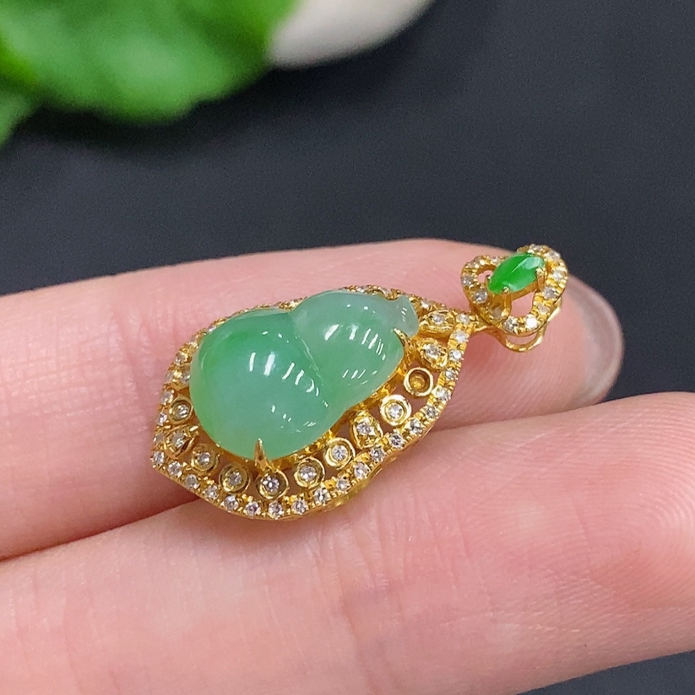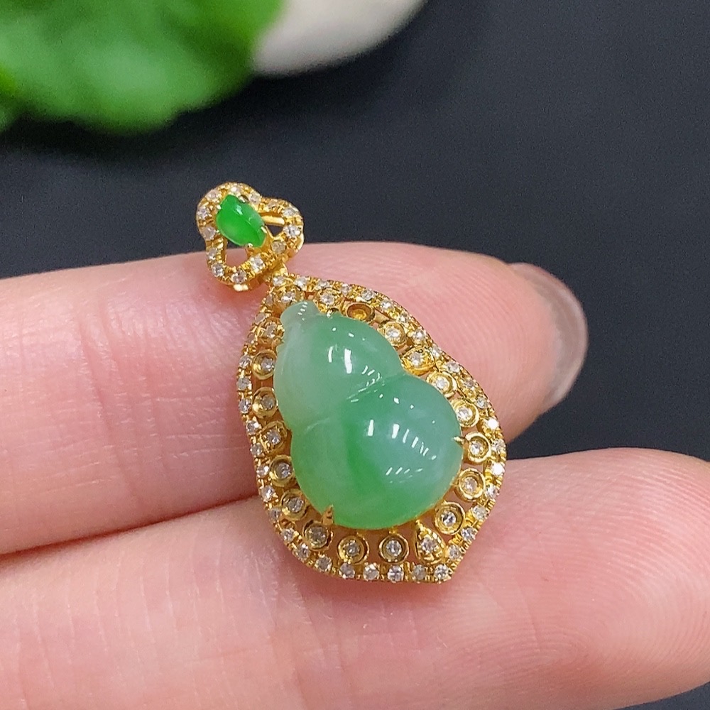 Jadeite Gourd Pendant with 18K Gold and Diamond Accents, Total Weight Approximately 2g
