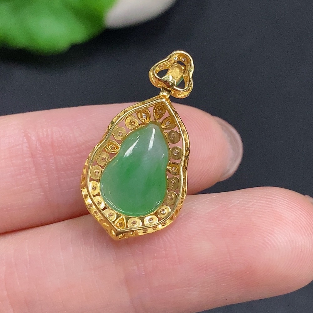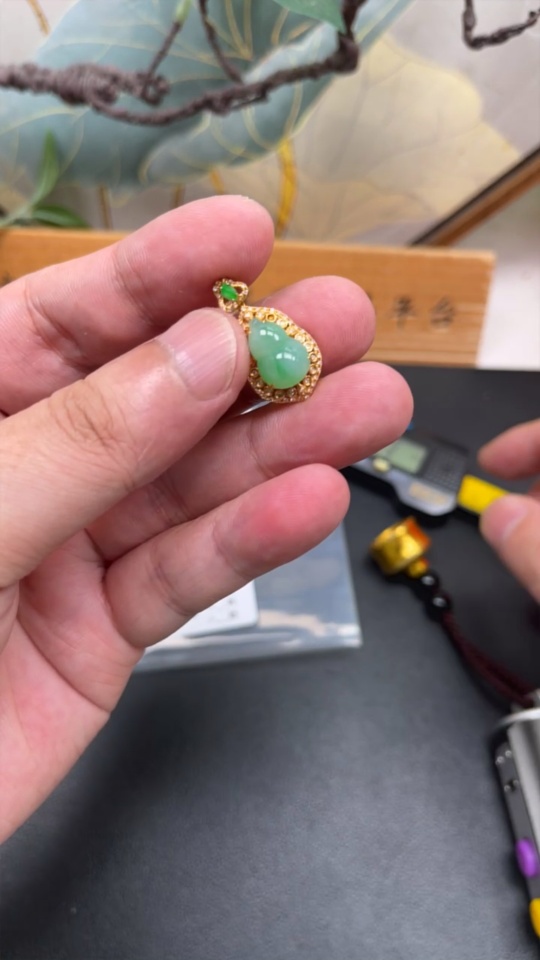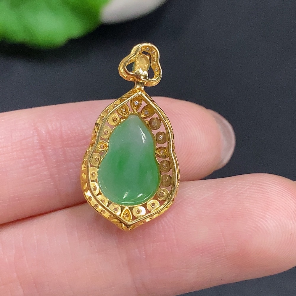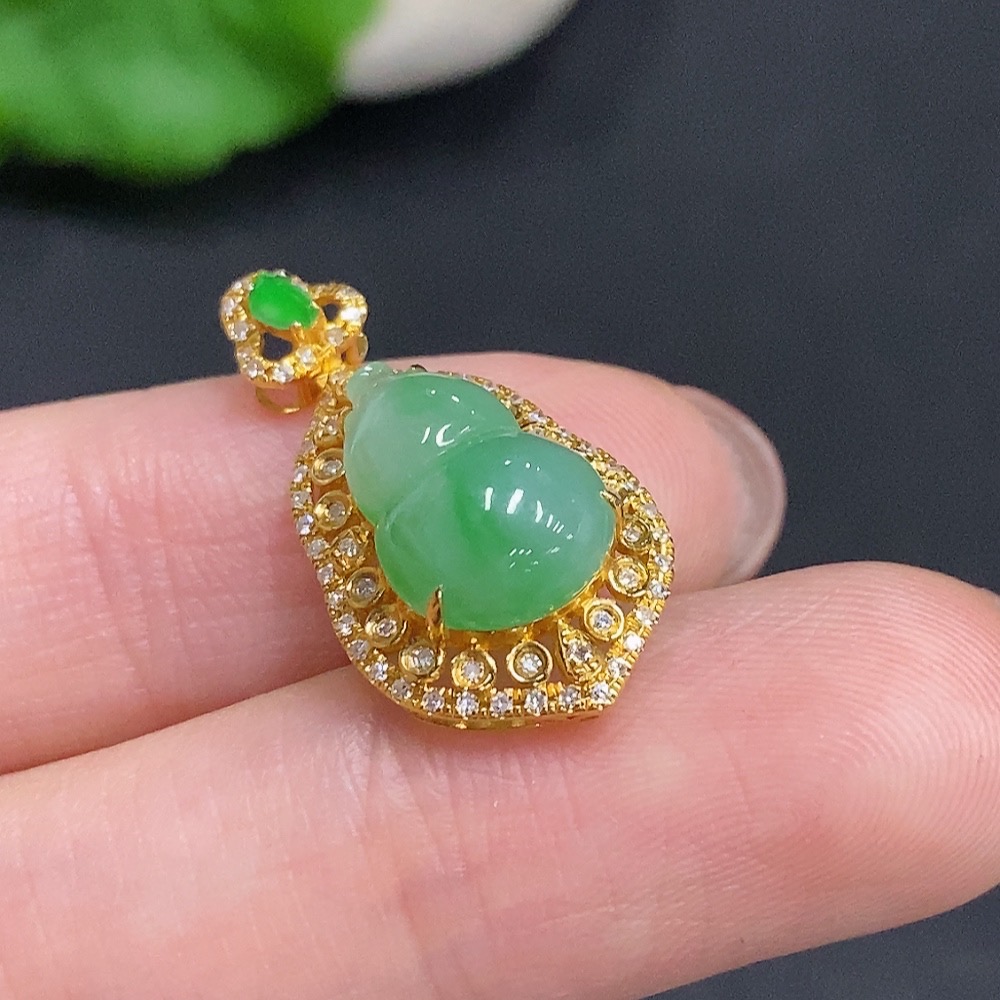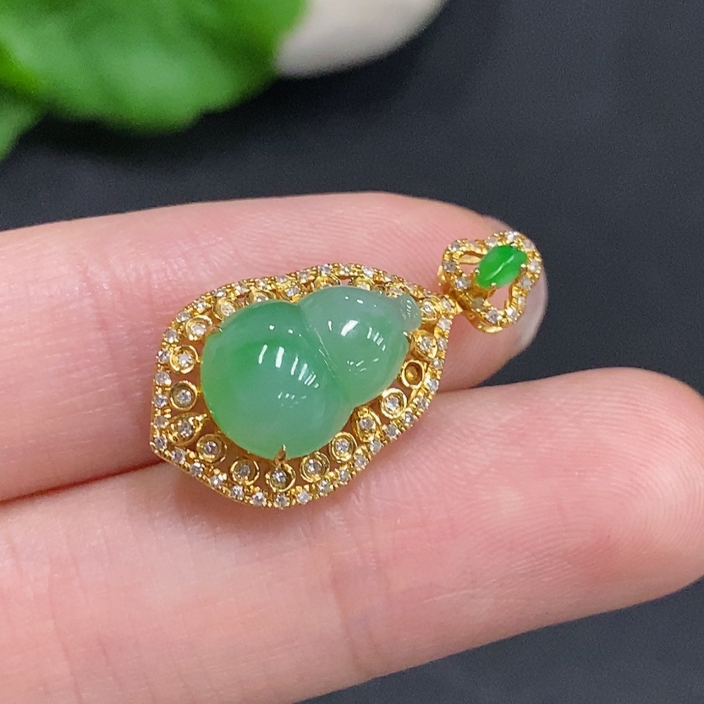 Jadeite Gourd Pendant with 18K Gold and Diamond Accents, Total Weight Approximately 2g
