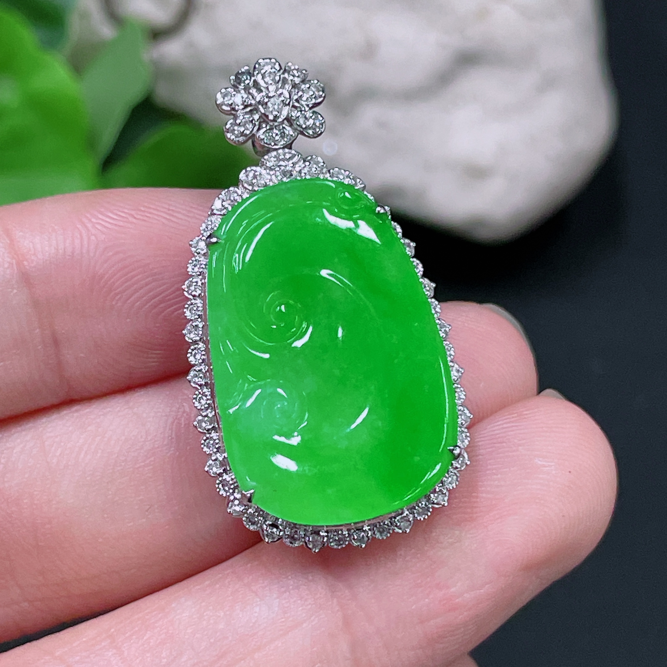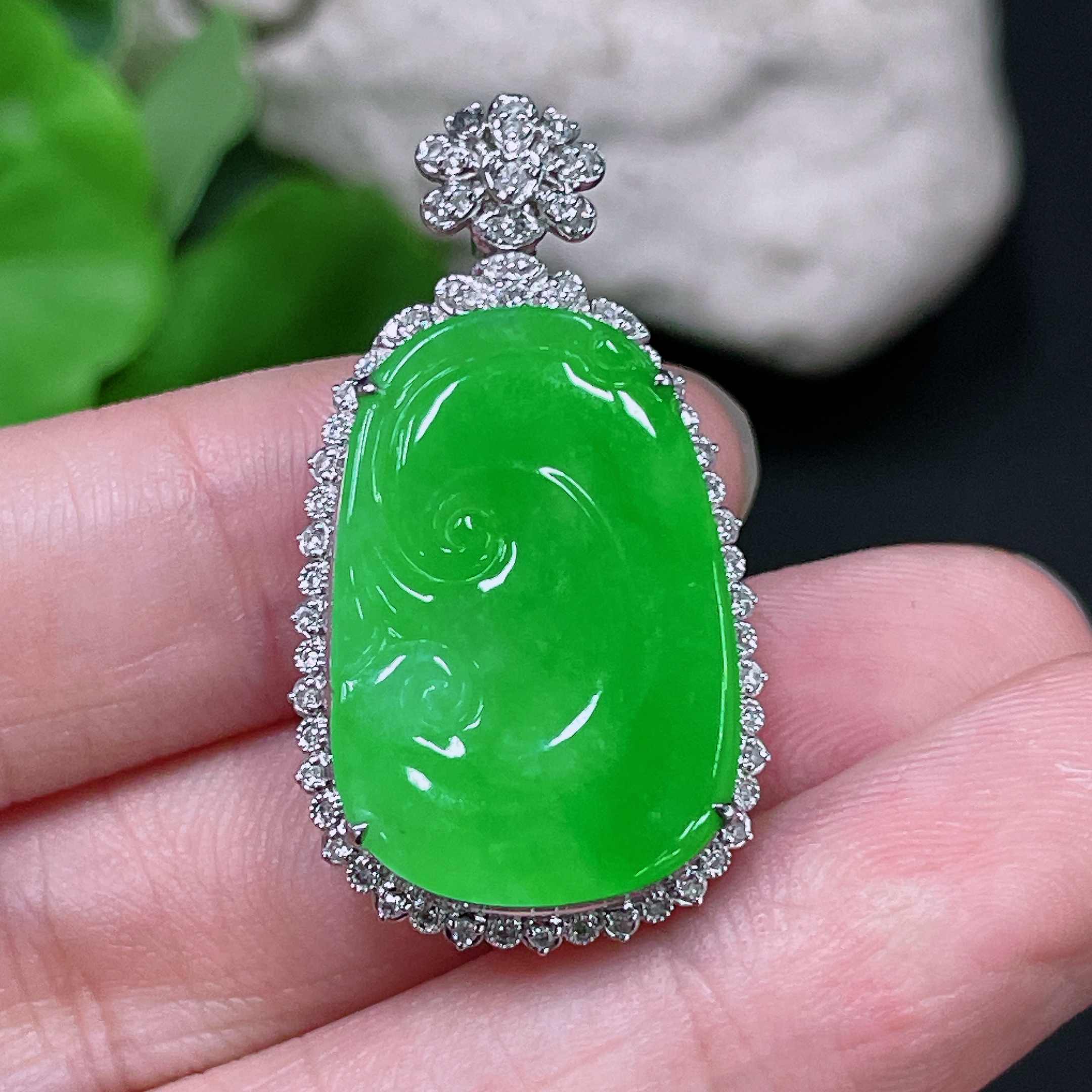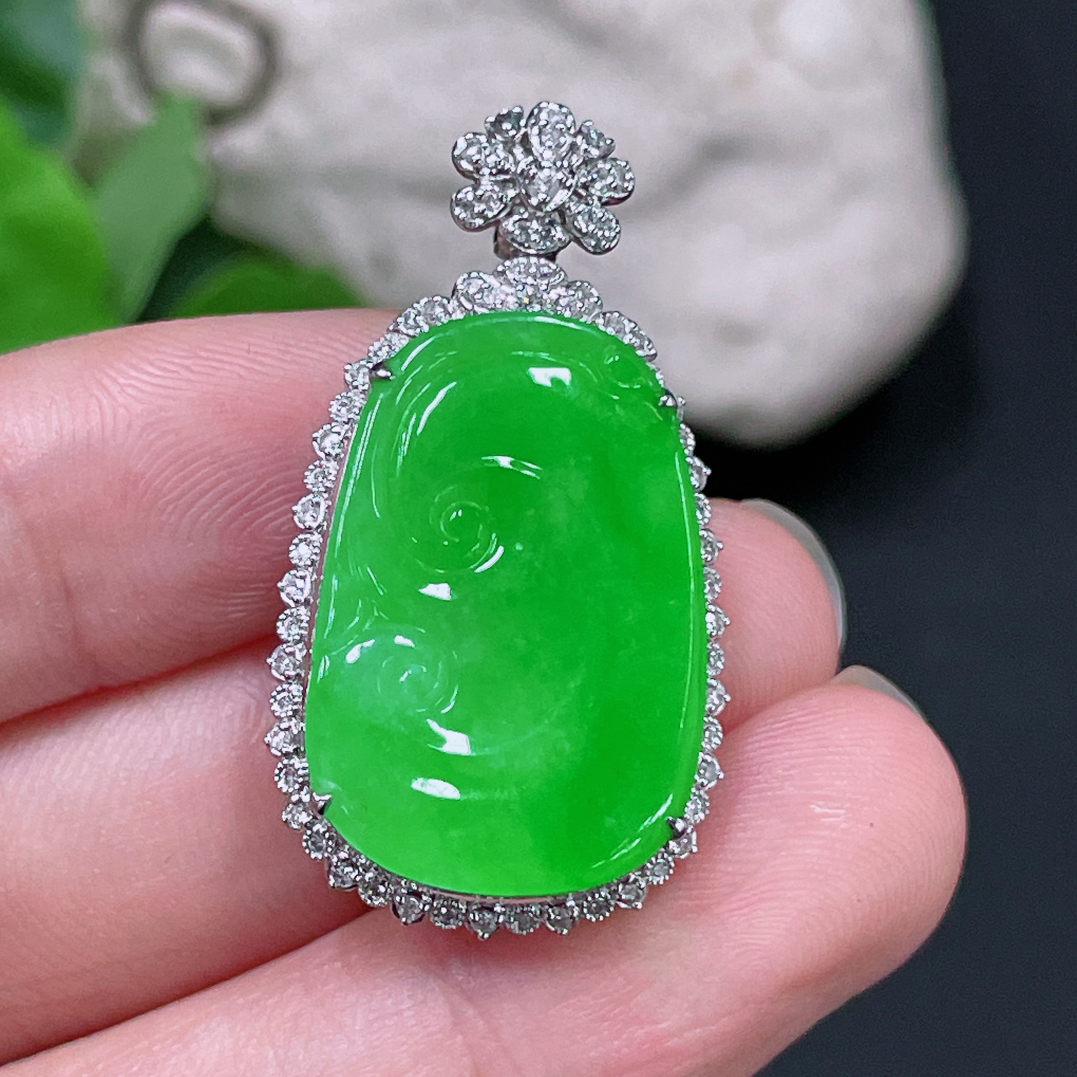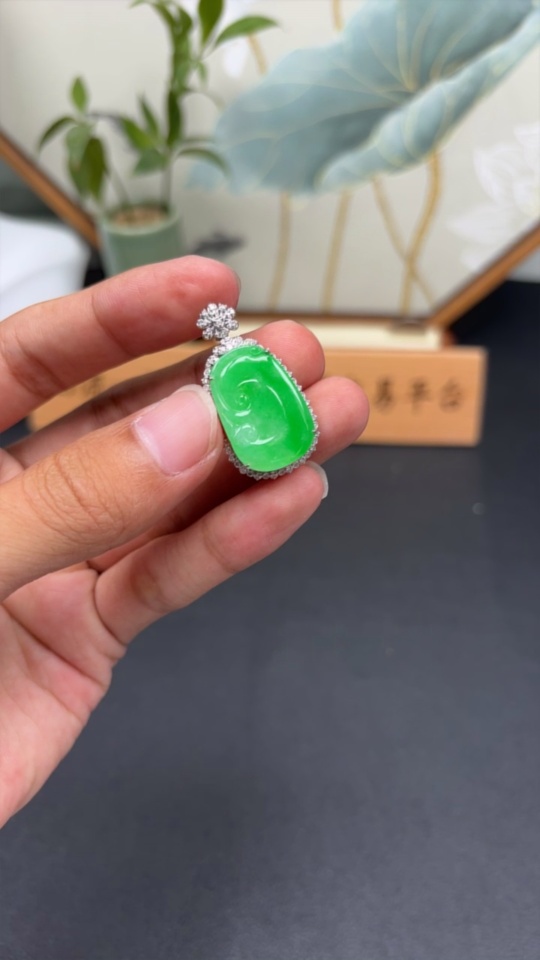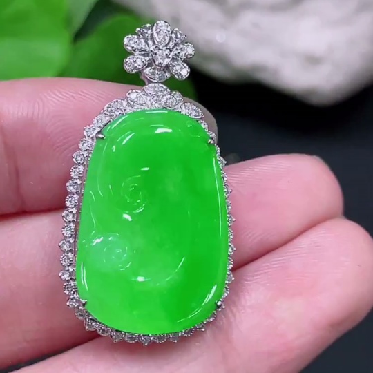 Jadeite Ruyi Inlaid Pendant, 18K Gold with Diamond Accents, Total Weight Approx. 5.95g