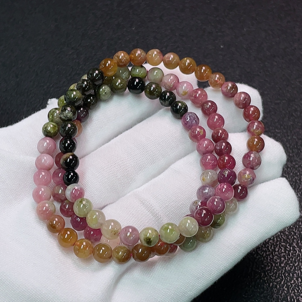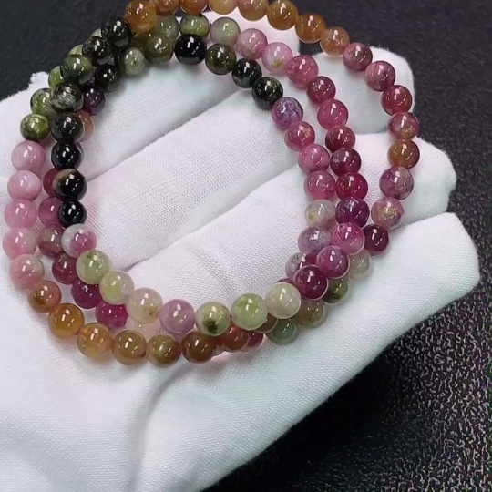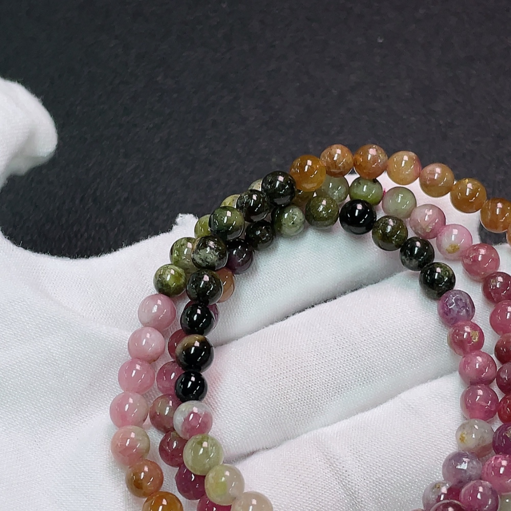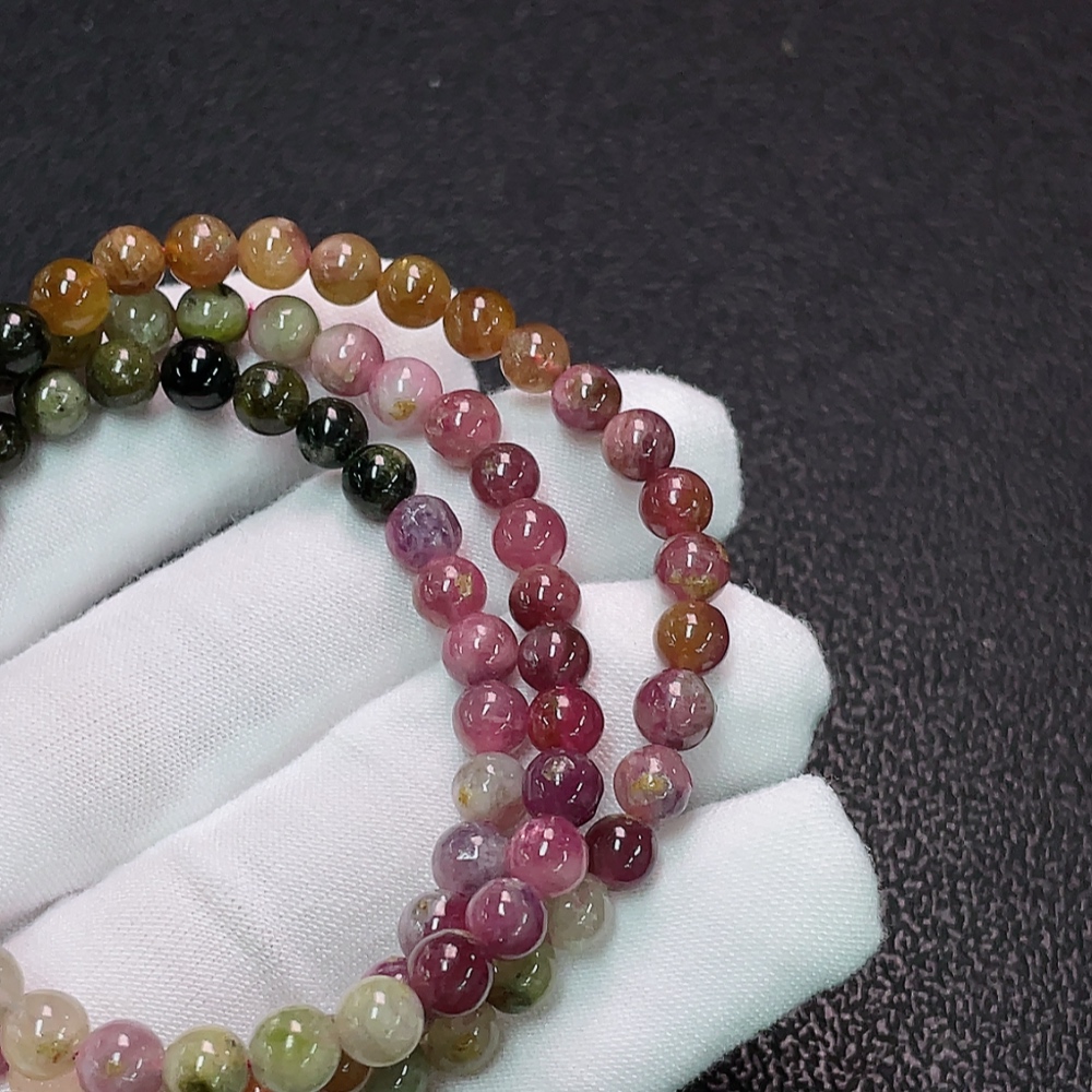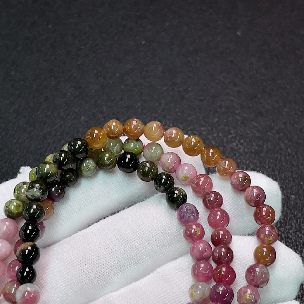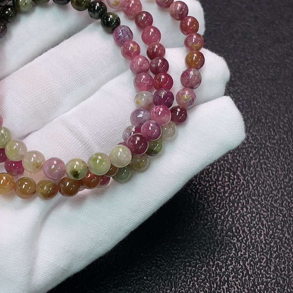 Tourmaline bead strand with other mineral components, visible organic matter, total weight approximately 25.93g, size about 5.7mm