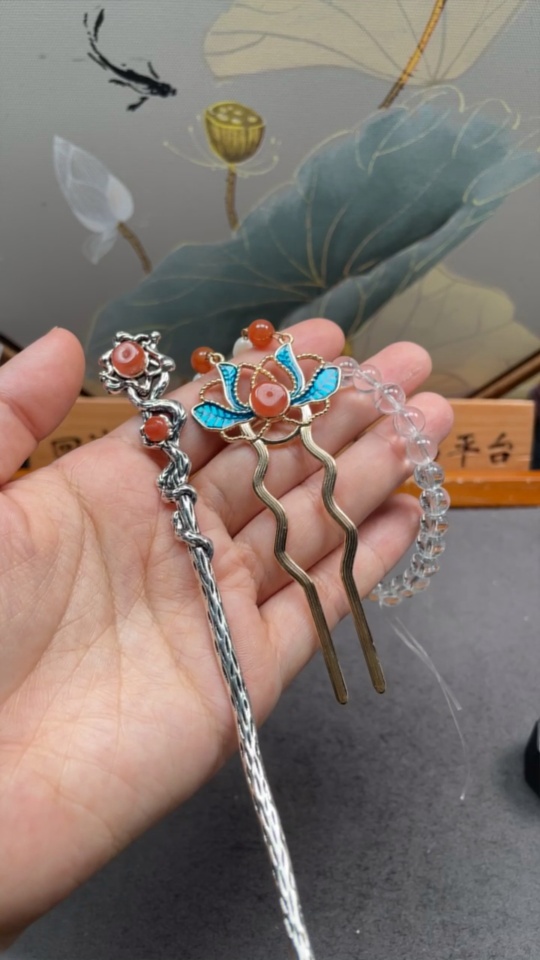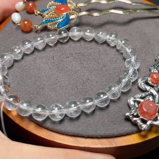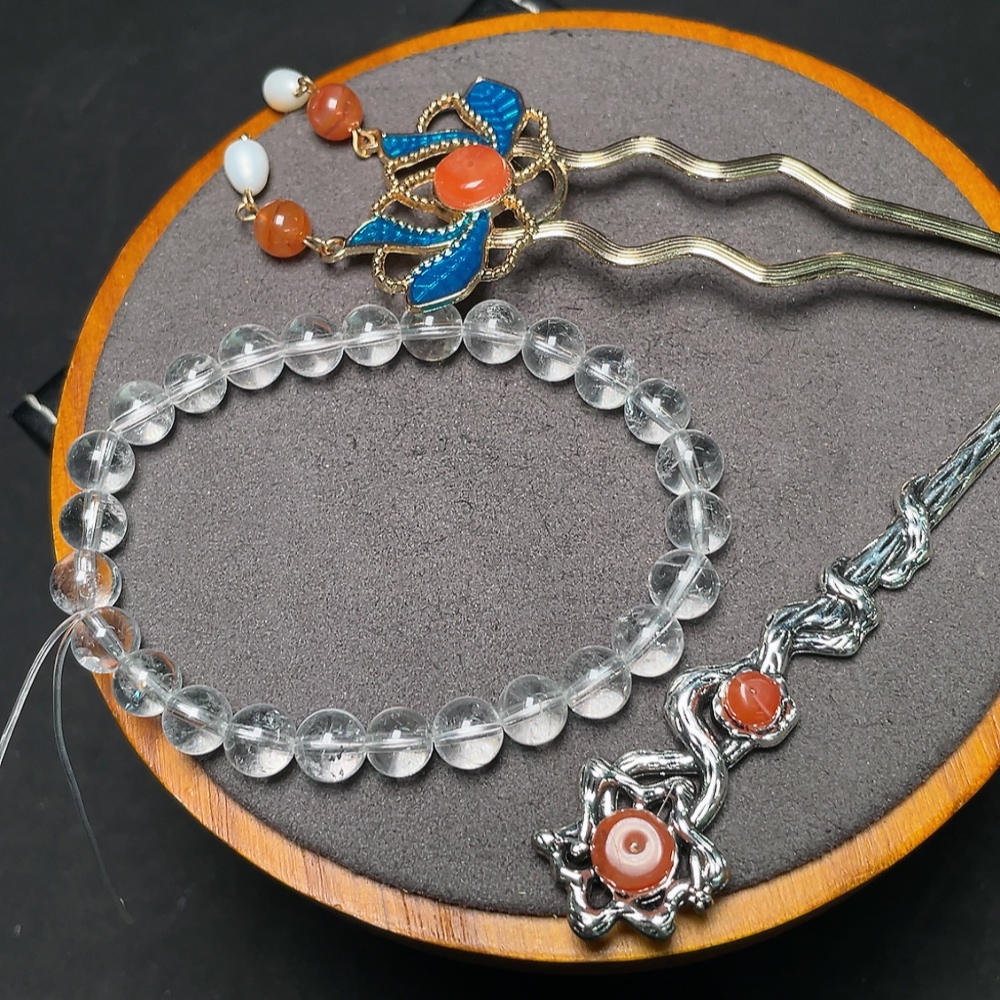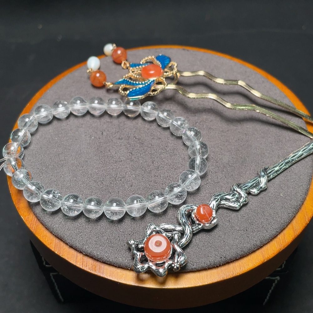South Red Agate Hairpin + South Red Agate with Pearl Hairpin + Crystal Bracelet (Visible organic matter, Total weight approx. 32.14g, Sell as a Lot)