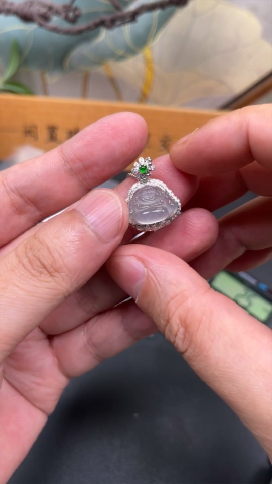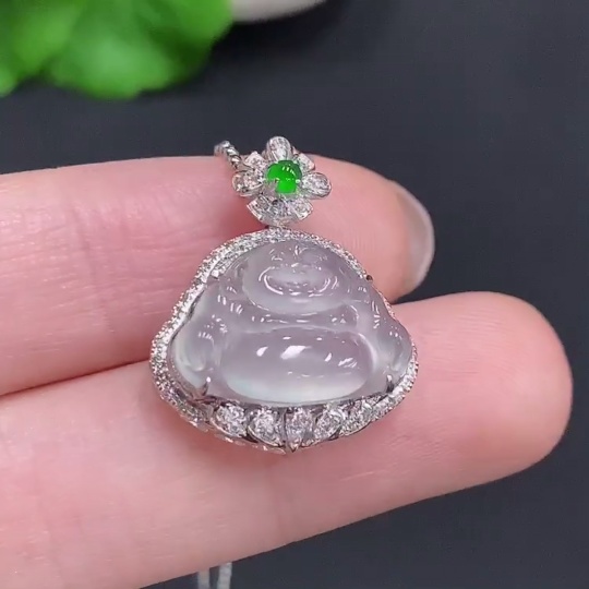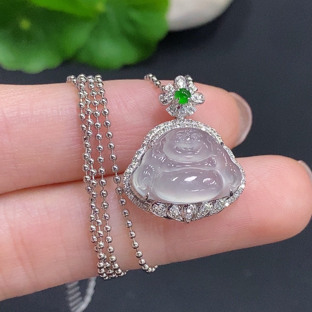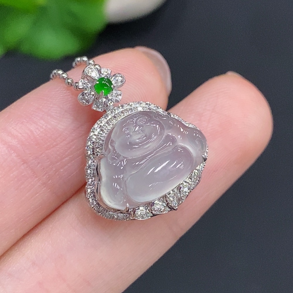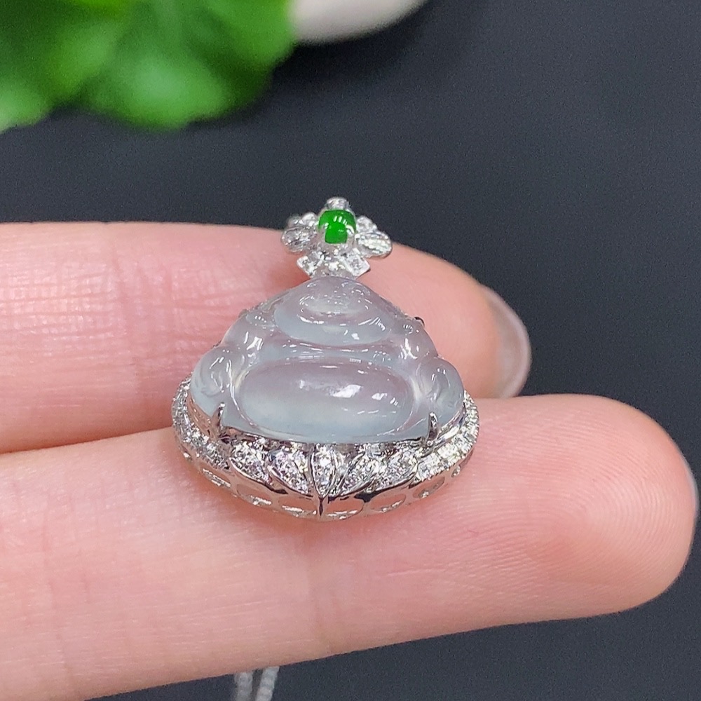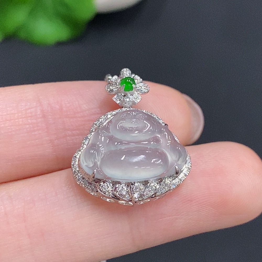 Jadeite Buddha Pendant with 18k Gold and Diamond Accents, Total Weight Approx. 2.2g (Excluding Chain)