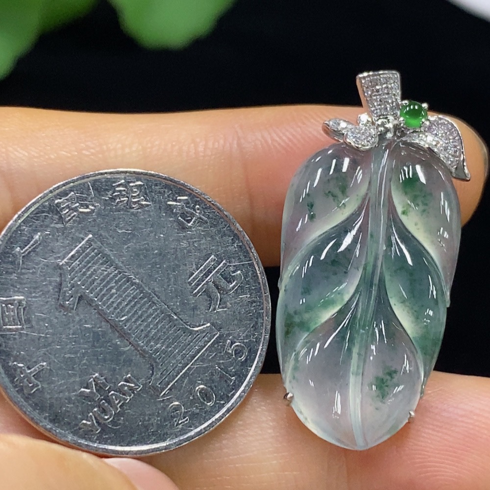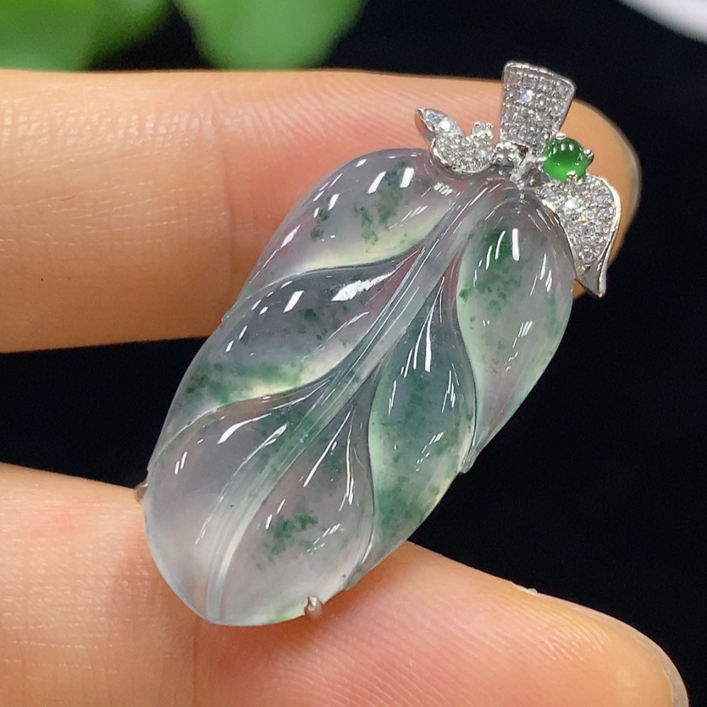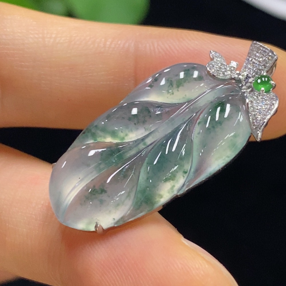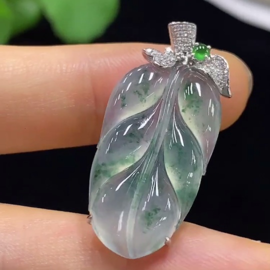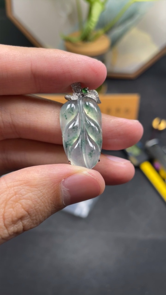 Jadeite Leaf Pendant with 18k Gold and Diamond Accents, Total Weight Approximately 4.77g