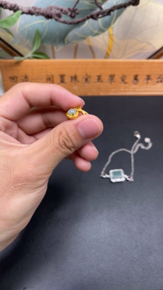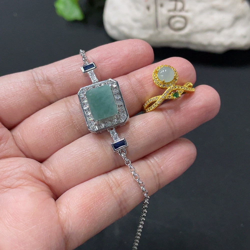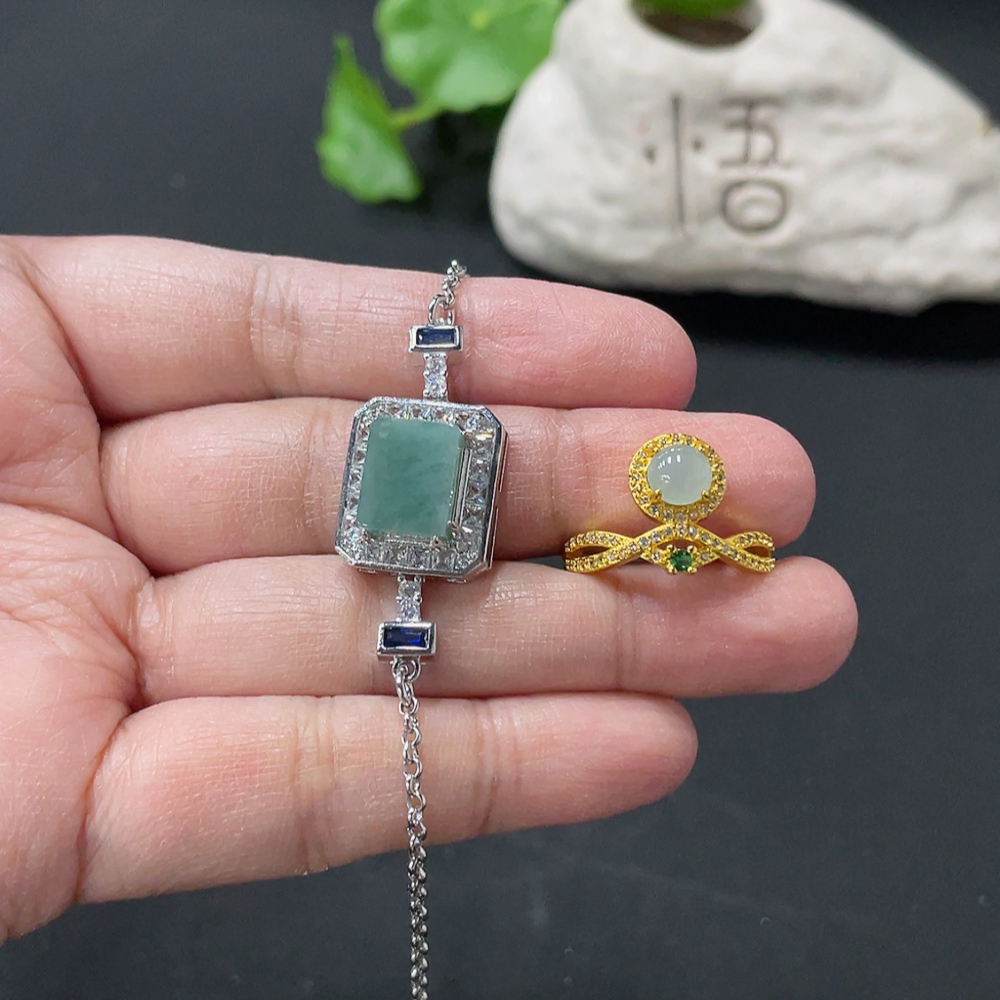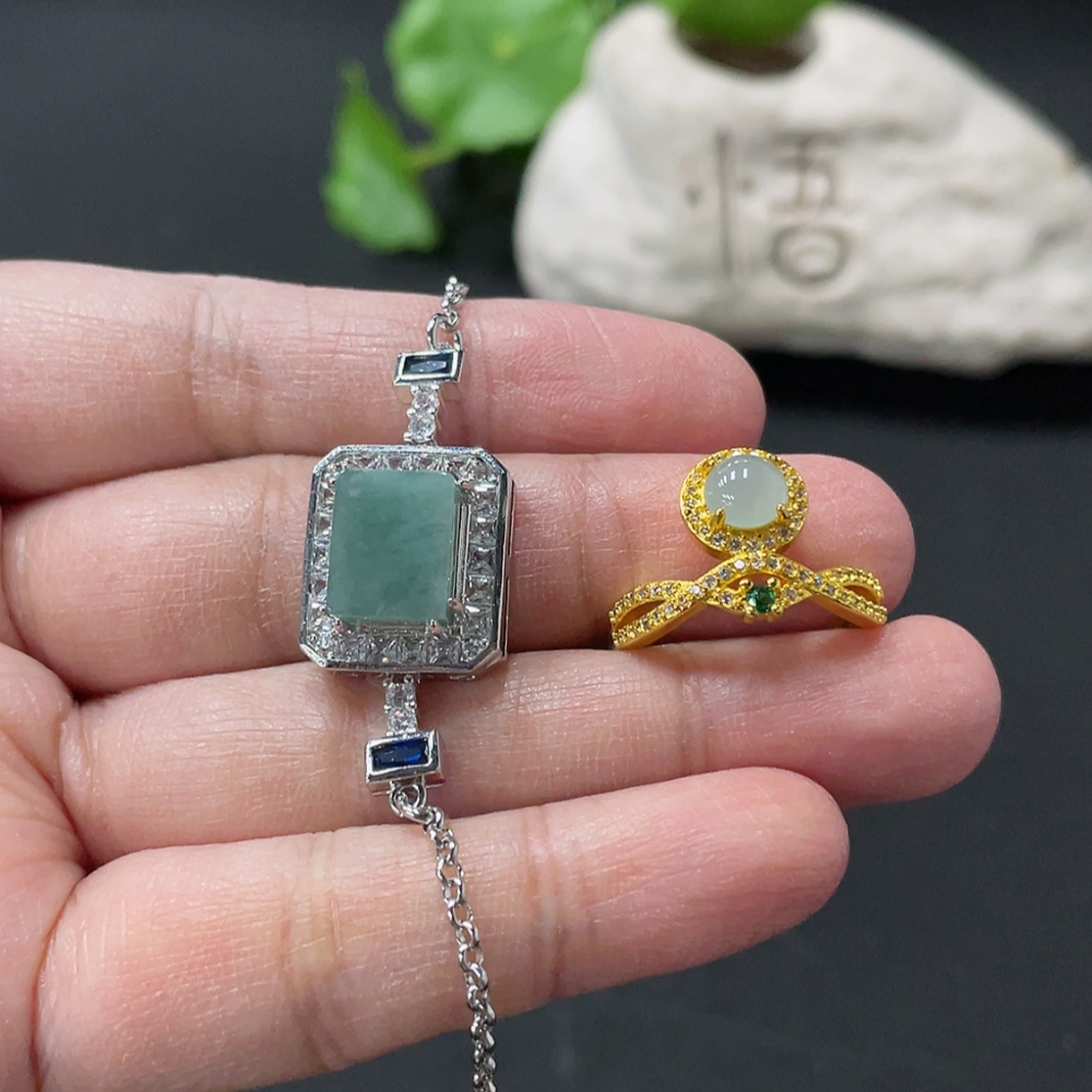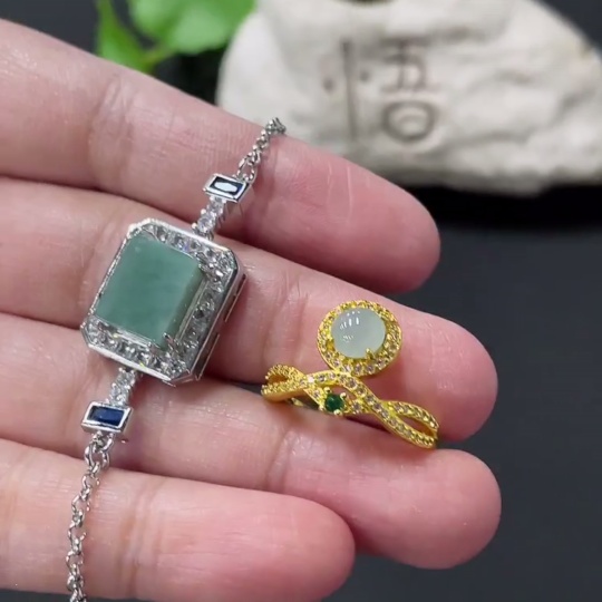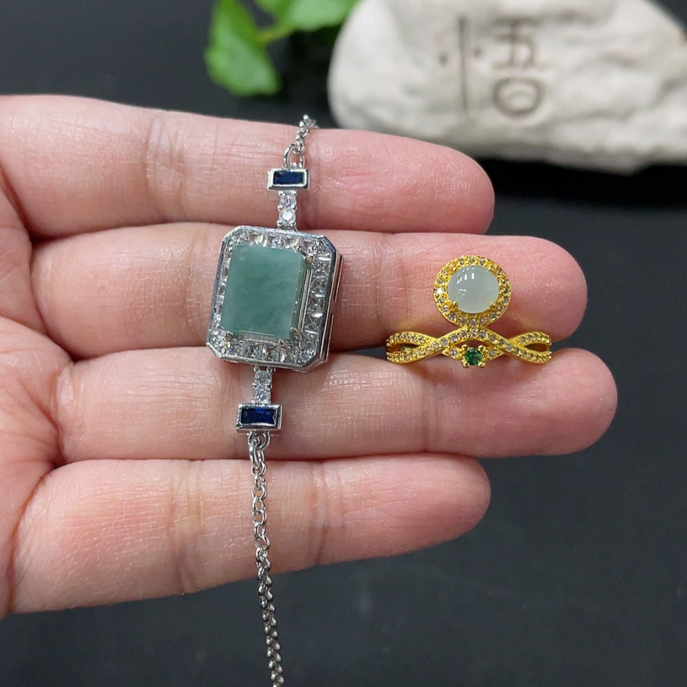 Jadeite Inlay Bracelet + Ring Non-Gold Inlay Adjustable Size