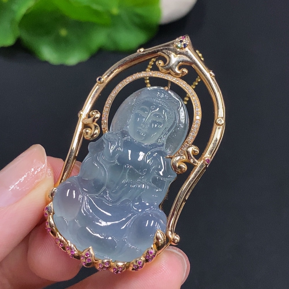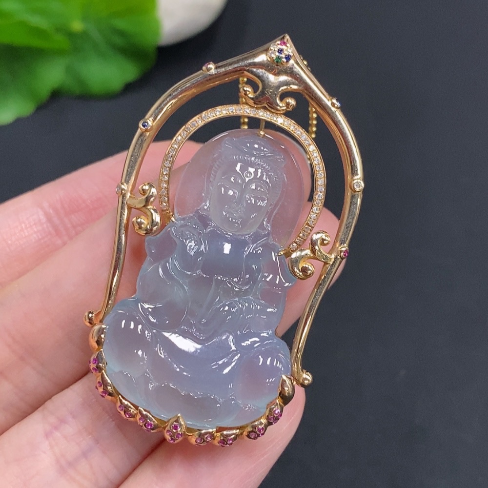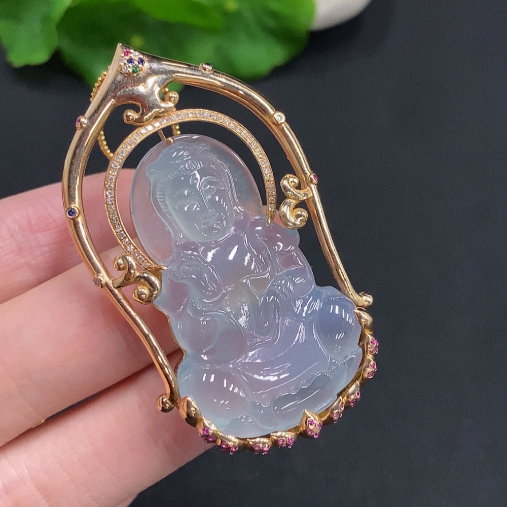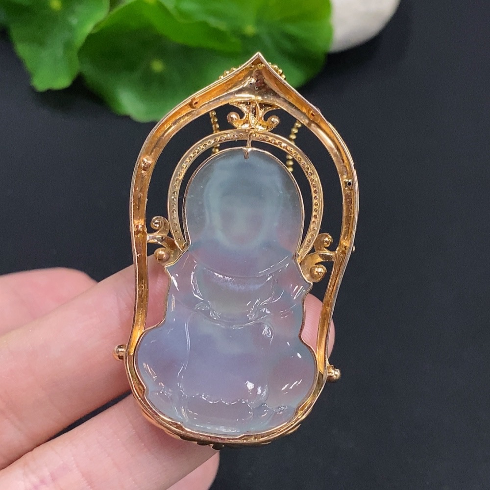 Jadeite Guanyin Pendant with 18K Gold, Non-Gold Chain, Total Weight Approx. 16.3g, Set with Colorless Diamonds