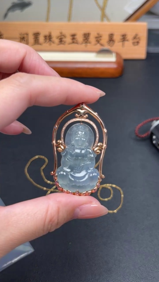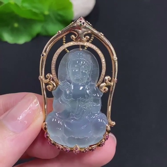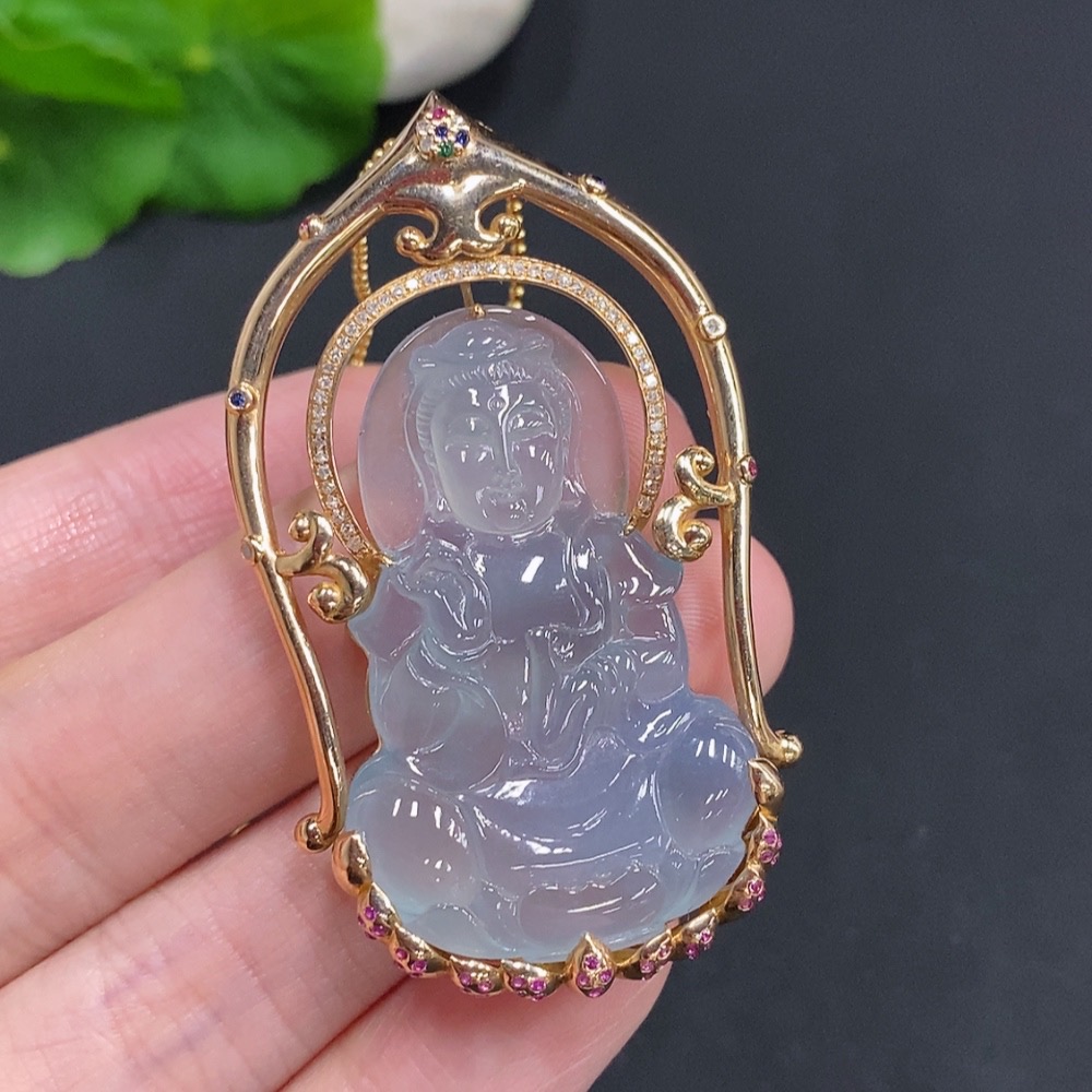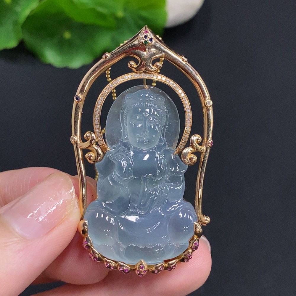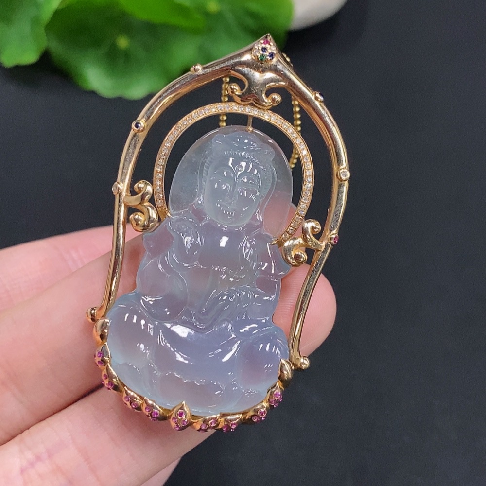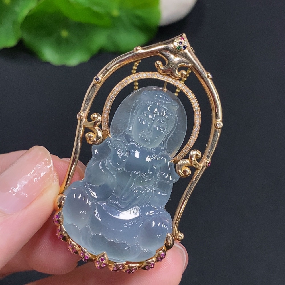 Jadeite Guanyin Pendant with 18K Gold, Non-Gold Chain, Total Weight Approx. 16.3g, Set with Colorless Diamonds
