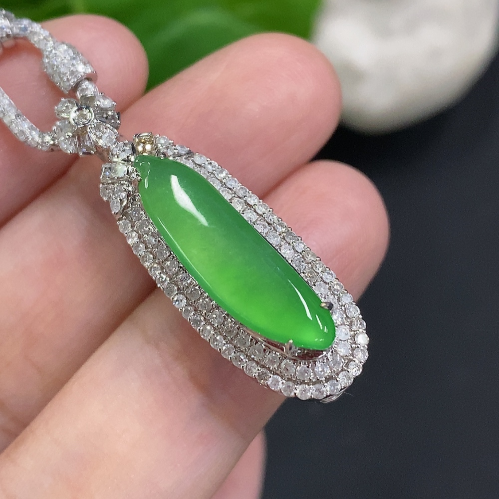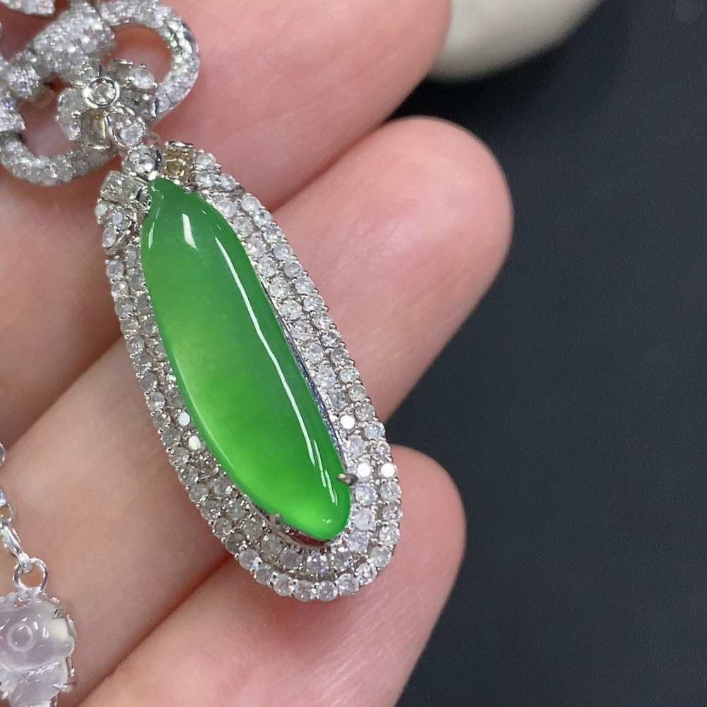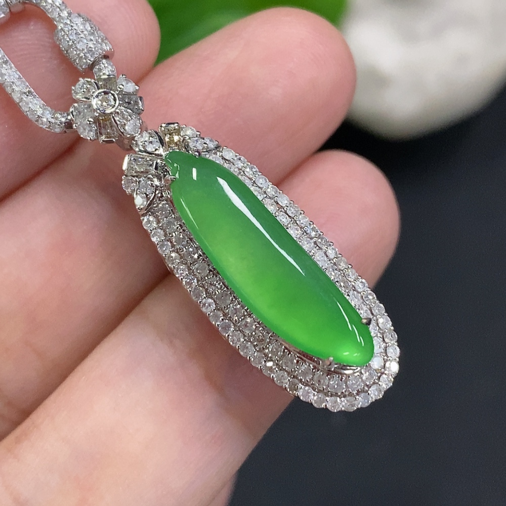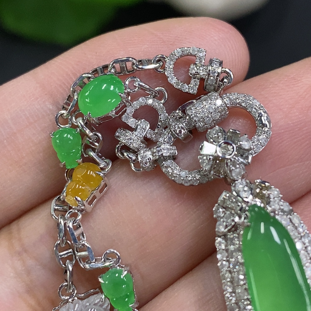 Jadeite Blessing Melon Pendant with 18K Gold and Diamond Accents, Total Weight Approx. 11.3g Including Chain