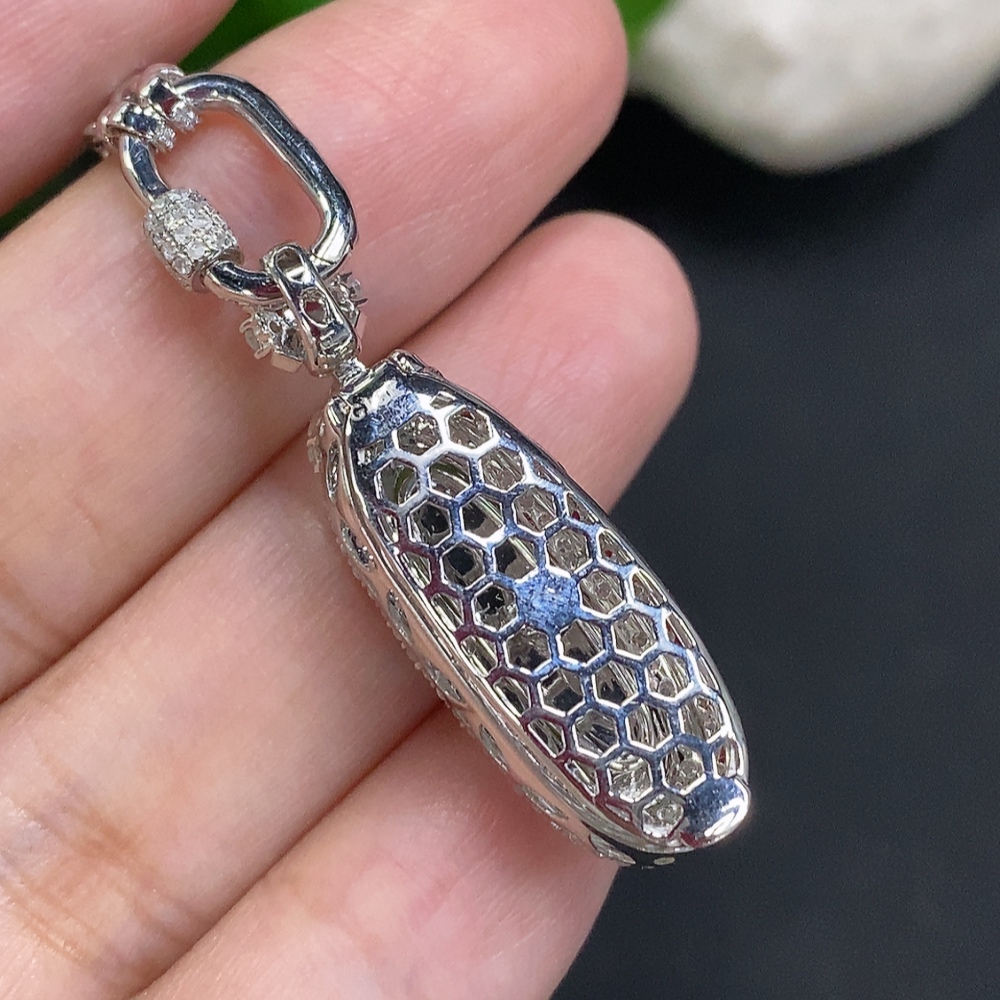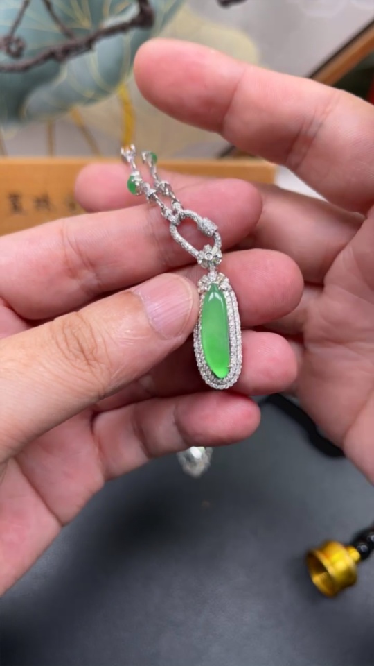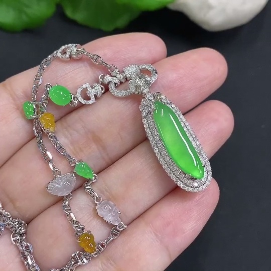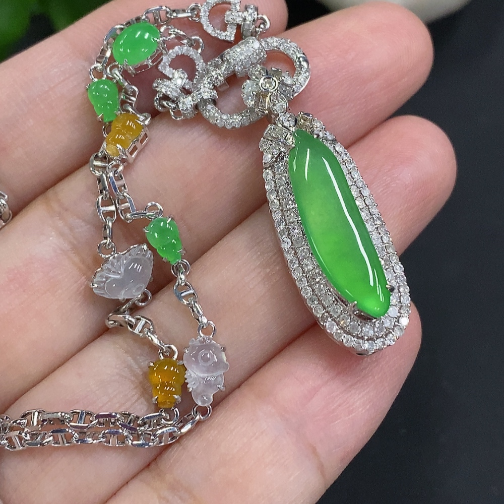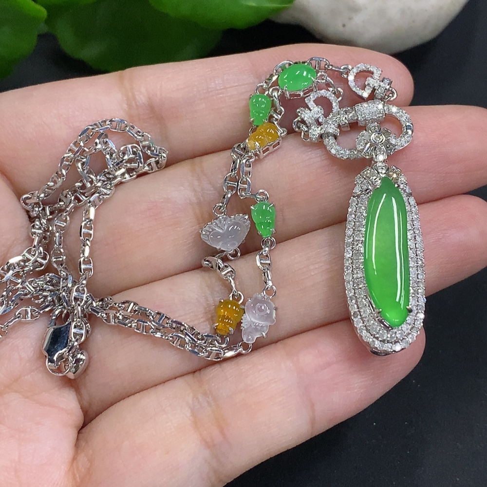 Jadeite Blessing Melon Pendant with 18K Gold and Diamond Accents, Total Weight Approx. 11.3g Including Chain