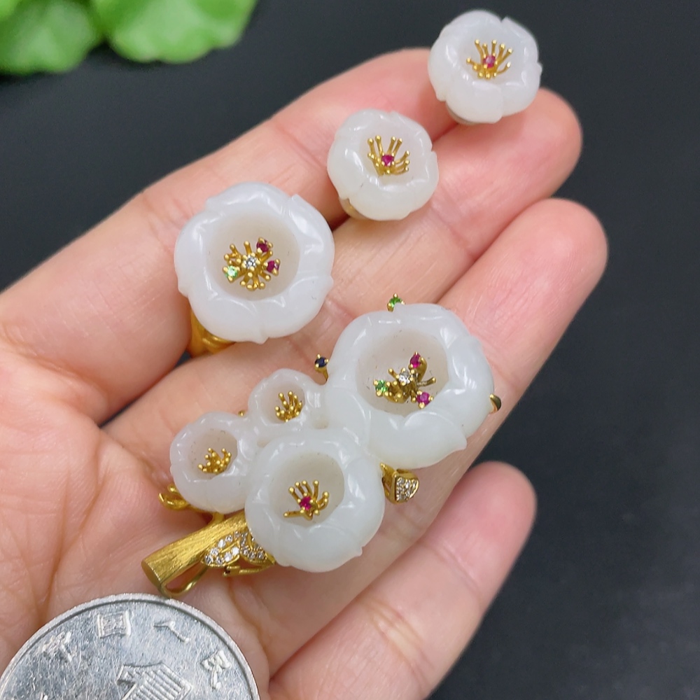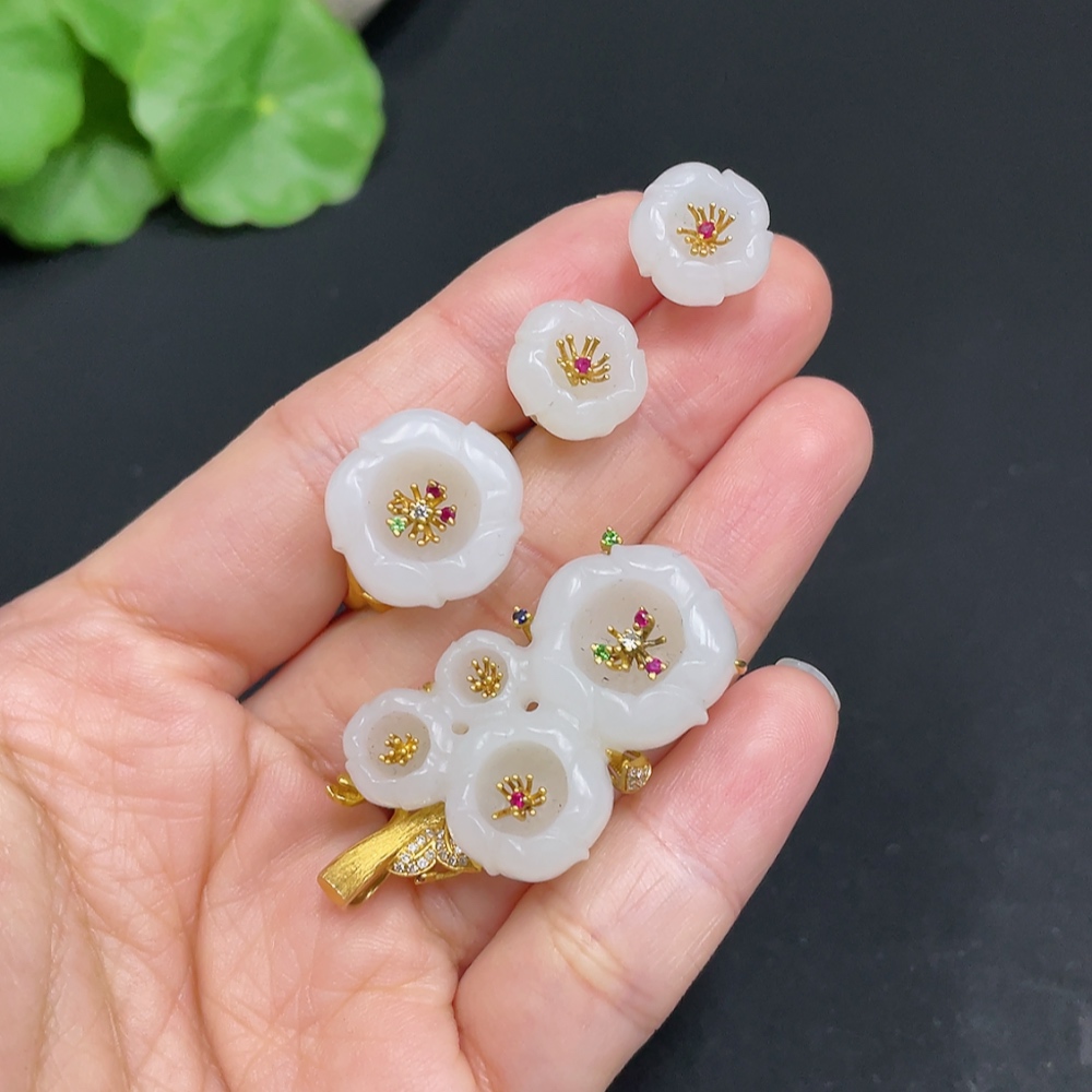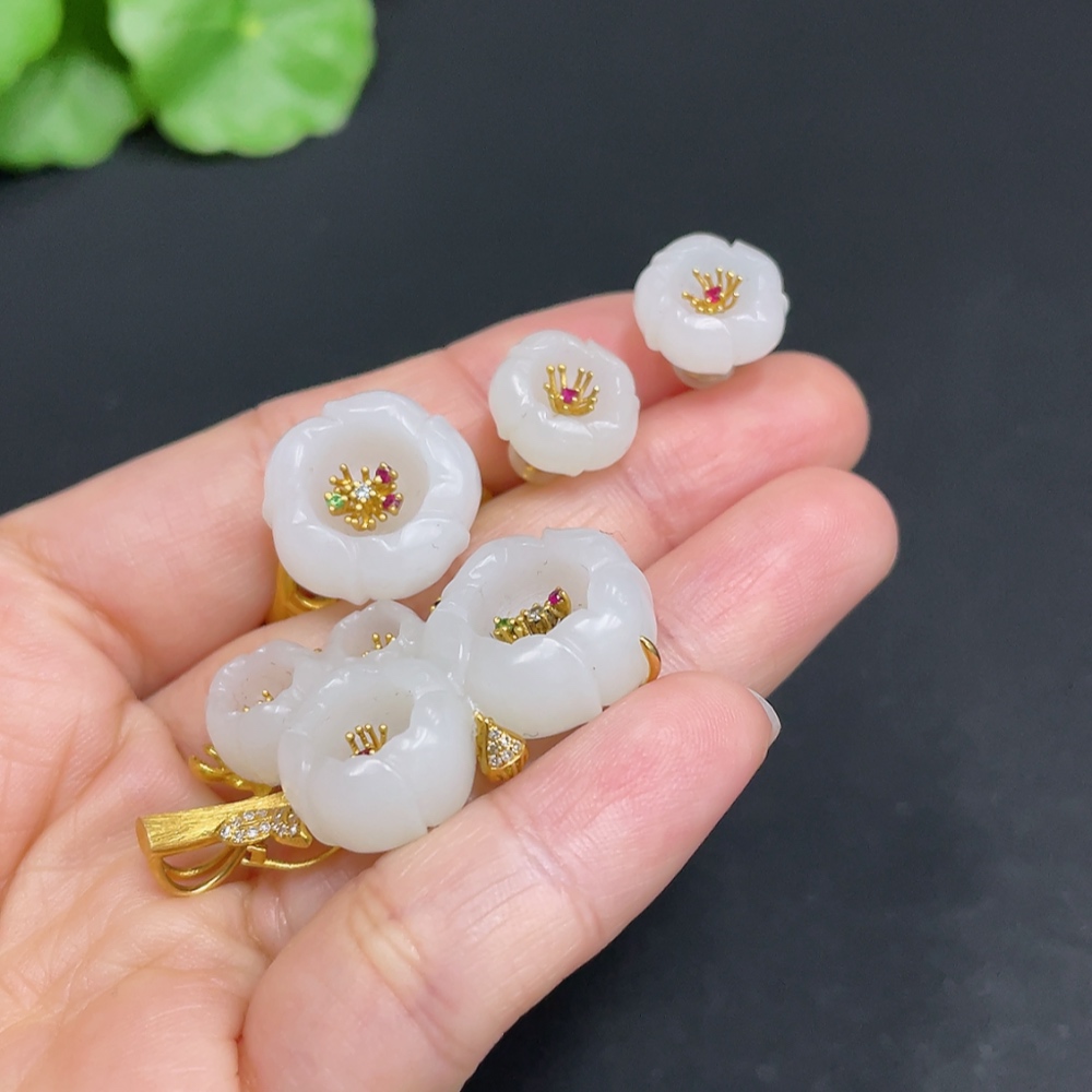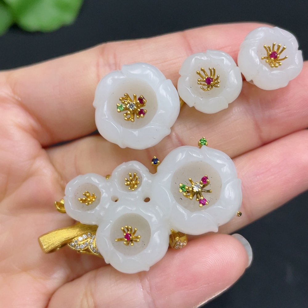Hetian Jade Inlaid Pendant Earrings Ring Size 17 18k Gold Total Weight Approx. (Including Ear Studs) 18.2g Diamond Accents