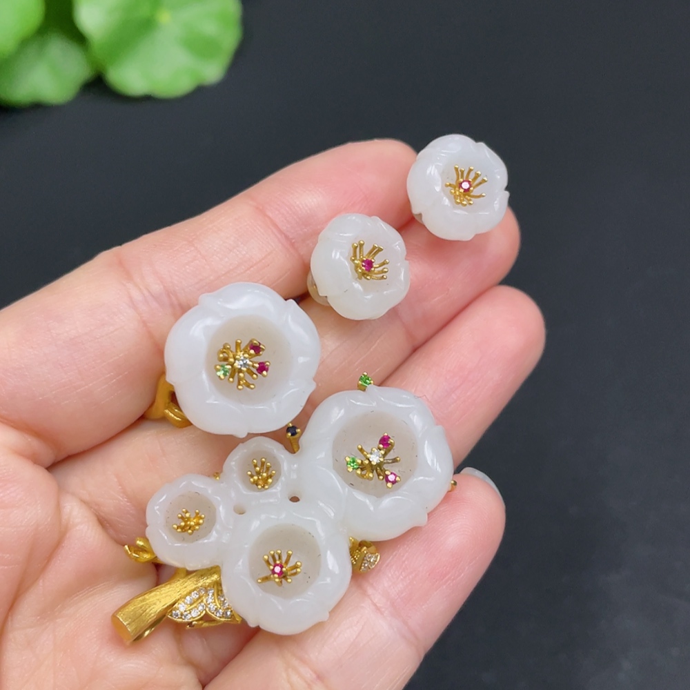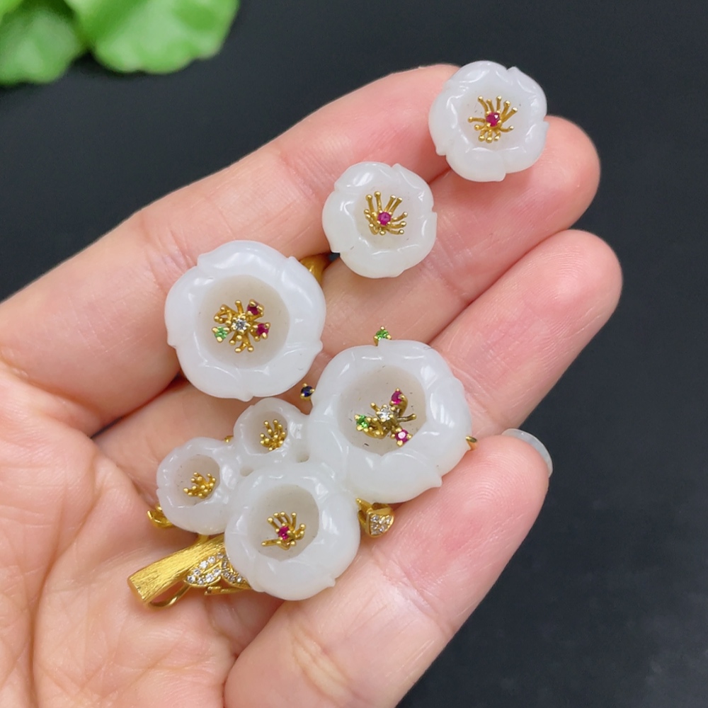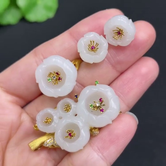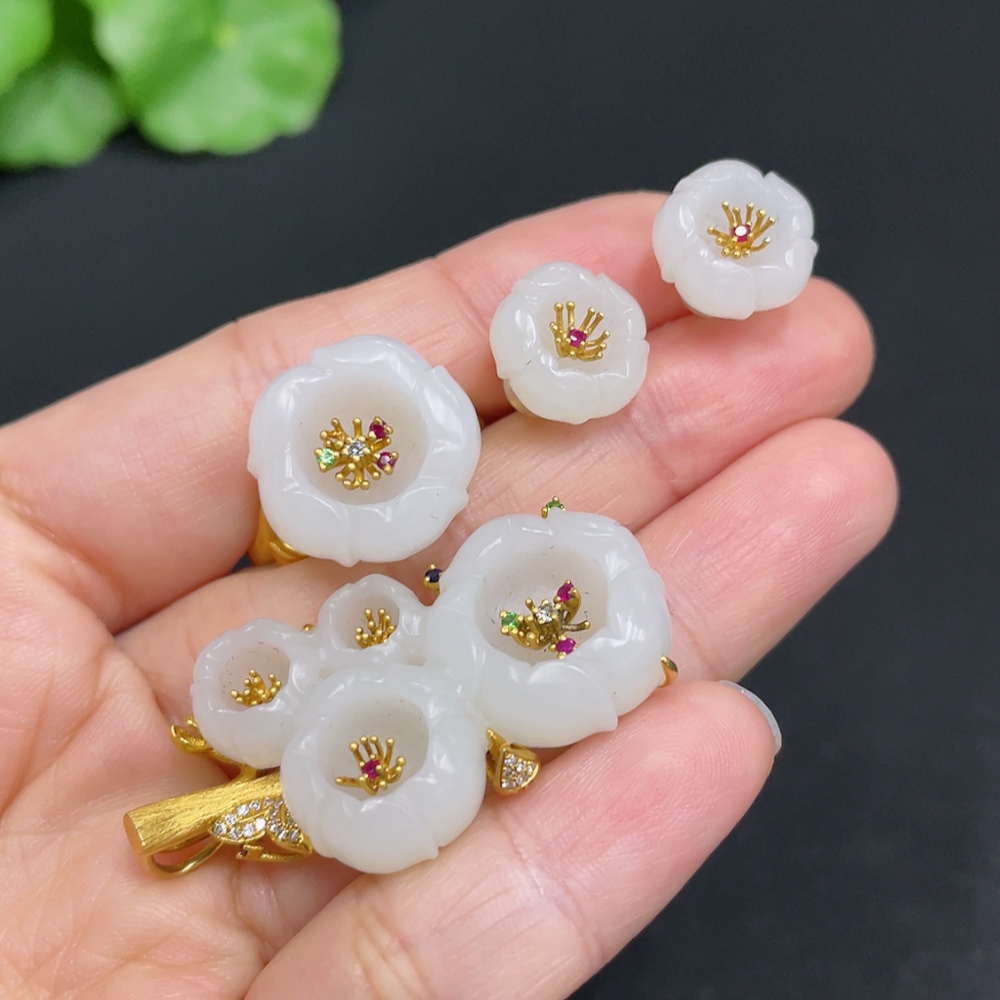 Hetian Jade Inlaid Pendant Earrings Ring Size 17 18k Gold Total Weight Approx. (Including Ear Studs) 18.2g Diamond Accents