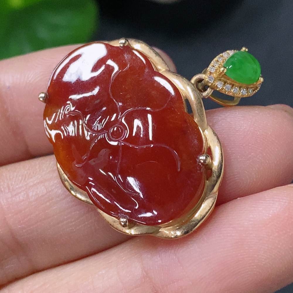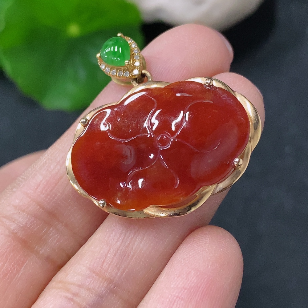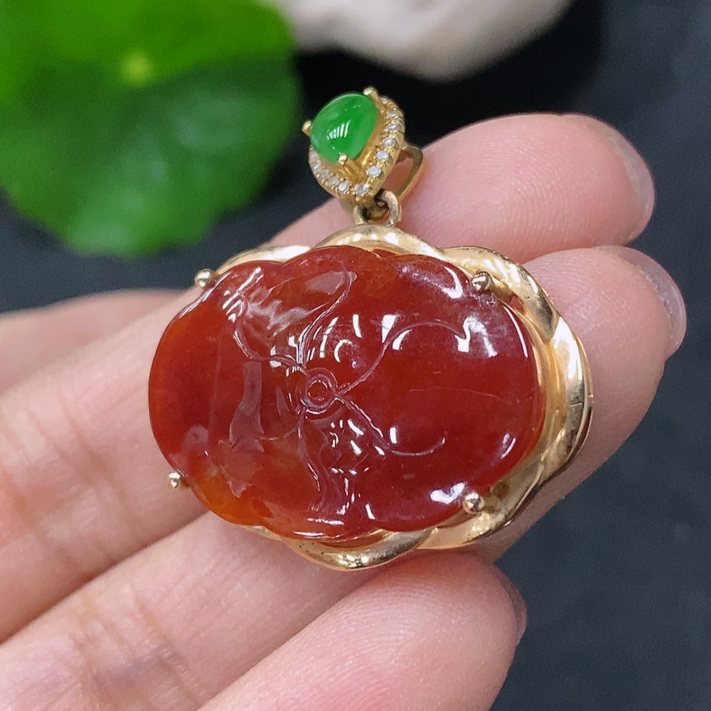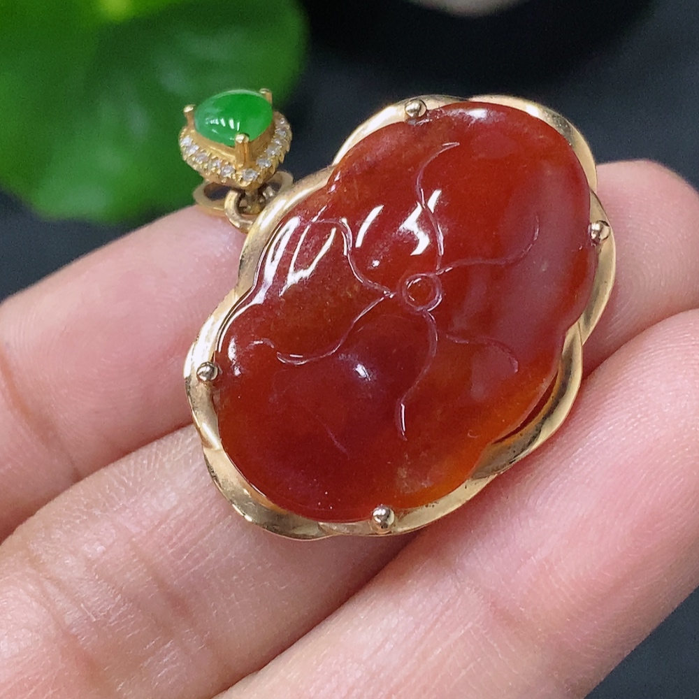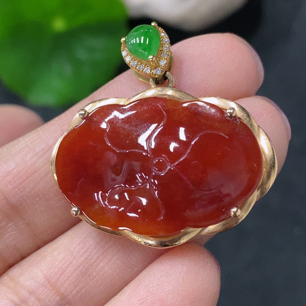 Jadeite Inlaid Lotus Leaf Pendant with 18k Gold and Diamonds, Total Weight Approximately 4.64g