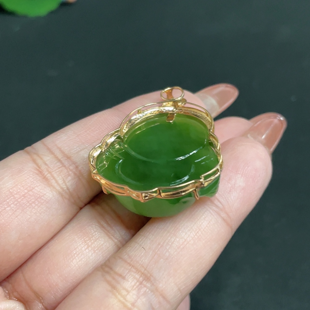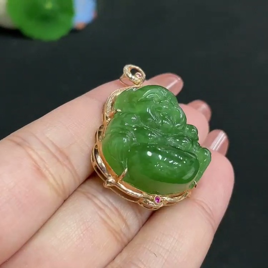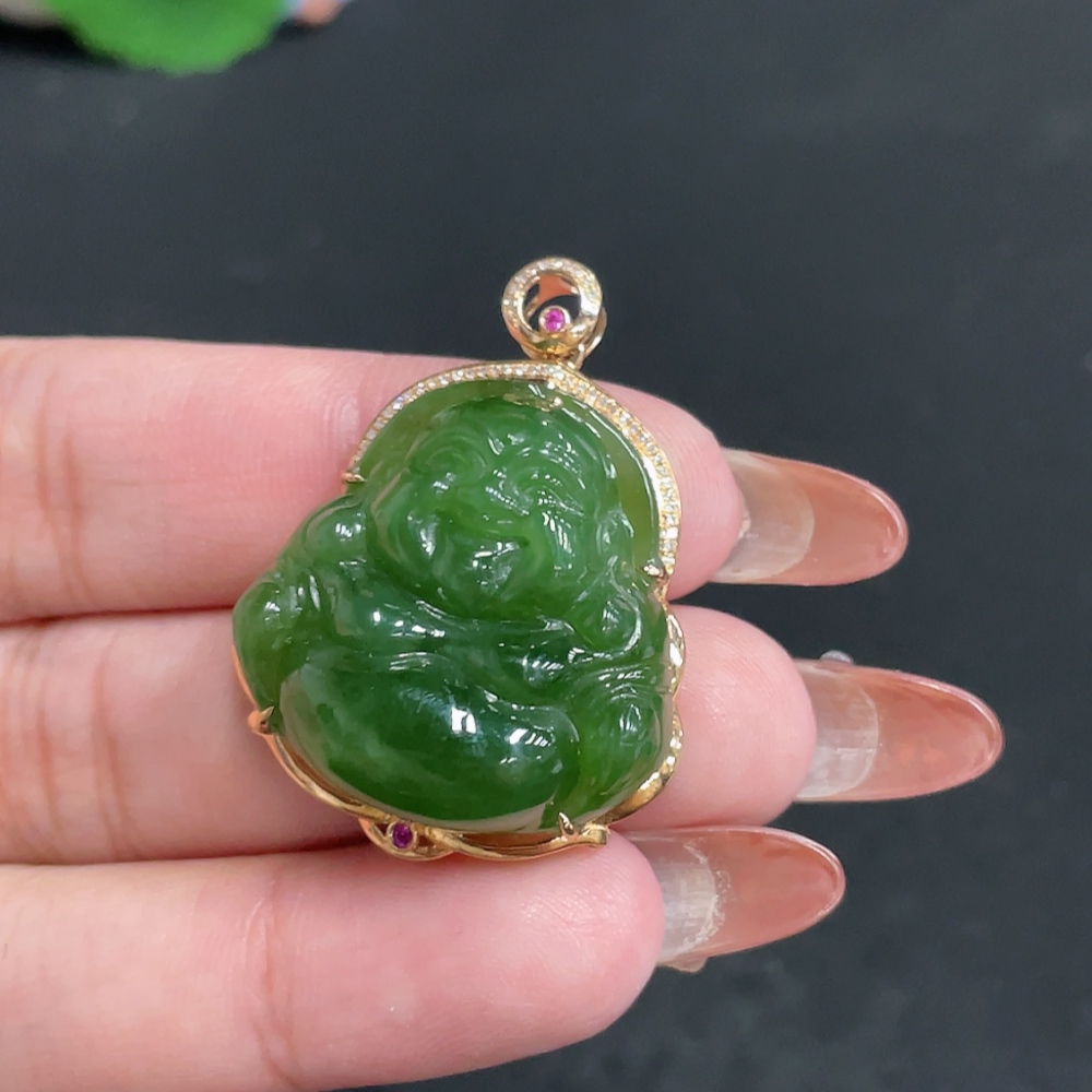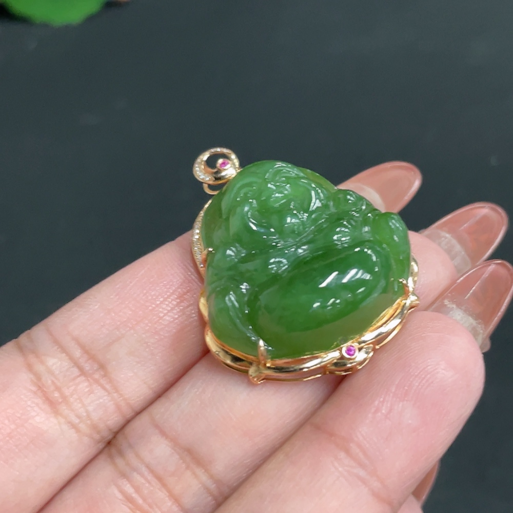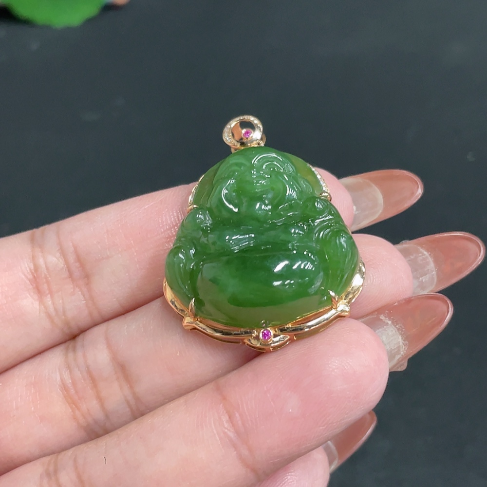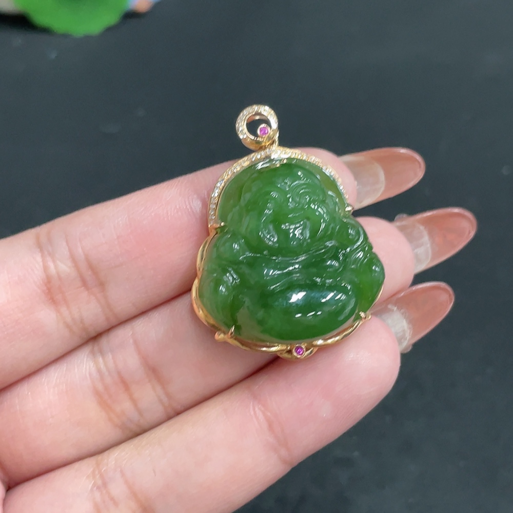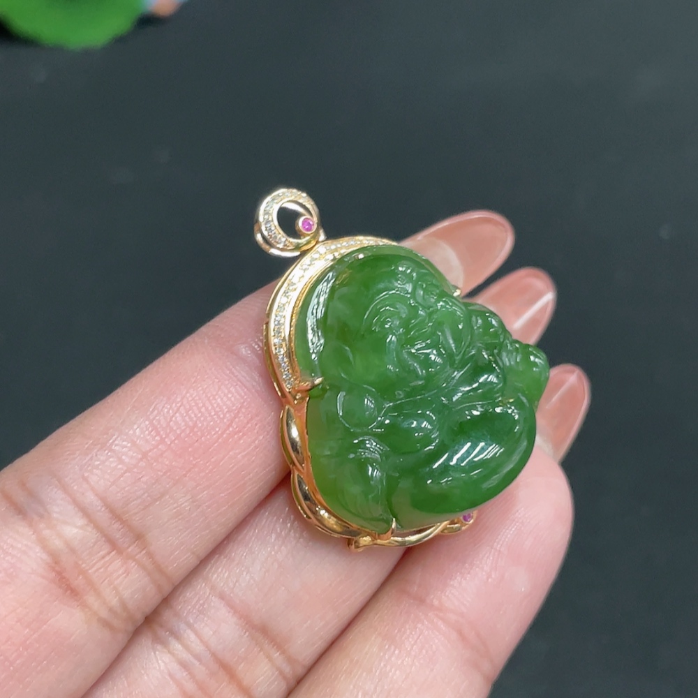 Hetian Jade Jasper Inlaid Pendant - Buddha, Total Weight Approx. 11.6g, 18k, Inlaid with Colorless Diamonds