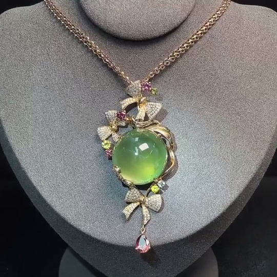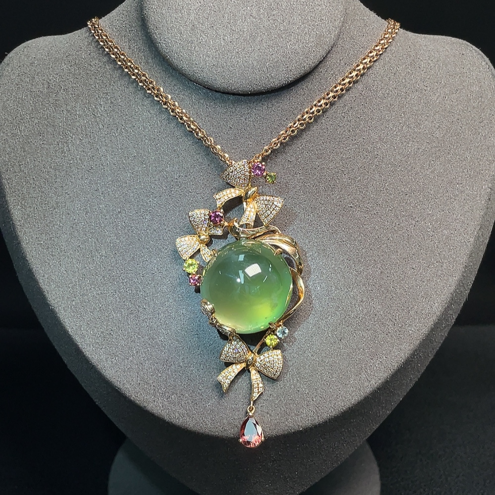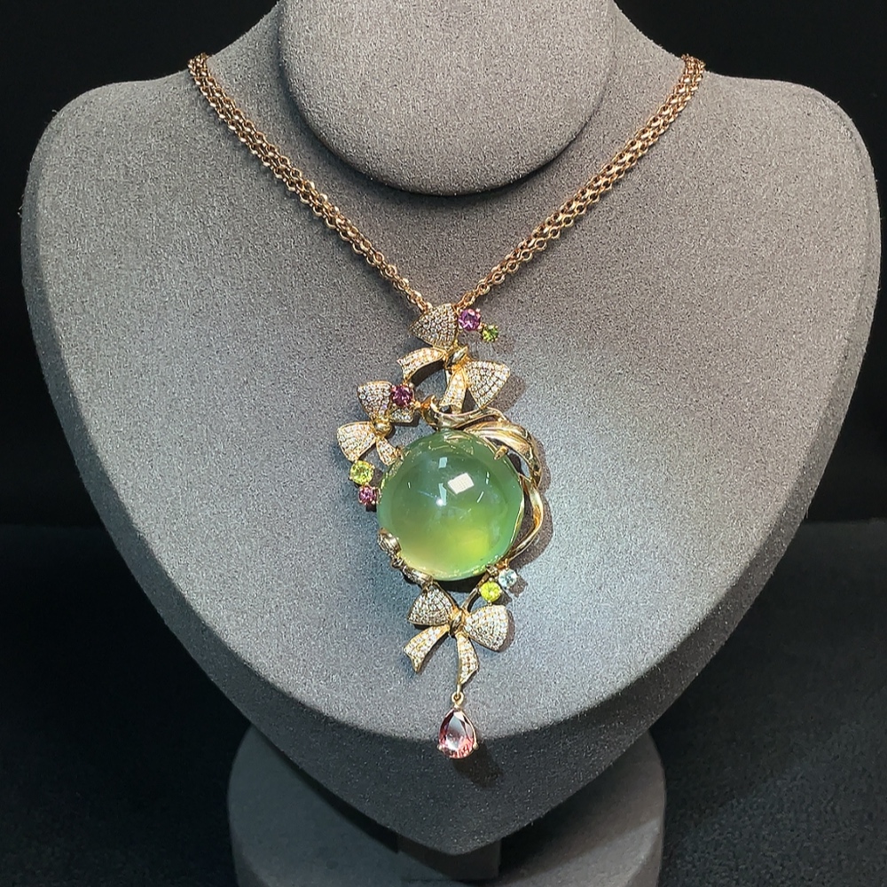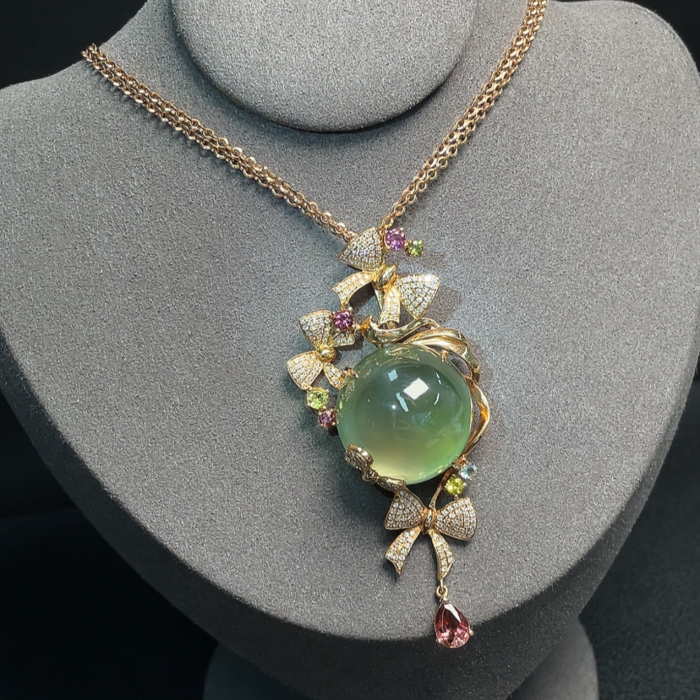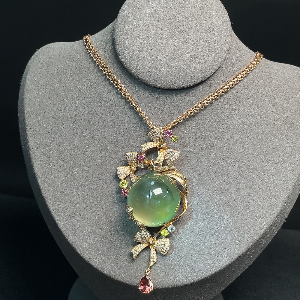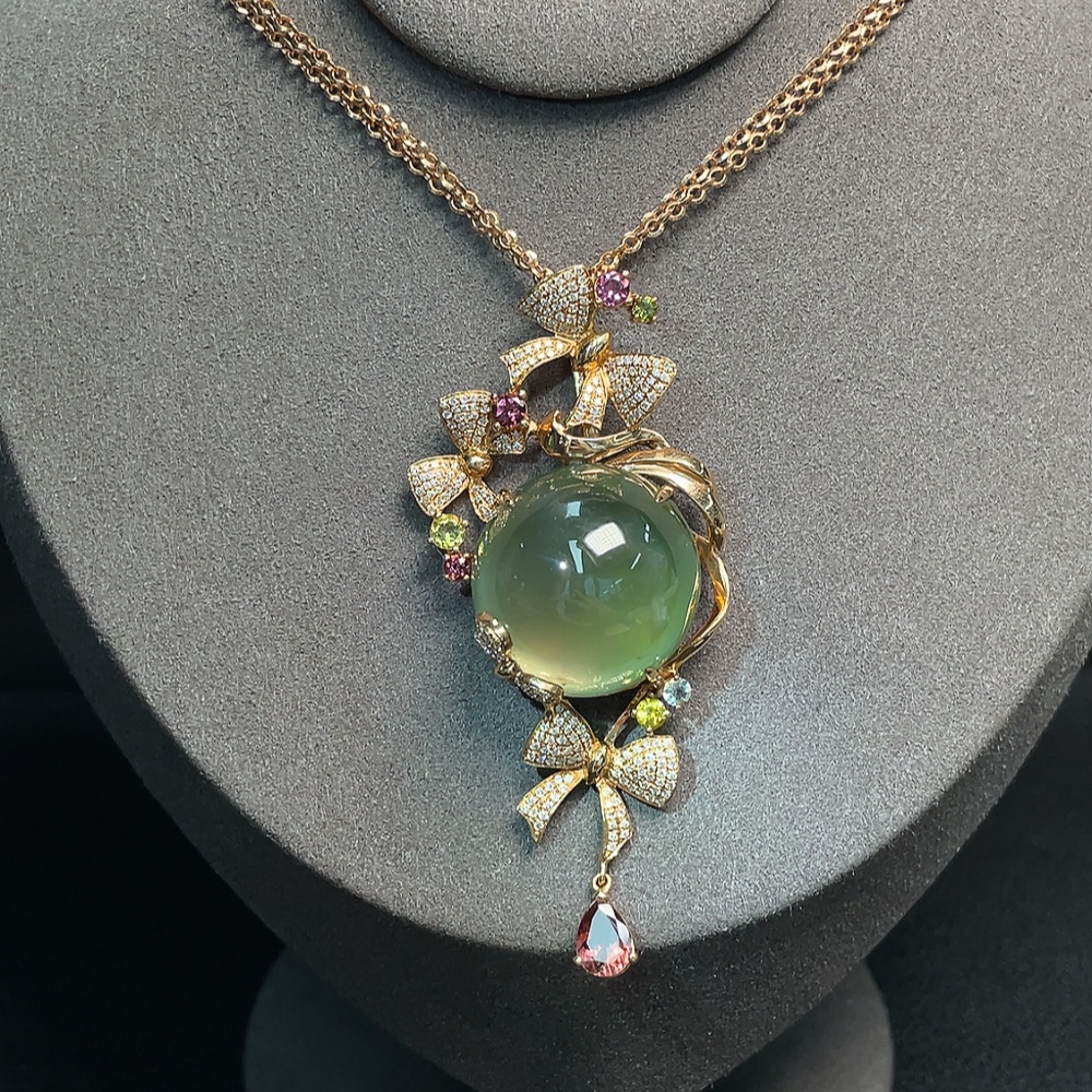 Prehnite Pendant 18K Gold with Colorless Diamond Accents and Tourmaline, Accent Stones May Be Non-Natural, Total Weight Approximately 32.65g Including Chain