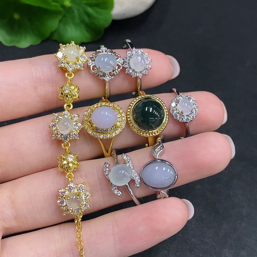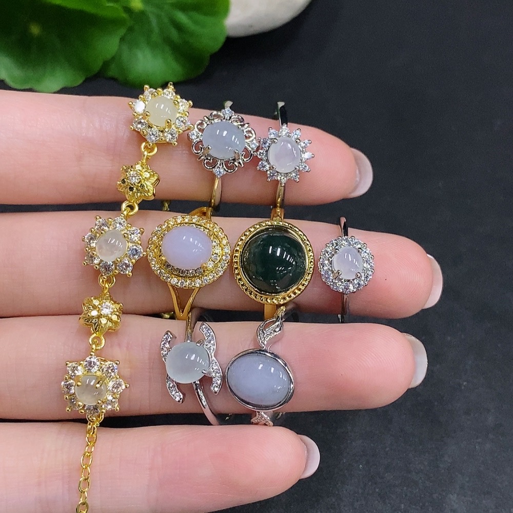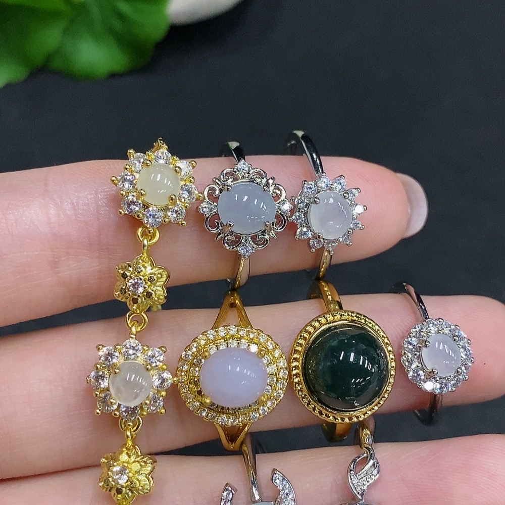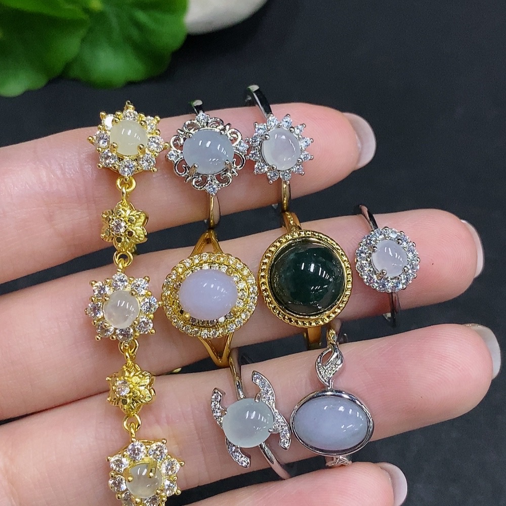Jadeite Cabochon Mounted Pieces Sell as a Lot Non-Gold Mounting Adjustable Size
