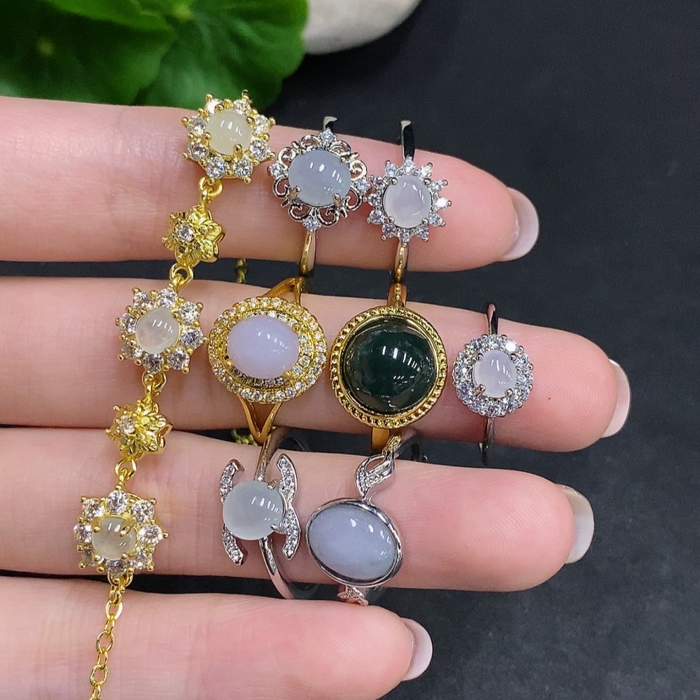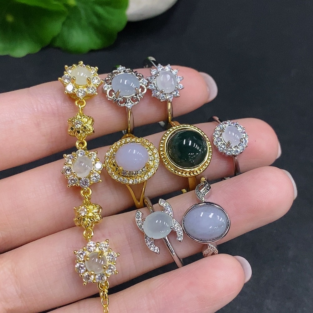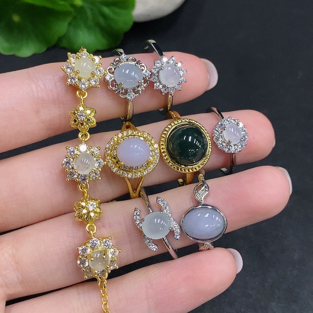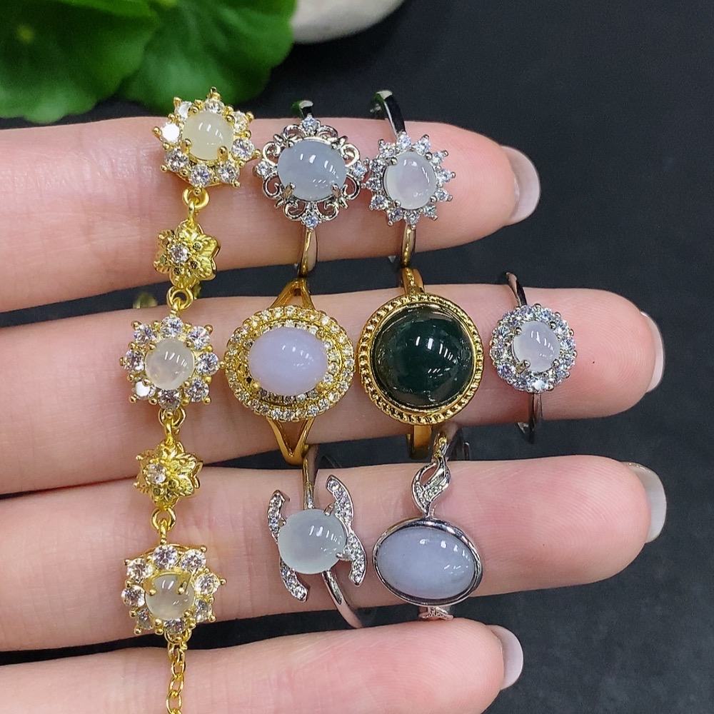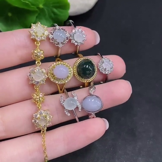 Jadeite Cabochon Mounted Pieces Sell as a Lot Non-Gold Mounting Adjustable Size