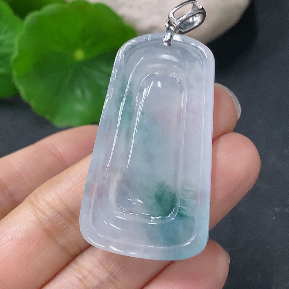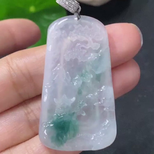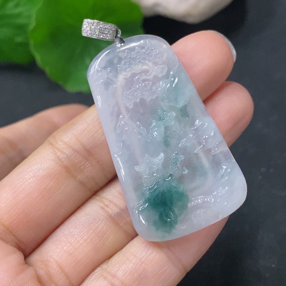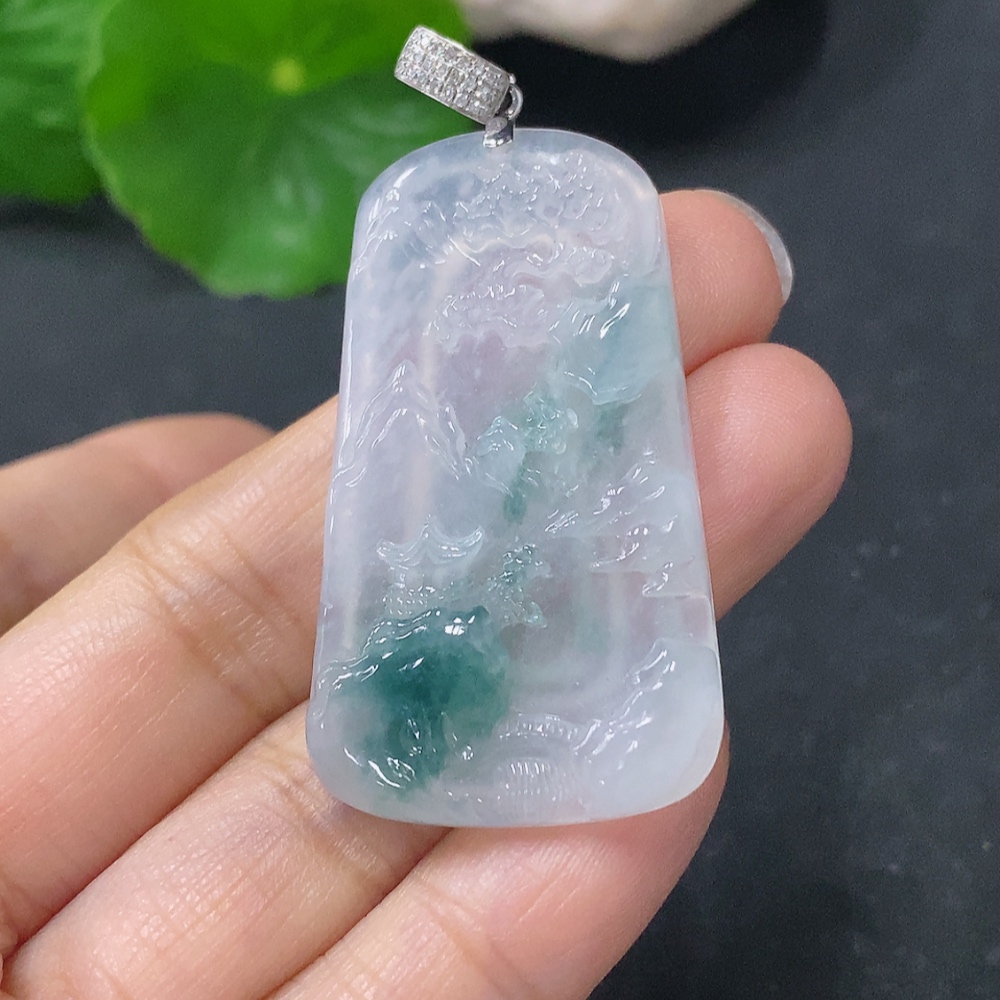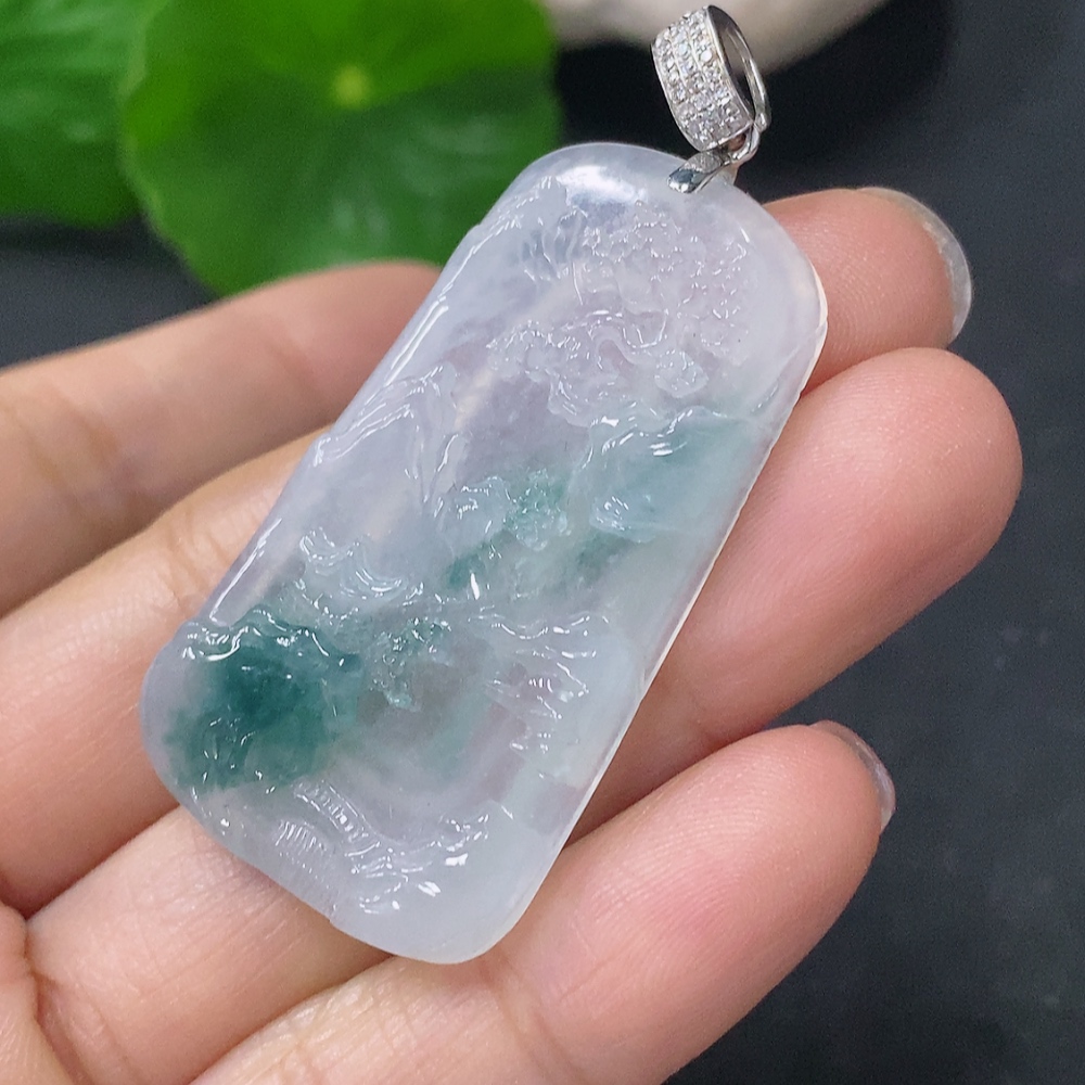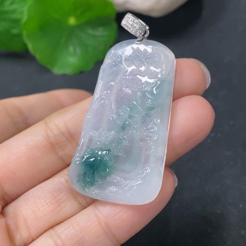 Jadeite Pendant Landscape Plaque with 18K Gold and Diamond Accents, Total Weight Approximately 12.97g