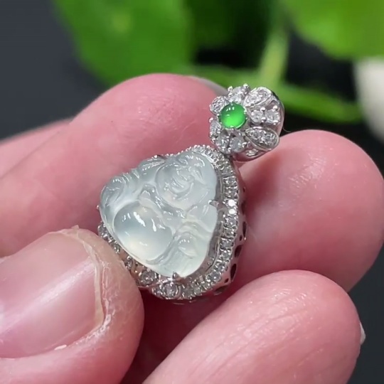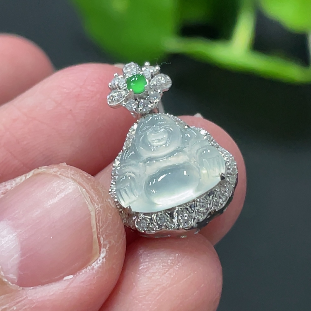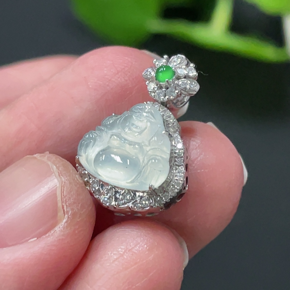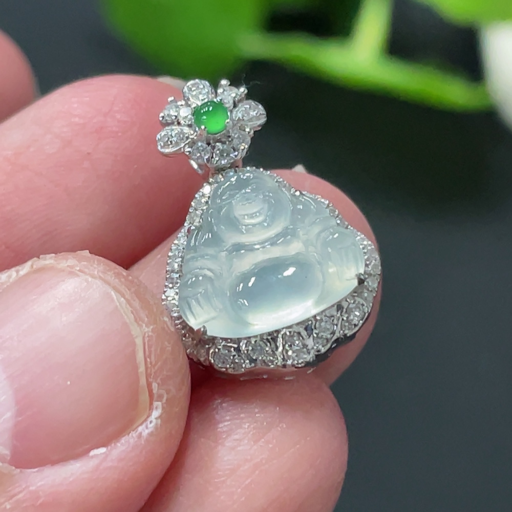 Jadeite Buddha Pendant with 18K Gold and Diamond Accents, Total Weight Approximately 2g