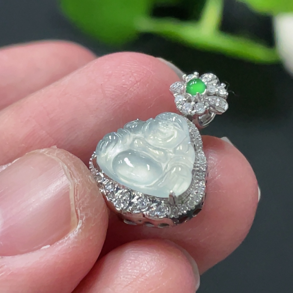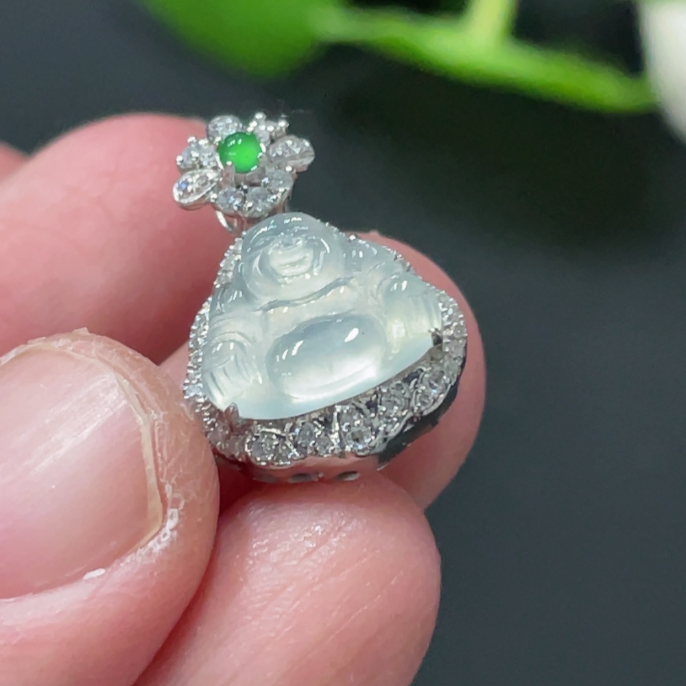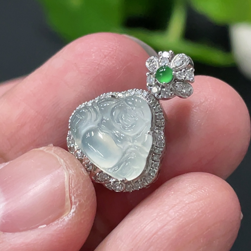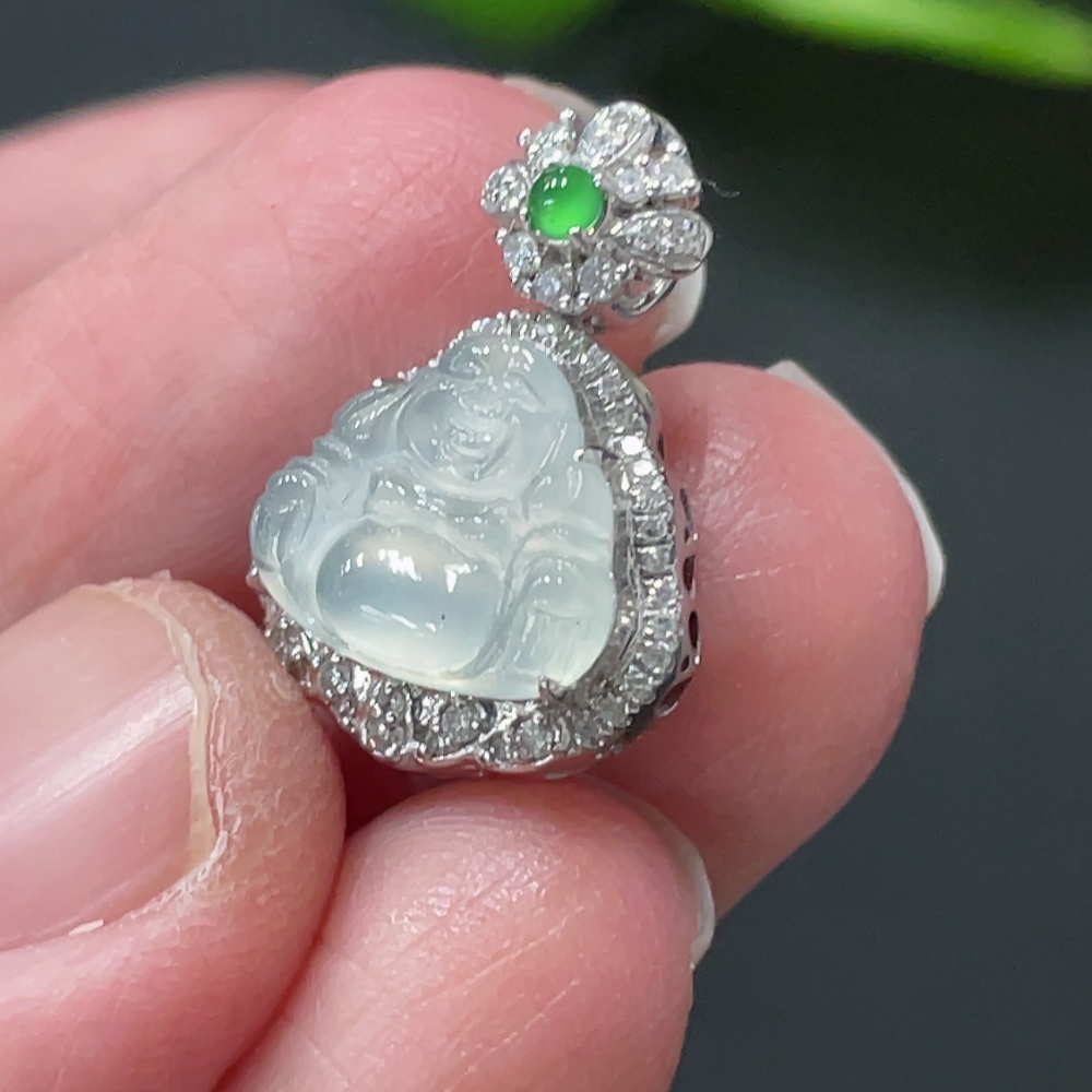 Jadeite Buddha Pendant with 18K Gold and Diamond Accents, Total Weight Approximately 2g