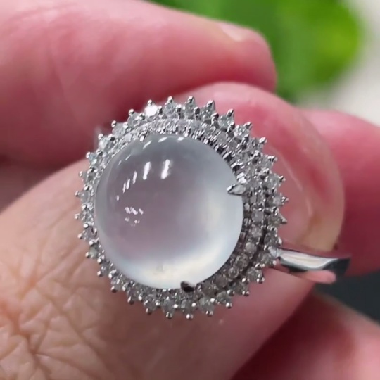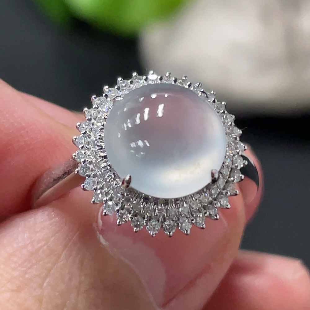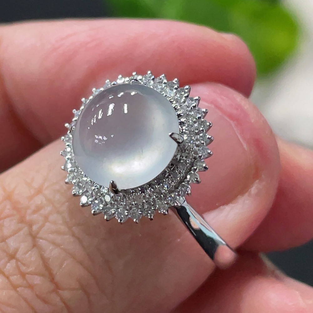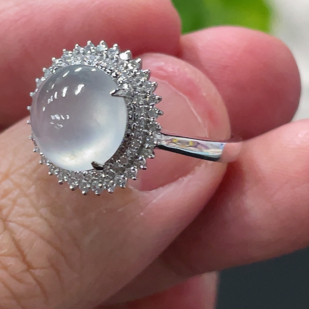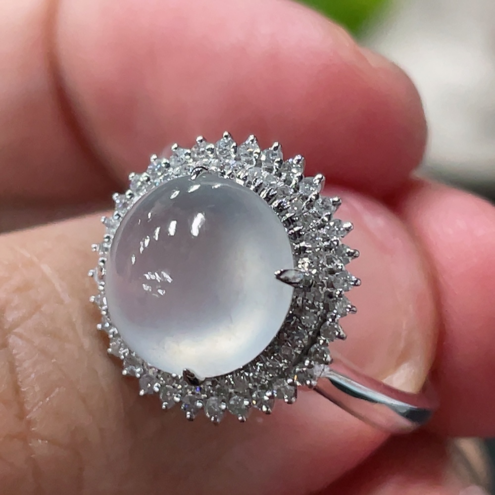 Jadeite Cabochon Ring with 18K Gold Setting, Size 14, Total Weight Approx. 3.17g, Accented with Diamonds