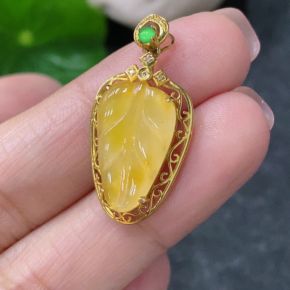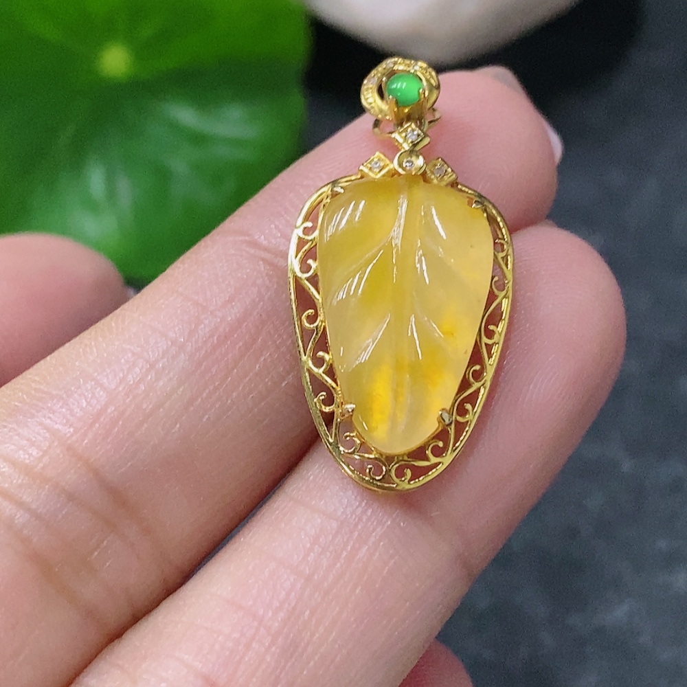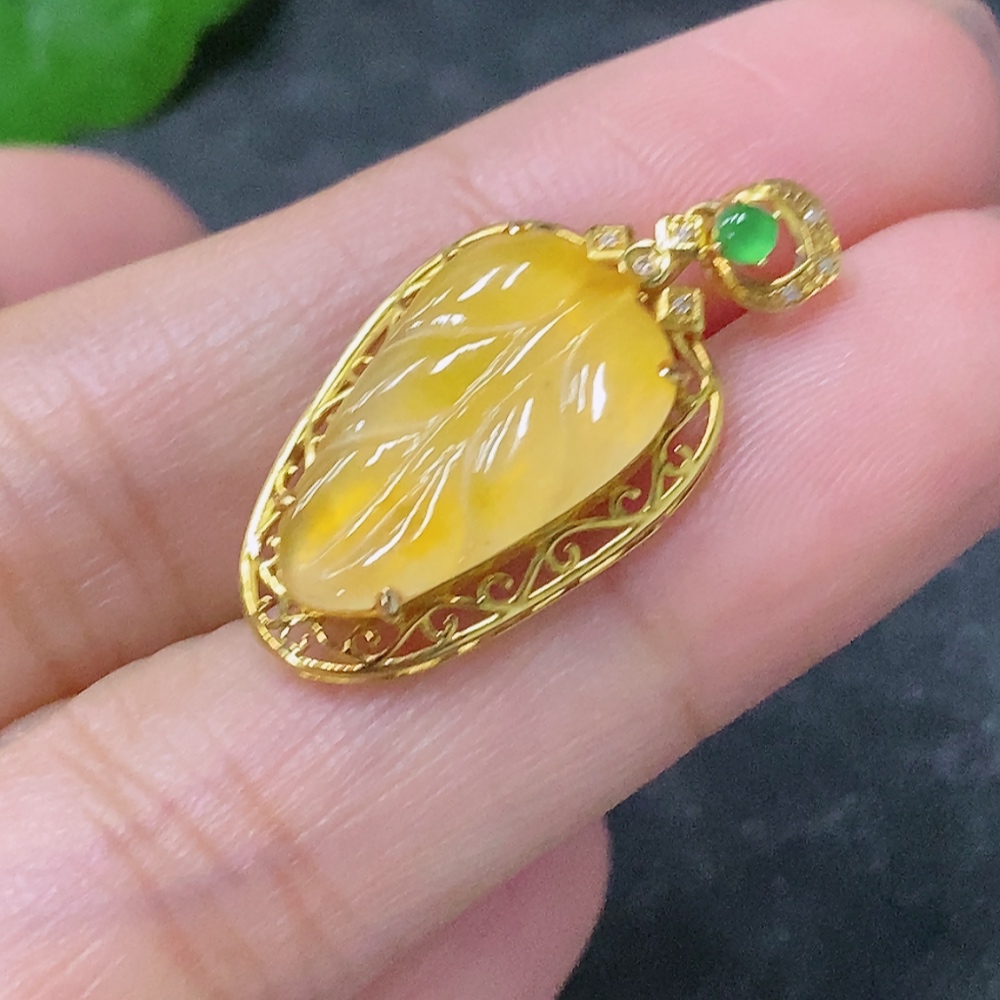 Jadeite inlaid leaf pendant with 18k gold and diamond accents, total product weight approximately 1.91g, color origin of yellow parts undetermined