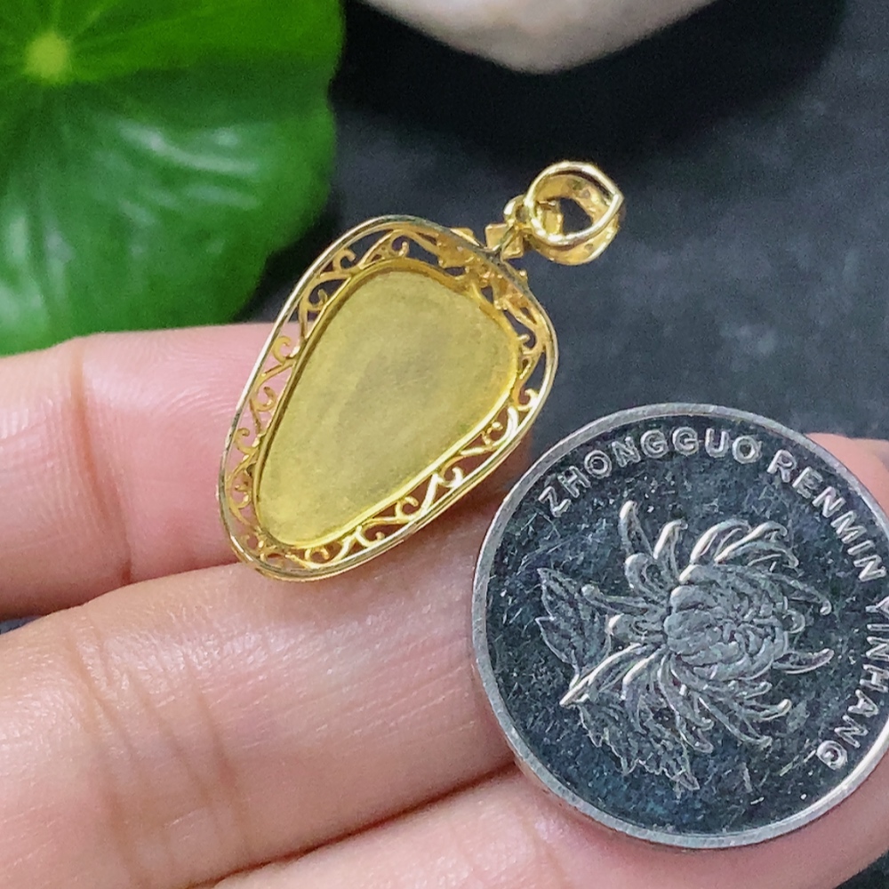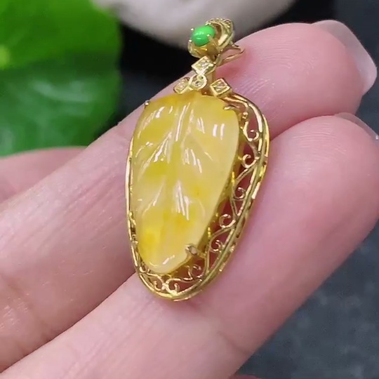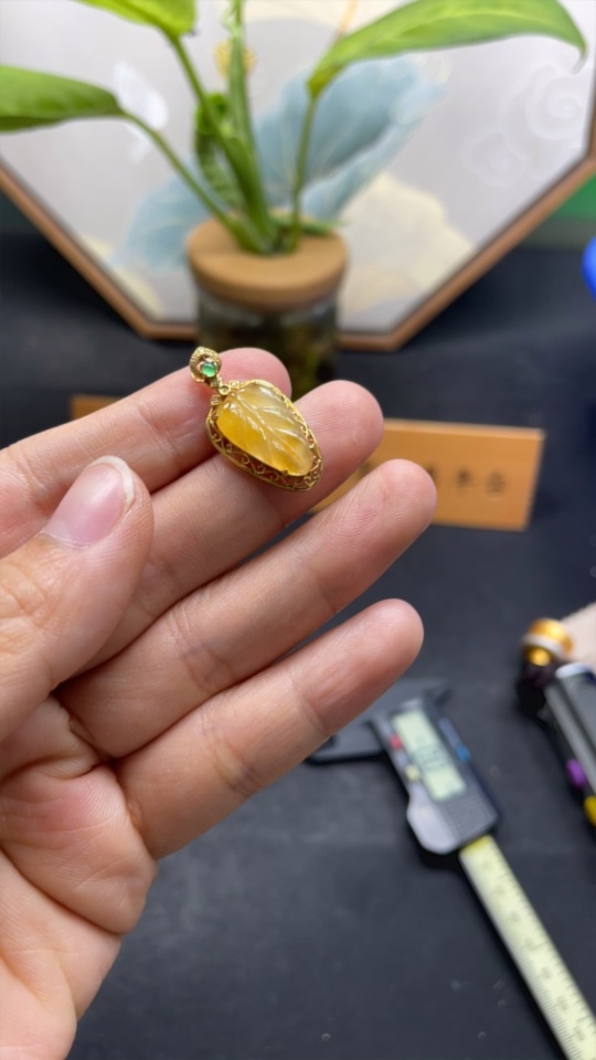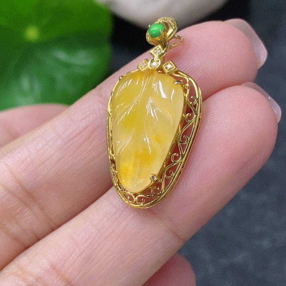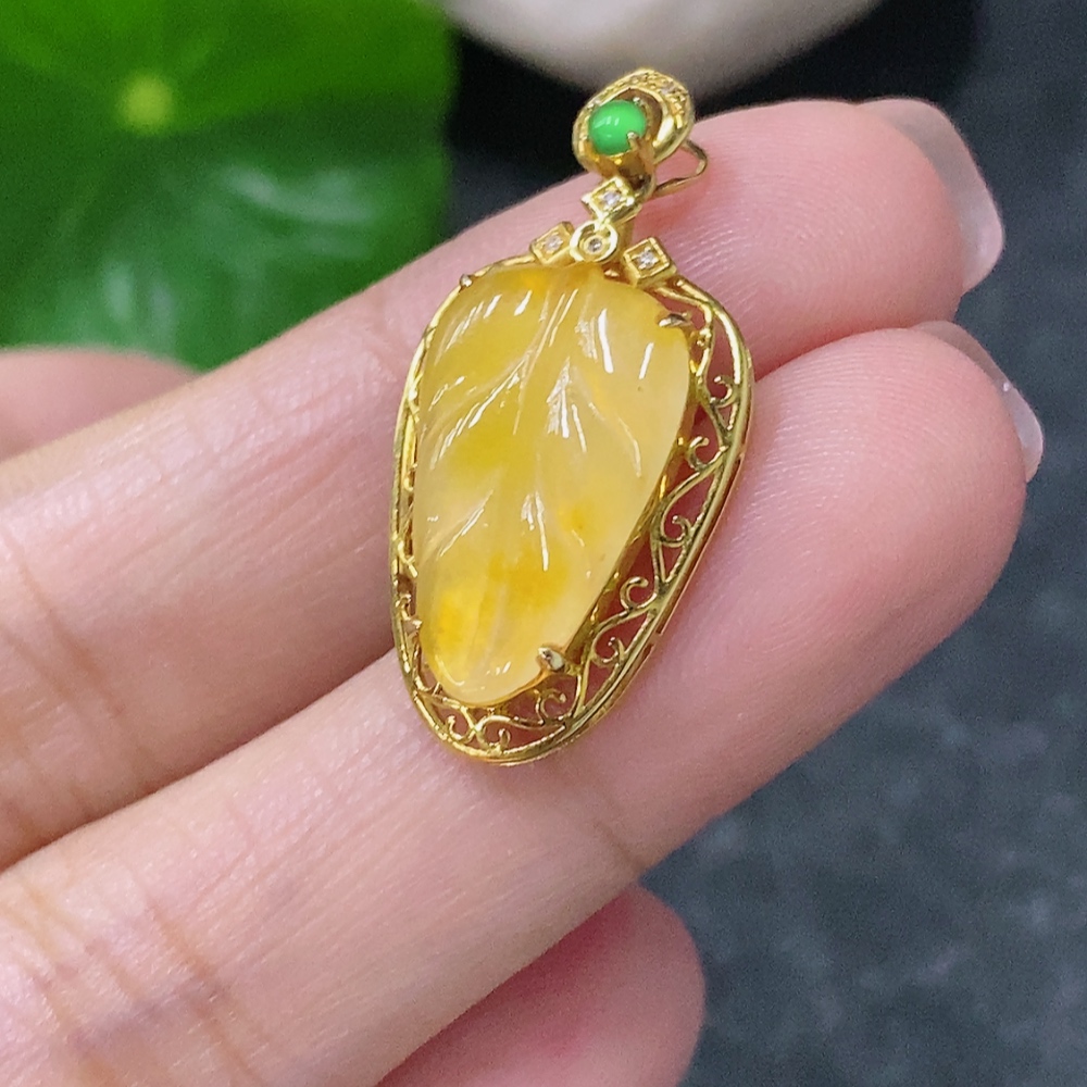 Jadeite inlaid leaf pendant with 18k gold and diamond accents, total product weight approximately 1.91g, color origin of yellow parts undetermined