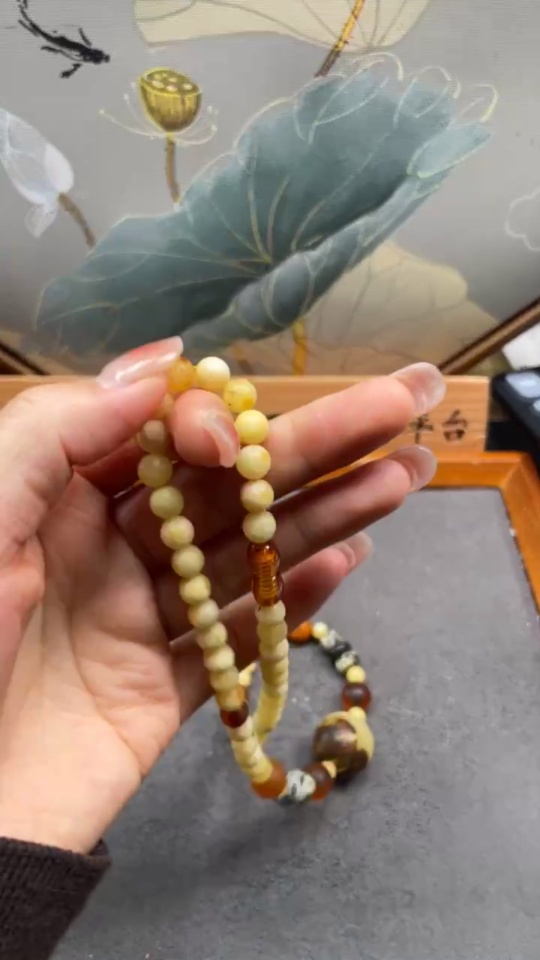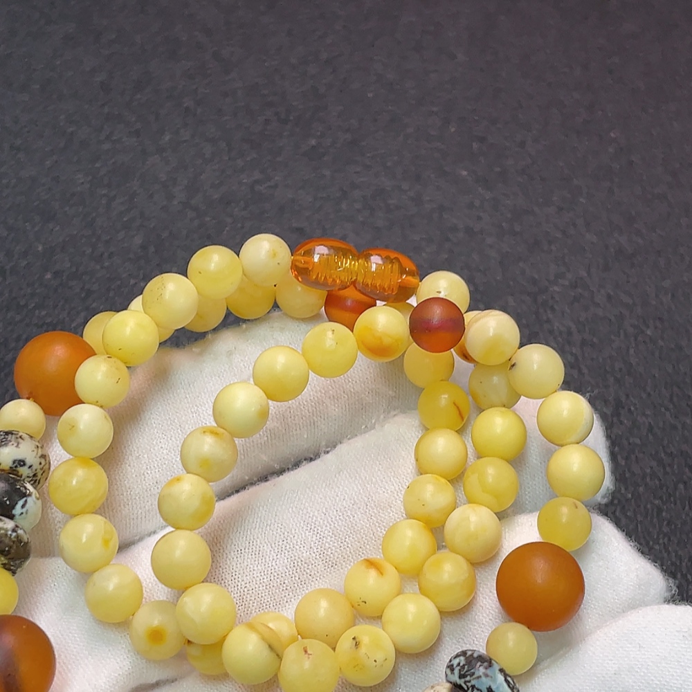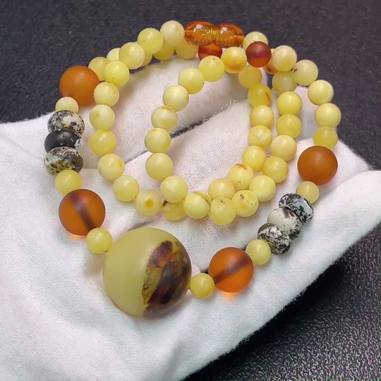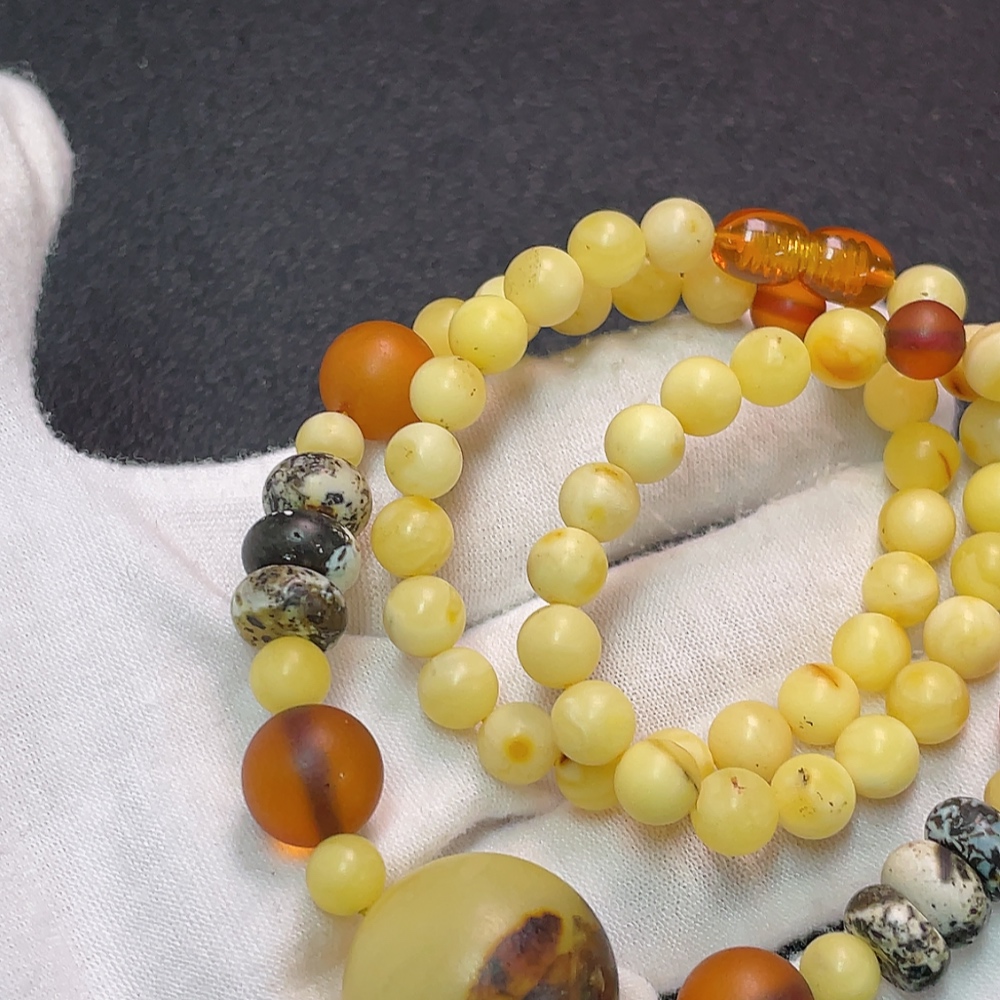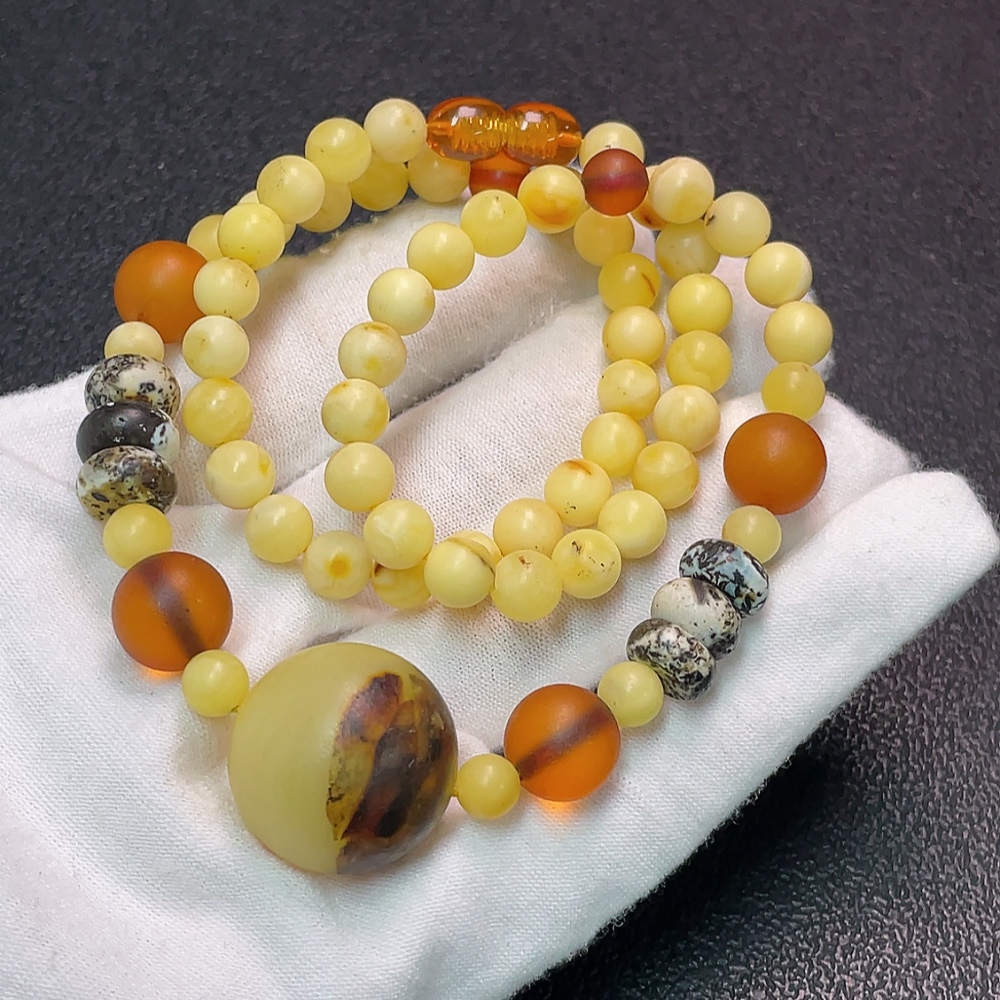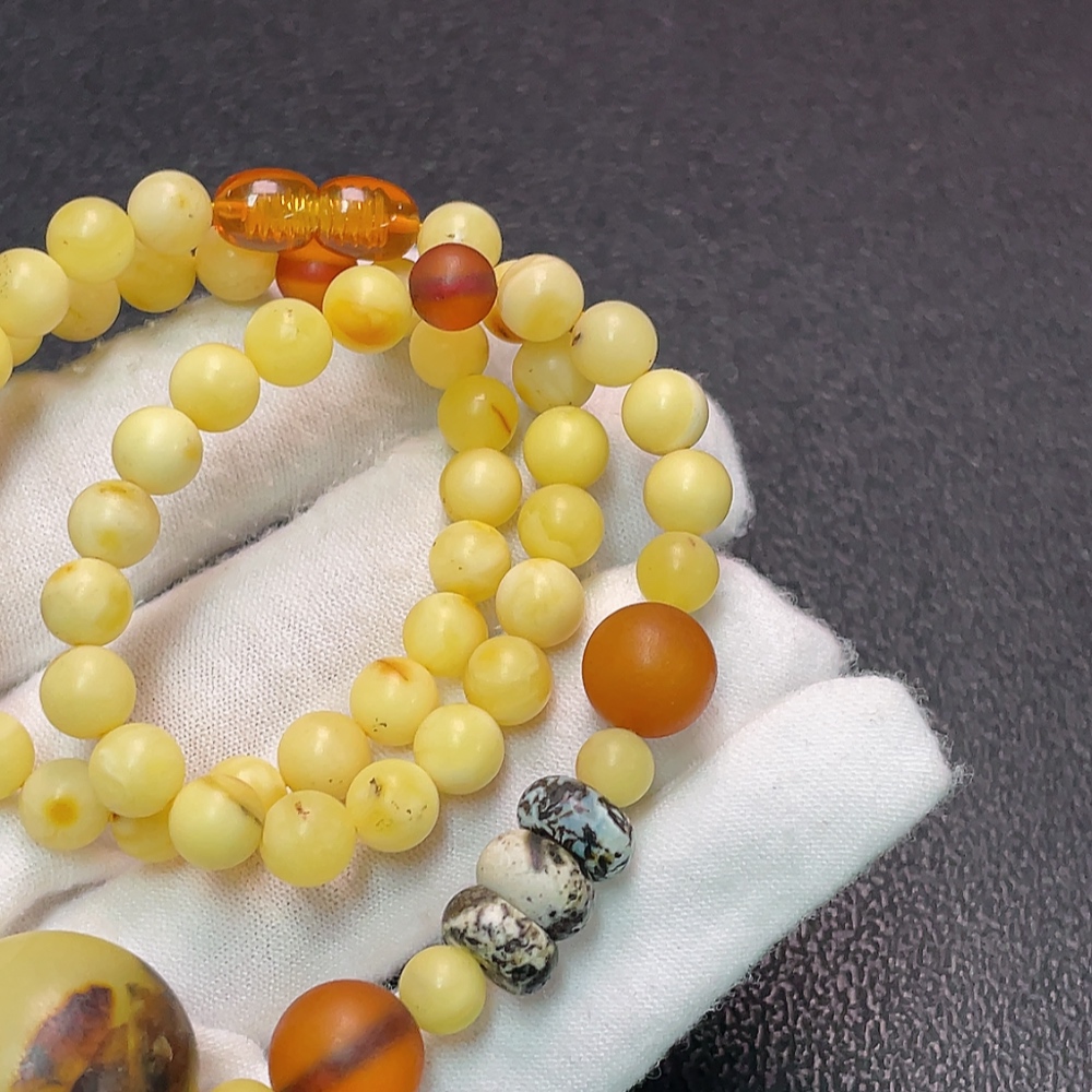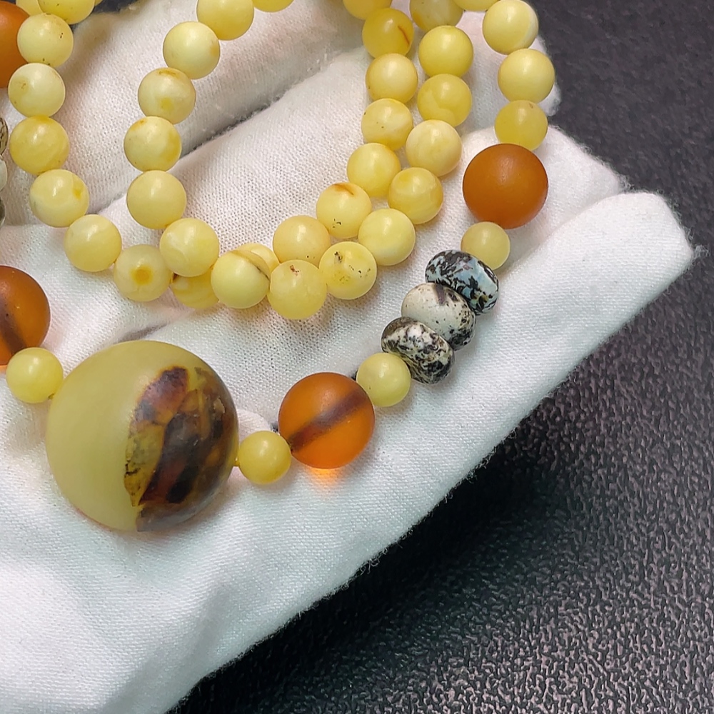 Amber and Beeswax Bead Strand with Visible Repairs in Some Areas, Large Accent Stones Possibly Non-Natural, Contains Other Mineral Components, Total Weight Approximately 19.49g, Size About 6.2-10.7mm